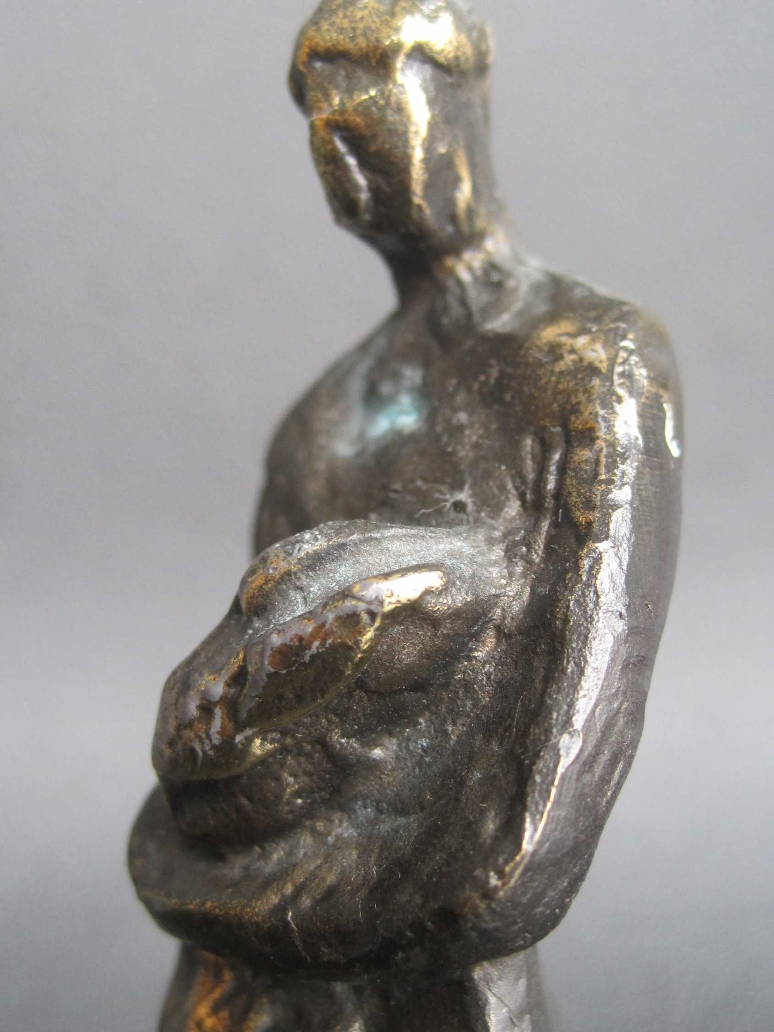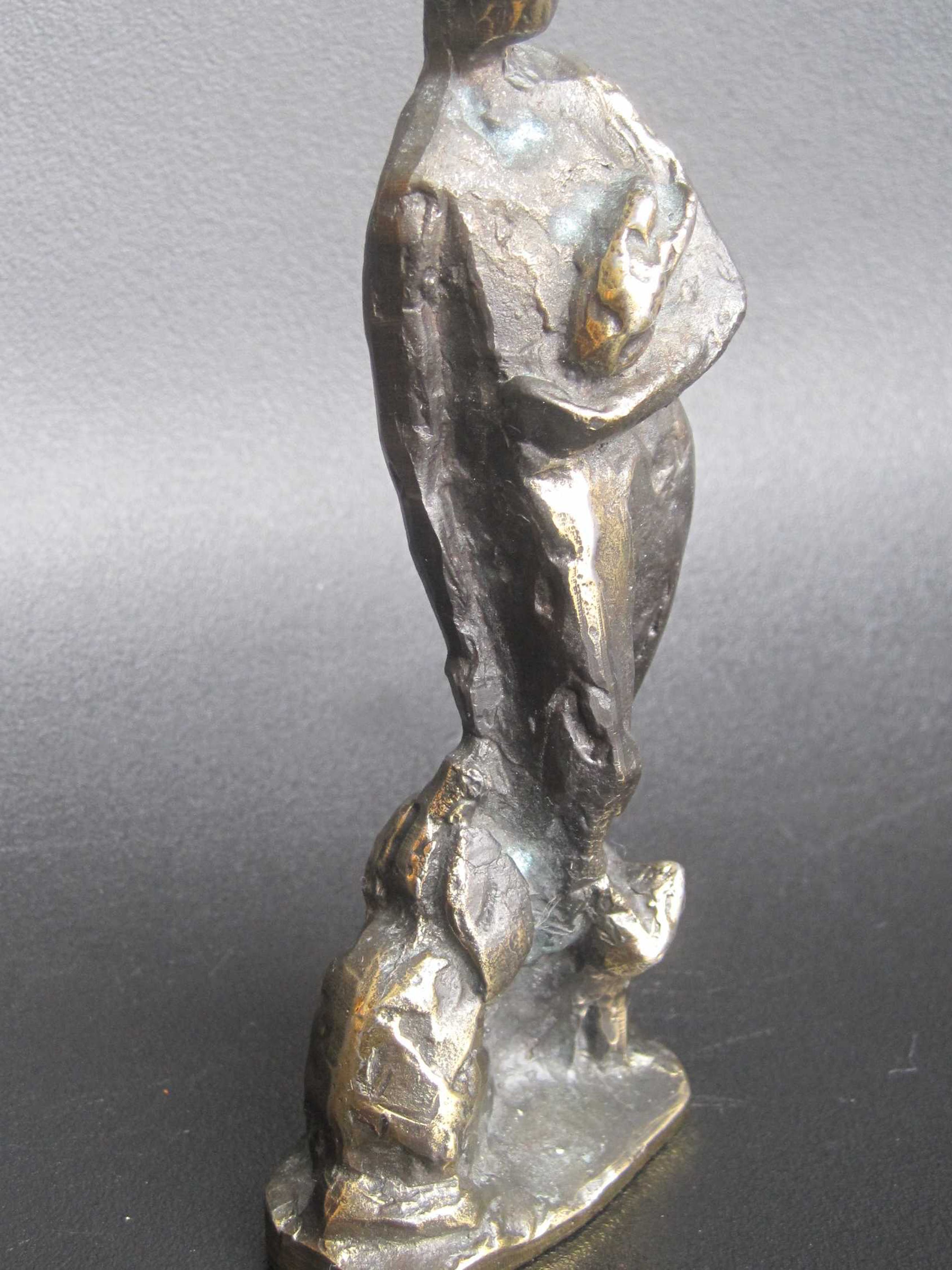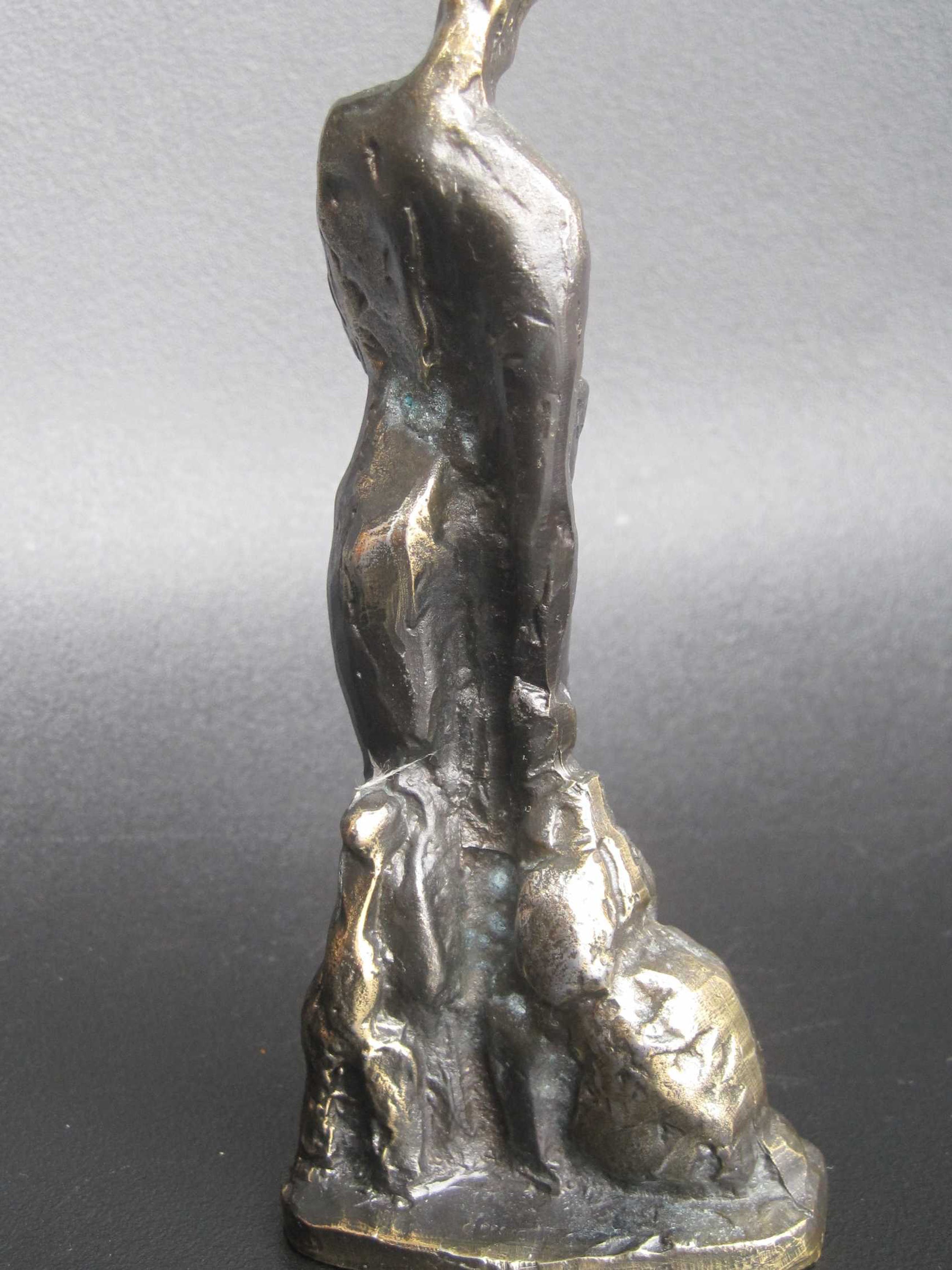 Een door een helaas onbekende getalenteerde kunstenaar gemaakt beeldje van brons.Een staande figuur met een konijn in de arm en een hond en kat aan de voet.Het beeldje is niet gesigneerd.Het beeldje verkeert in een heel goede staat.