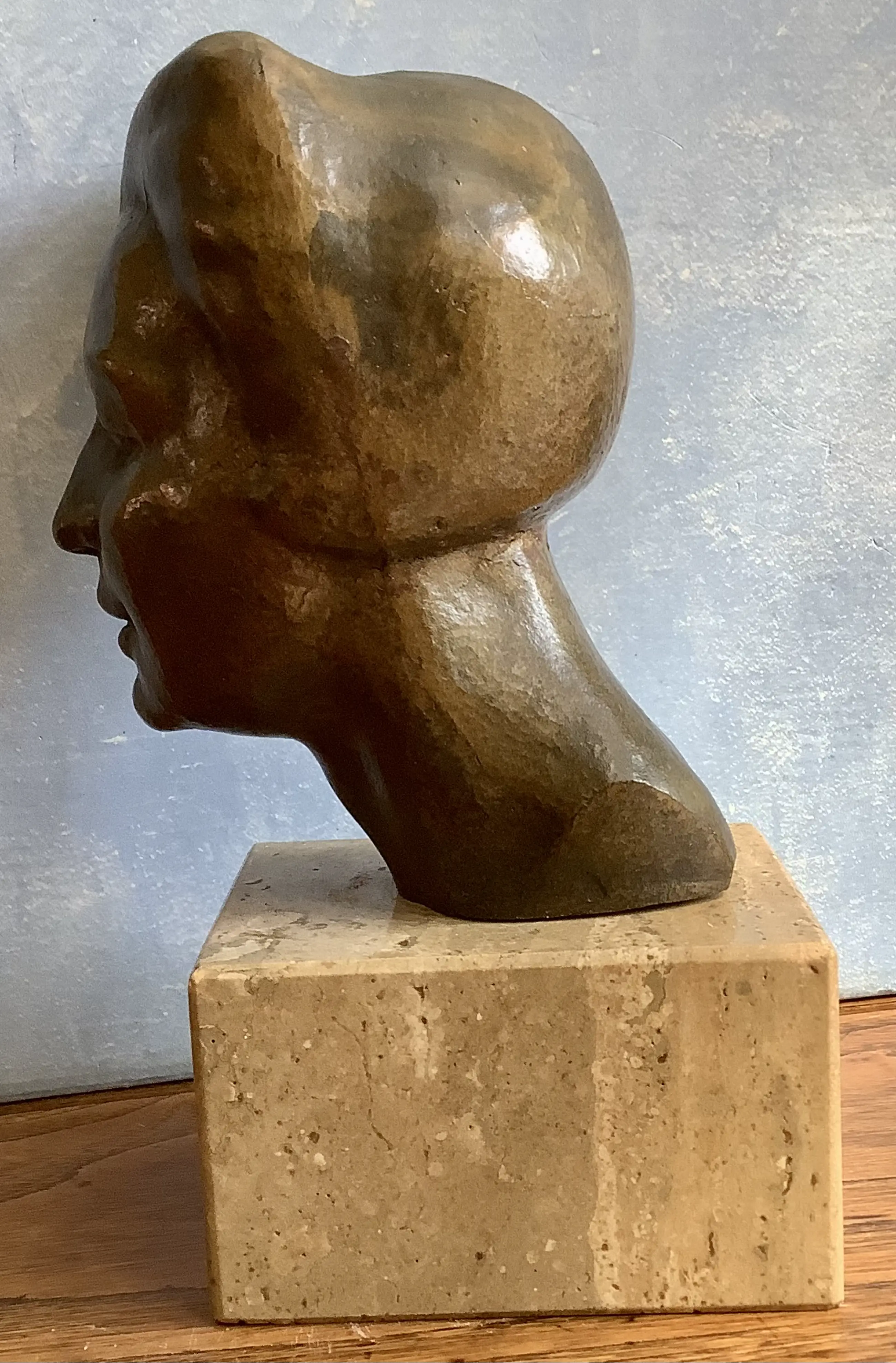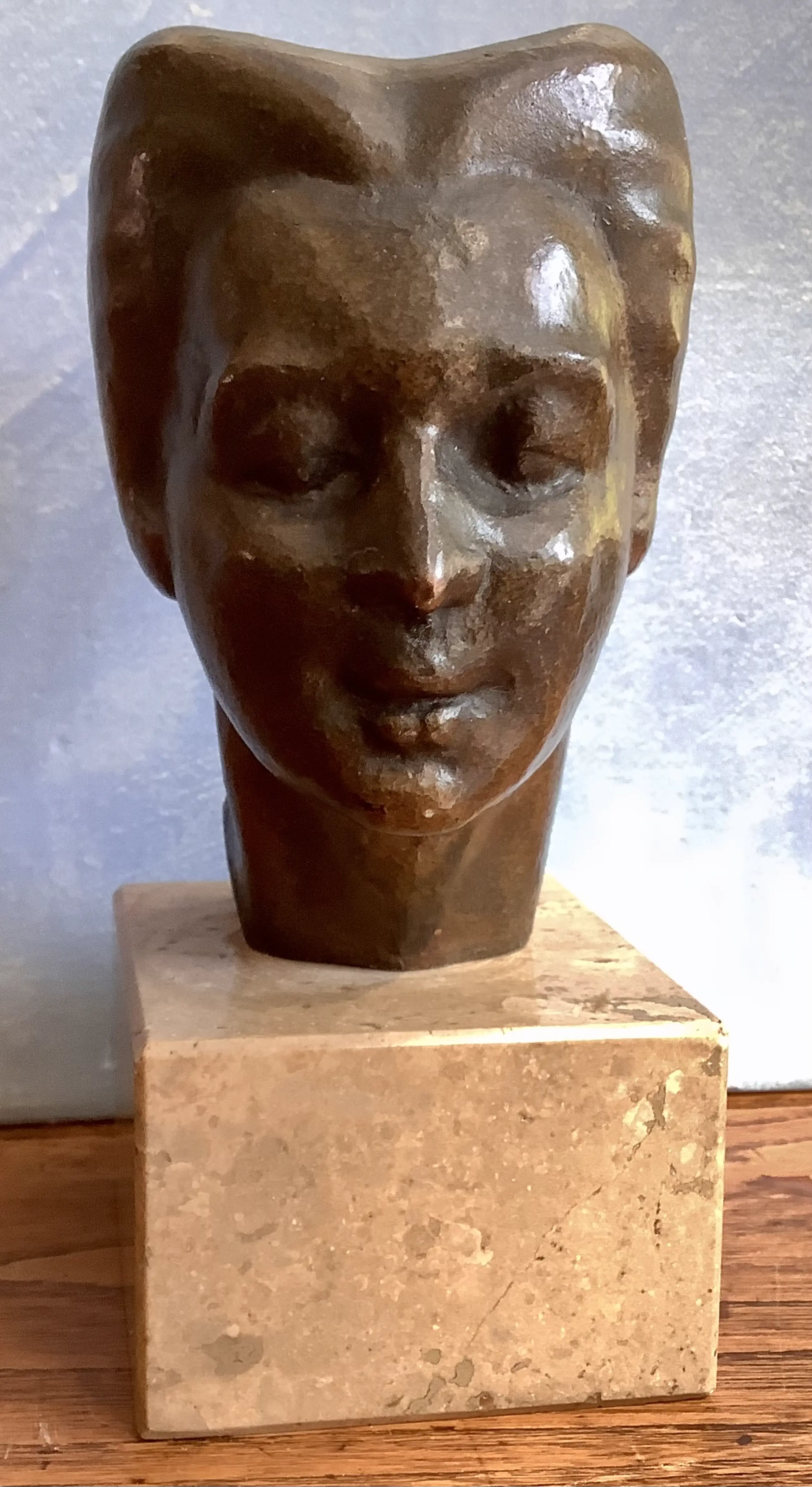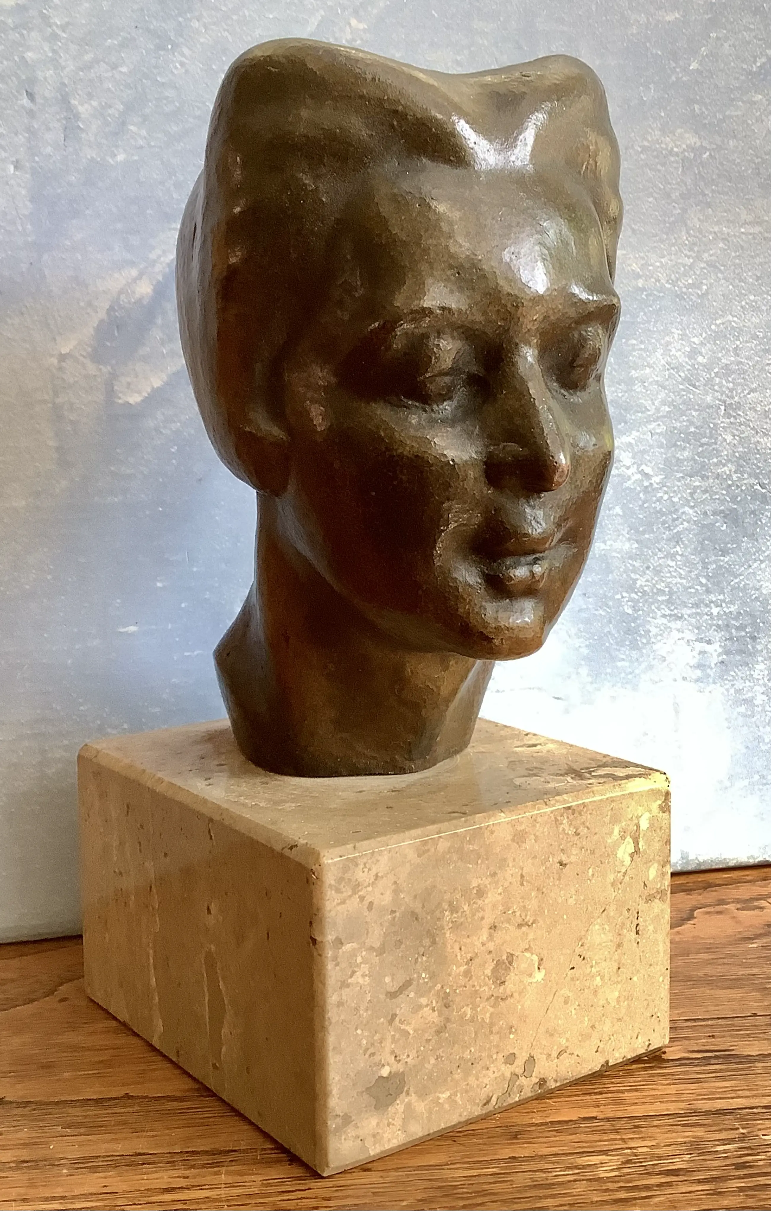 Fraai, vakkundig bronzen portret. Klein maar in de juiste verhoudingen. Aantrekkelijke kleurstelling met de beige natuurstenen basement.