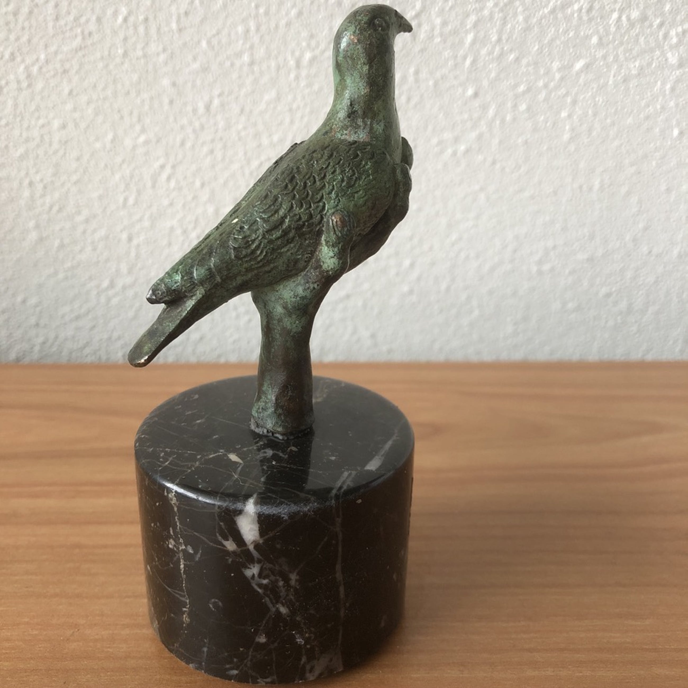 Het betreft een schitterend massief bronzen beeldje op ronde zwart marmeren sokkel.