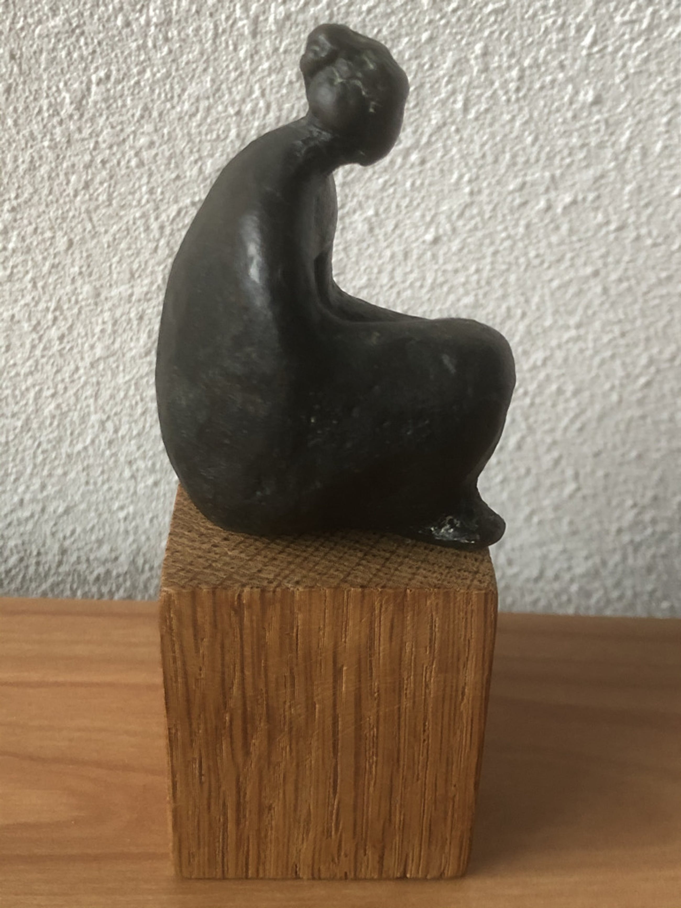 Het betreft een zeer mooi zwaar massief beeldje op een houten sokkel. Het geheel is 13,5 cm hoog.
