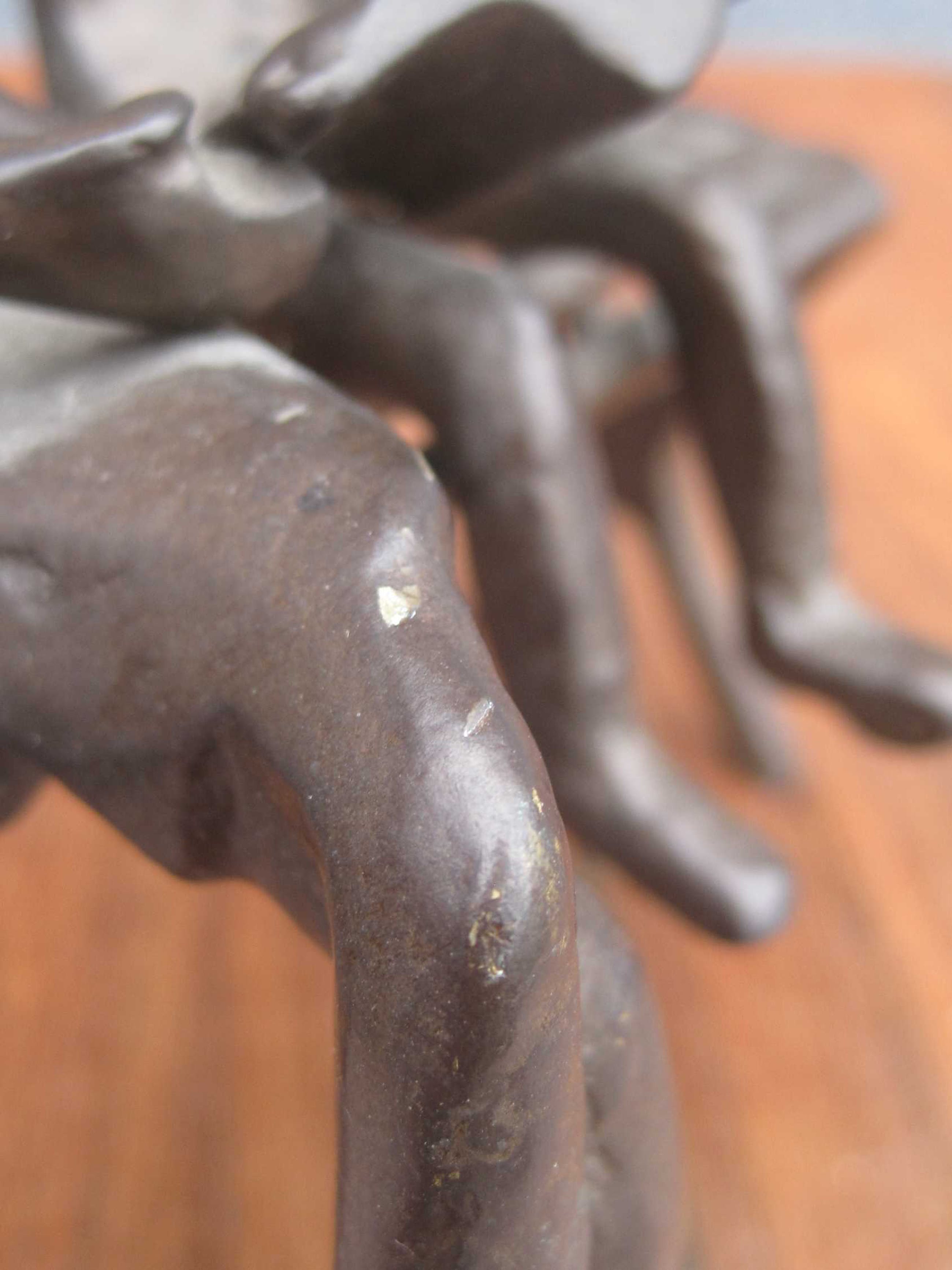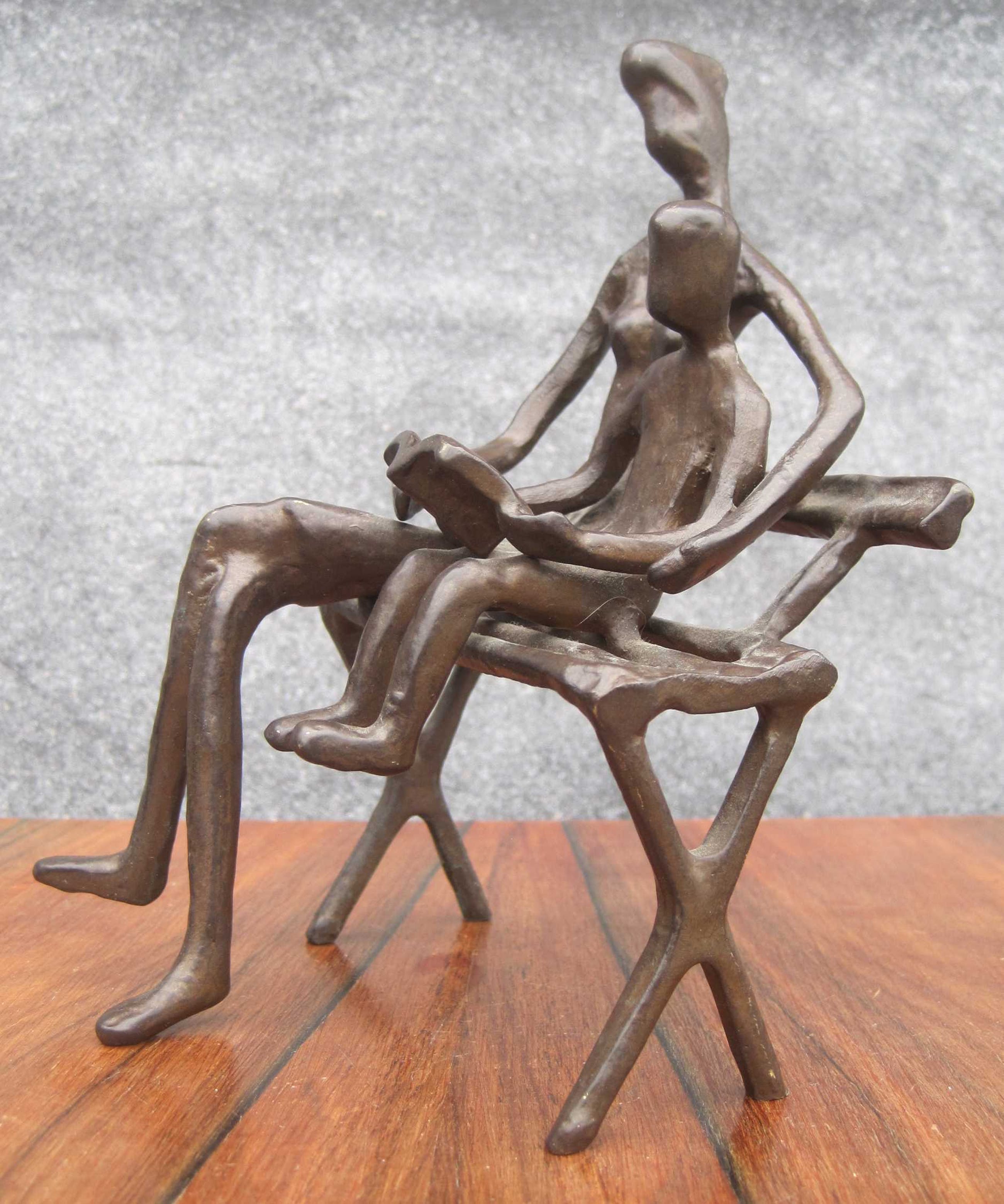 Gepatineerd bronzen tafereel van een moeder met haar lezende kind. Lichte gebruikssporen.