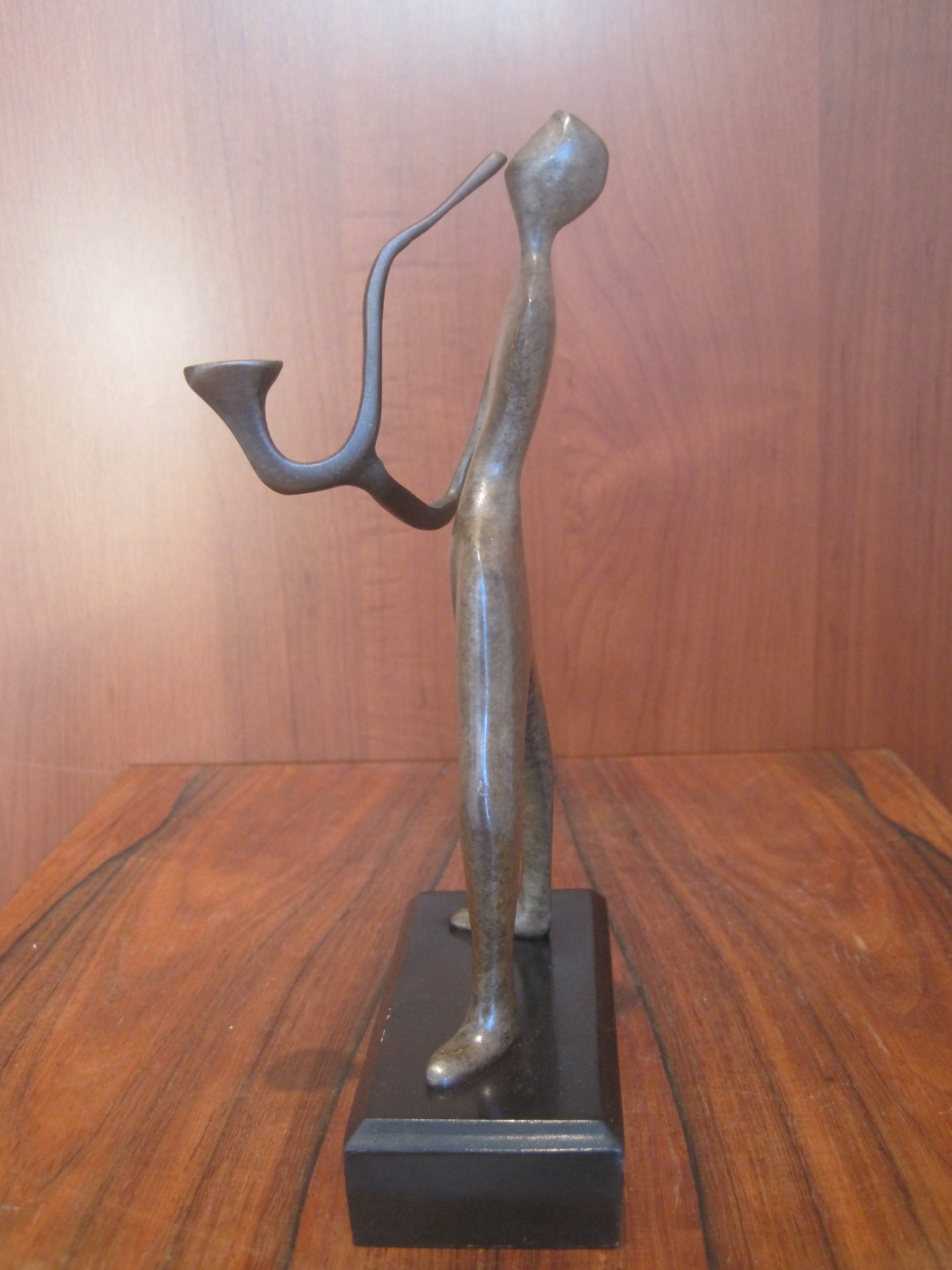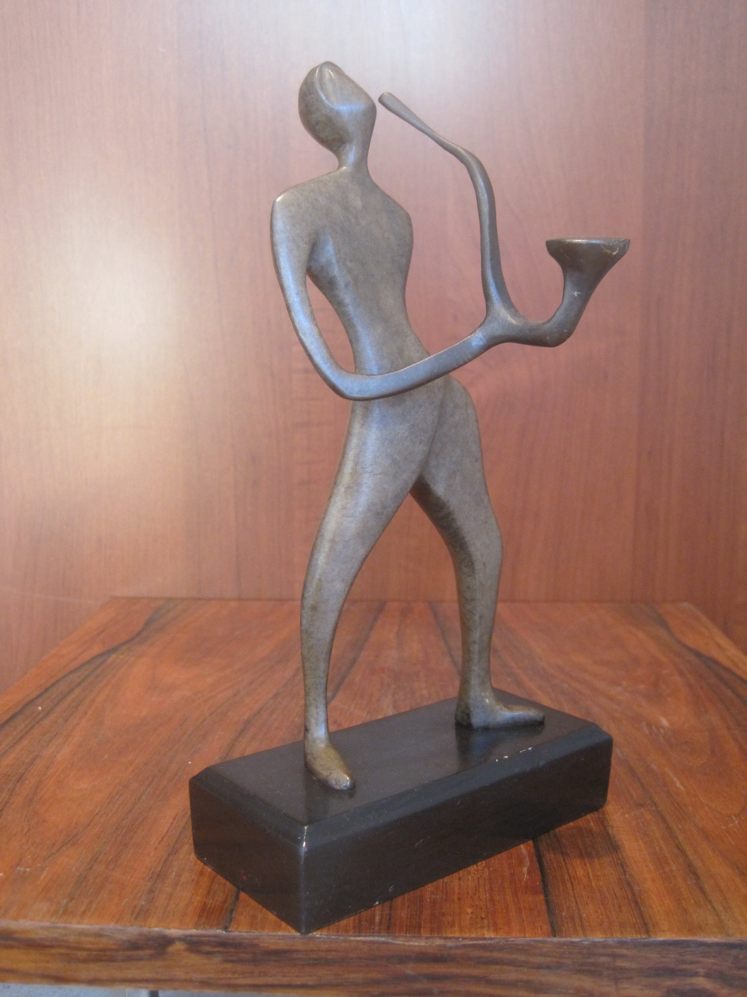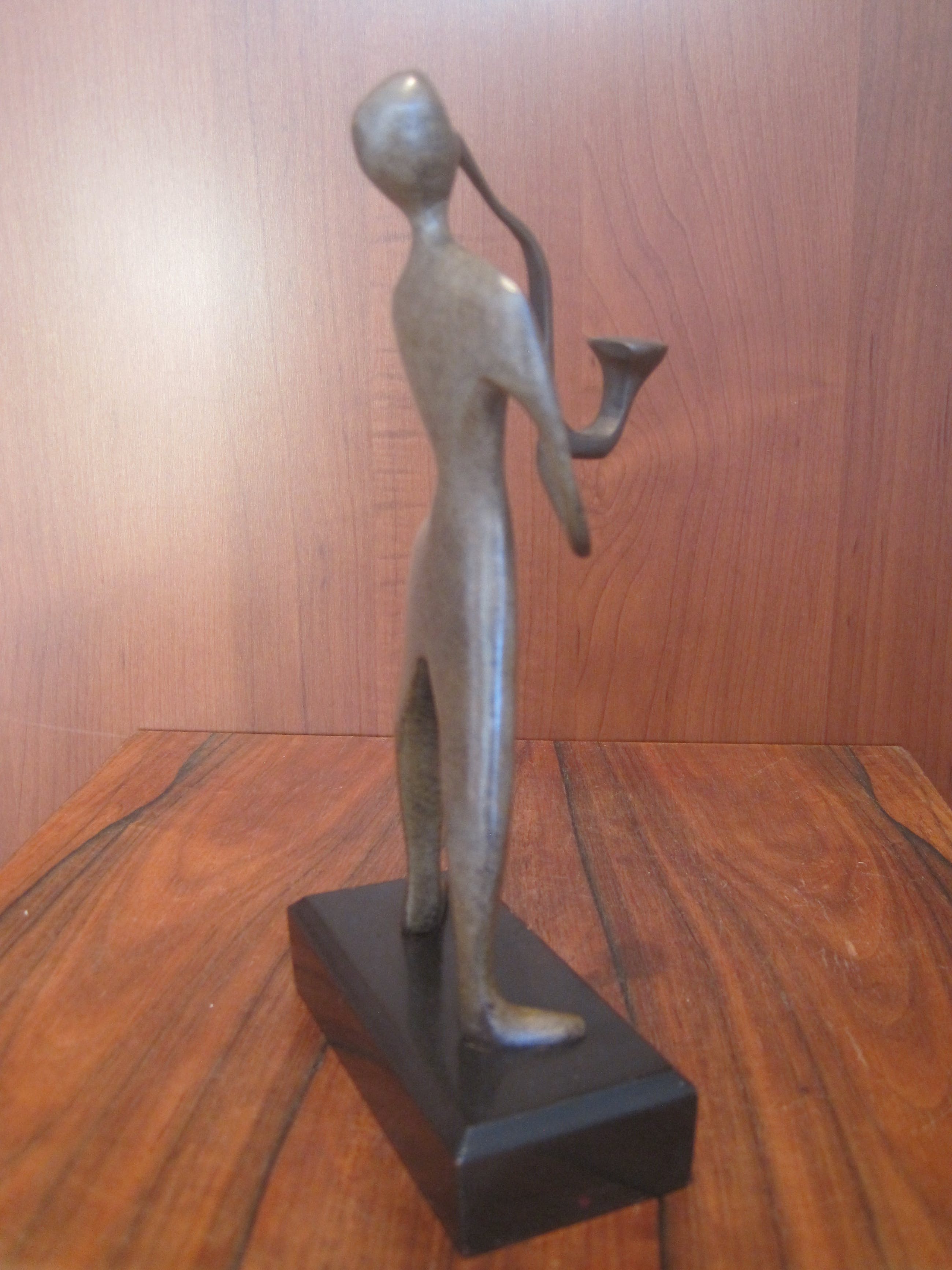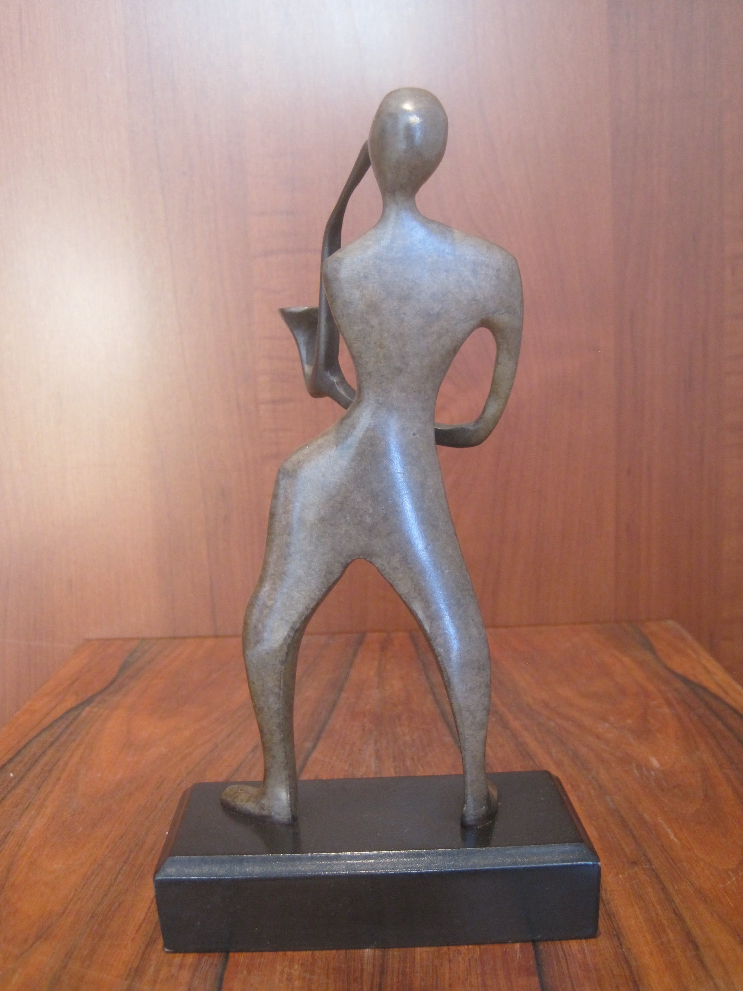 Strak abstract bronzen beeldje van een muzikant, in dit geval een saxofonist. Het beeldje is heel fraai gepatineerd en staat op een houten sokkel. De afmetingen zijn zonder de sokkel.