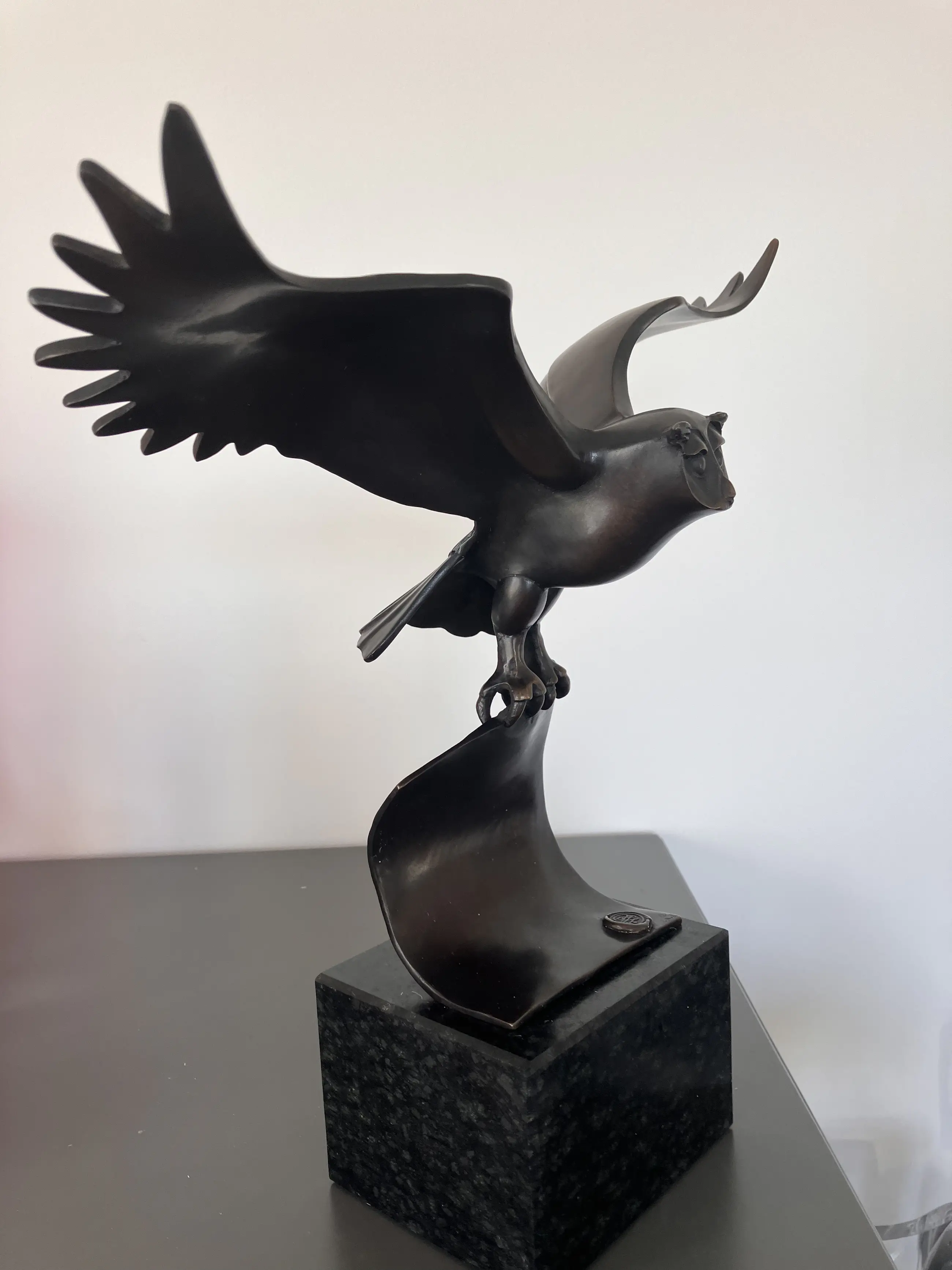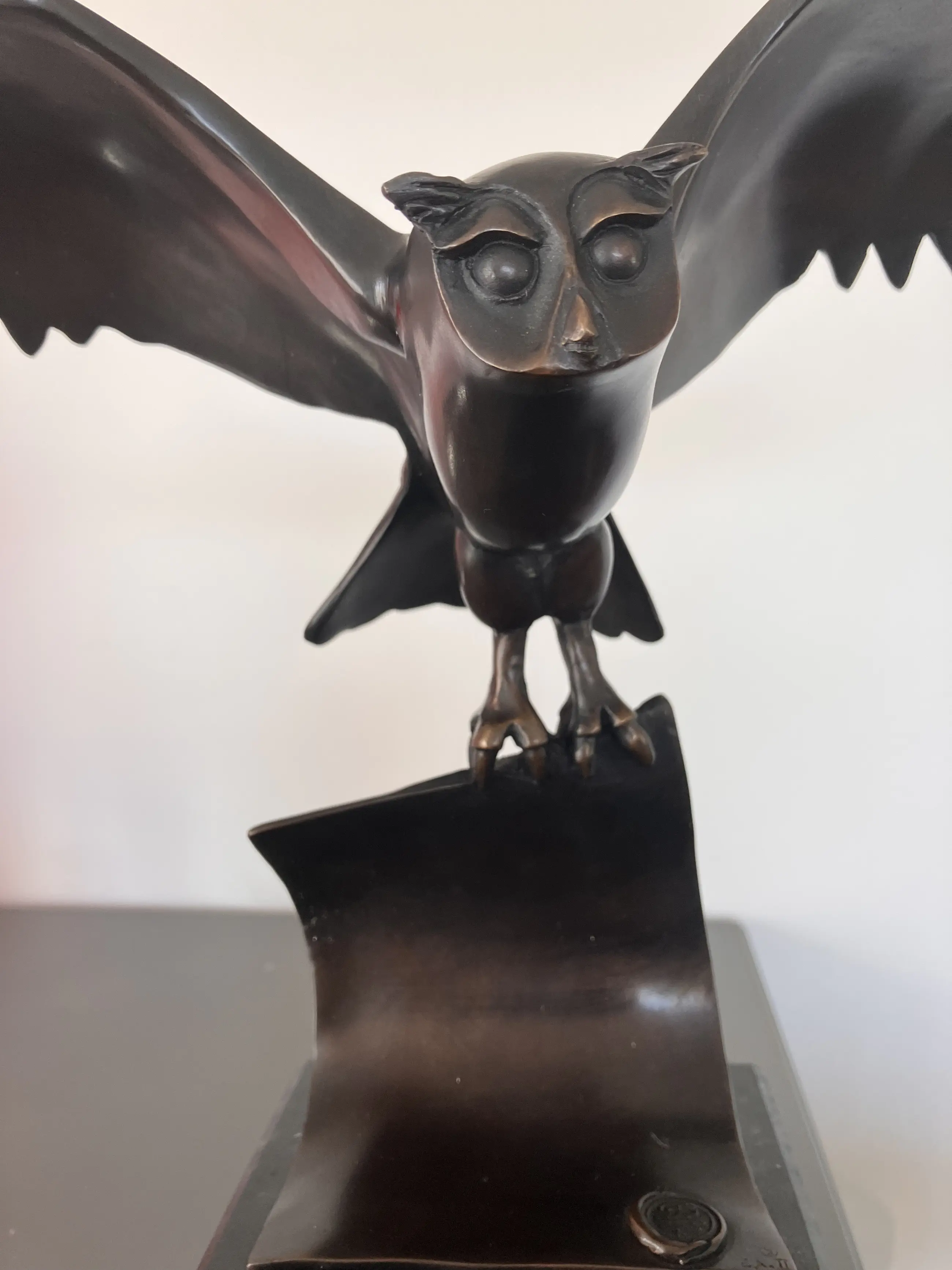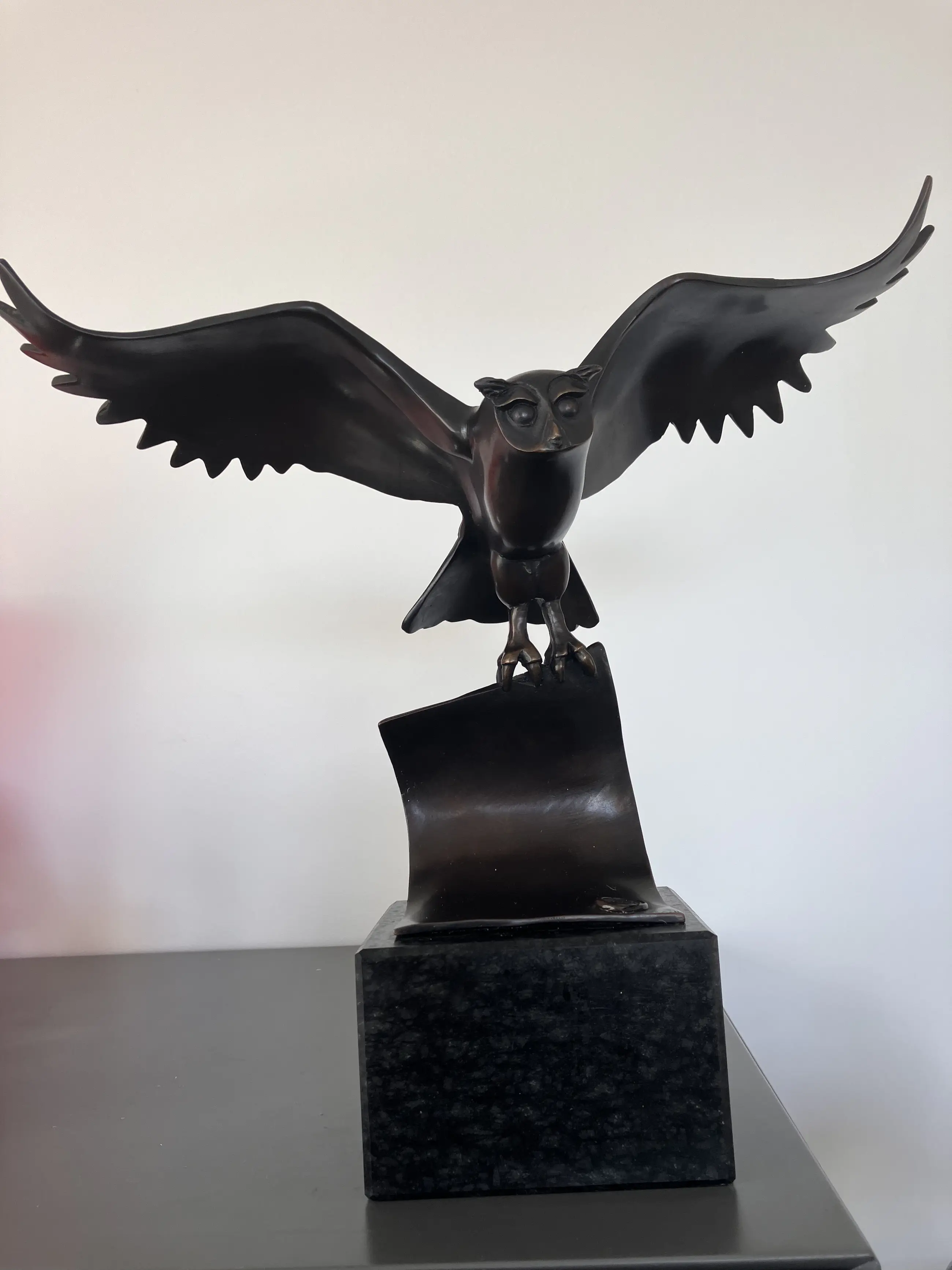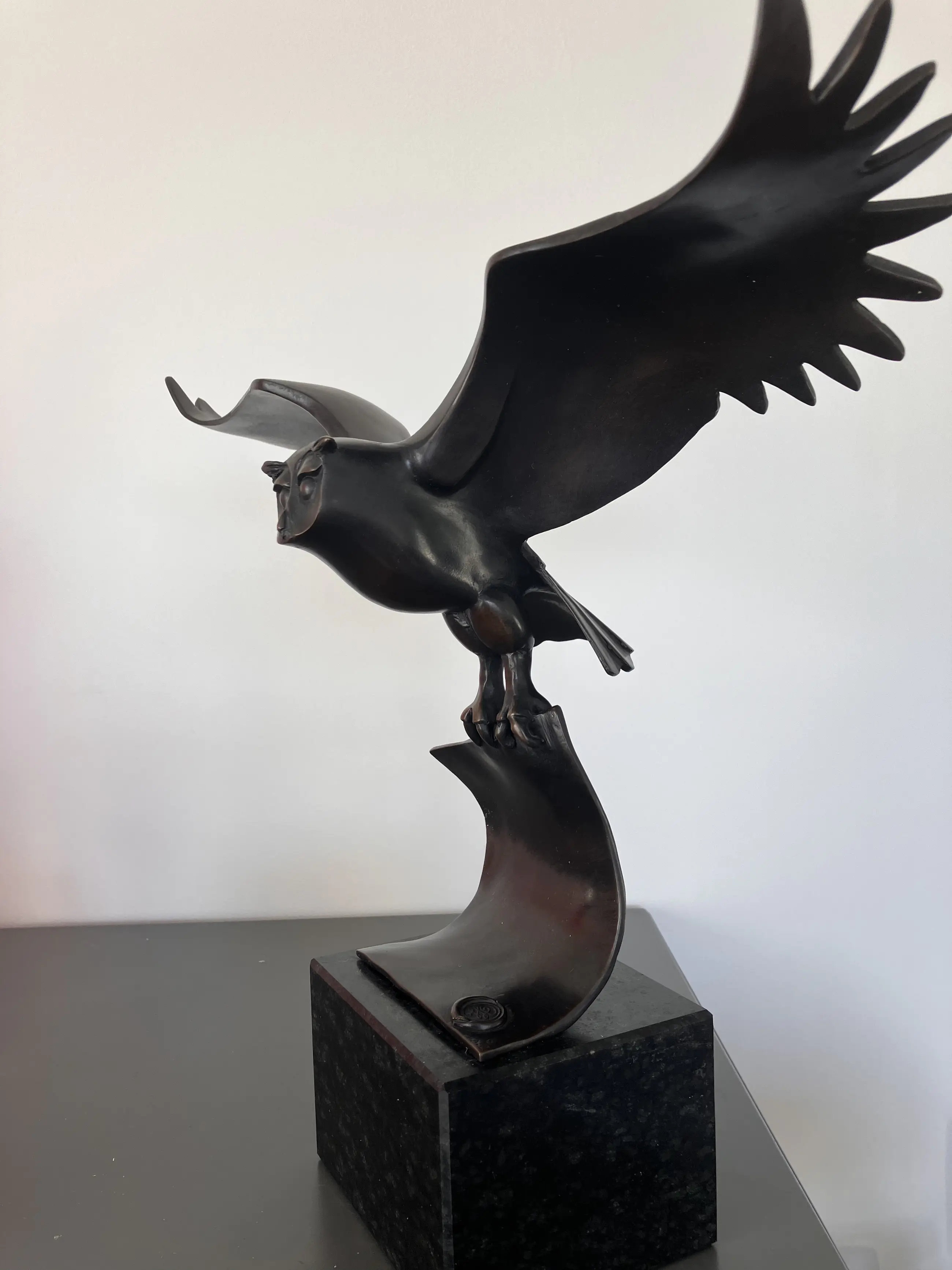 Uil met gespreide vleugels op natuurstenen sokkel Met voor mij onbekend bronsmerk en de initialen E.A. II