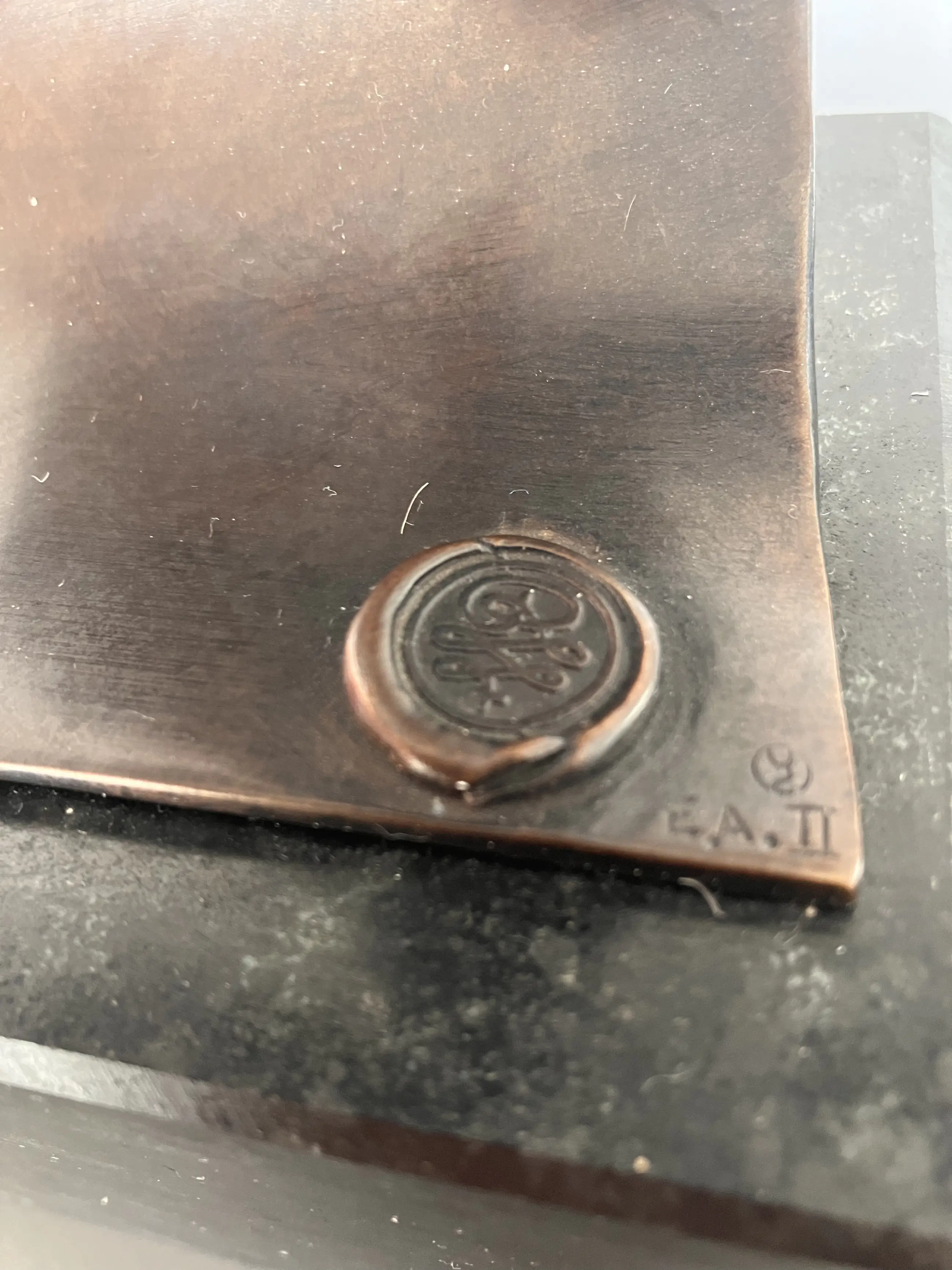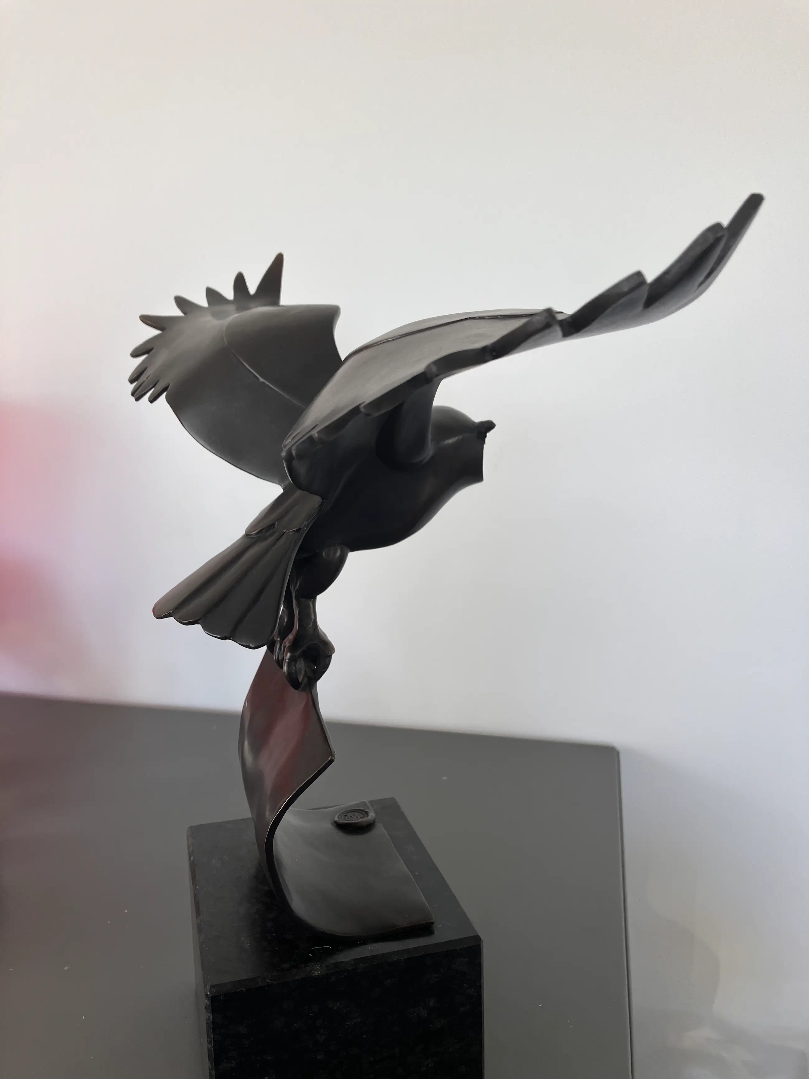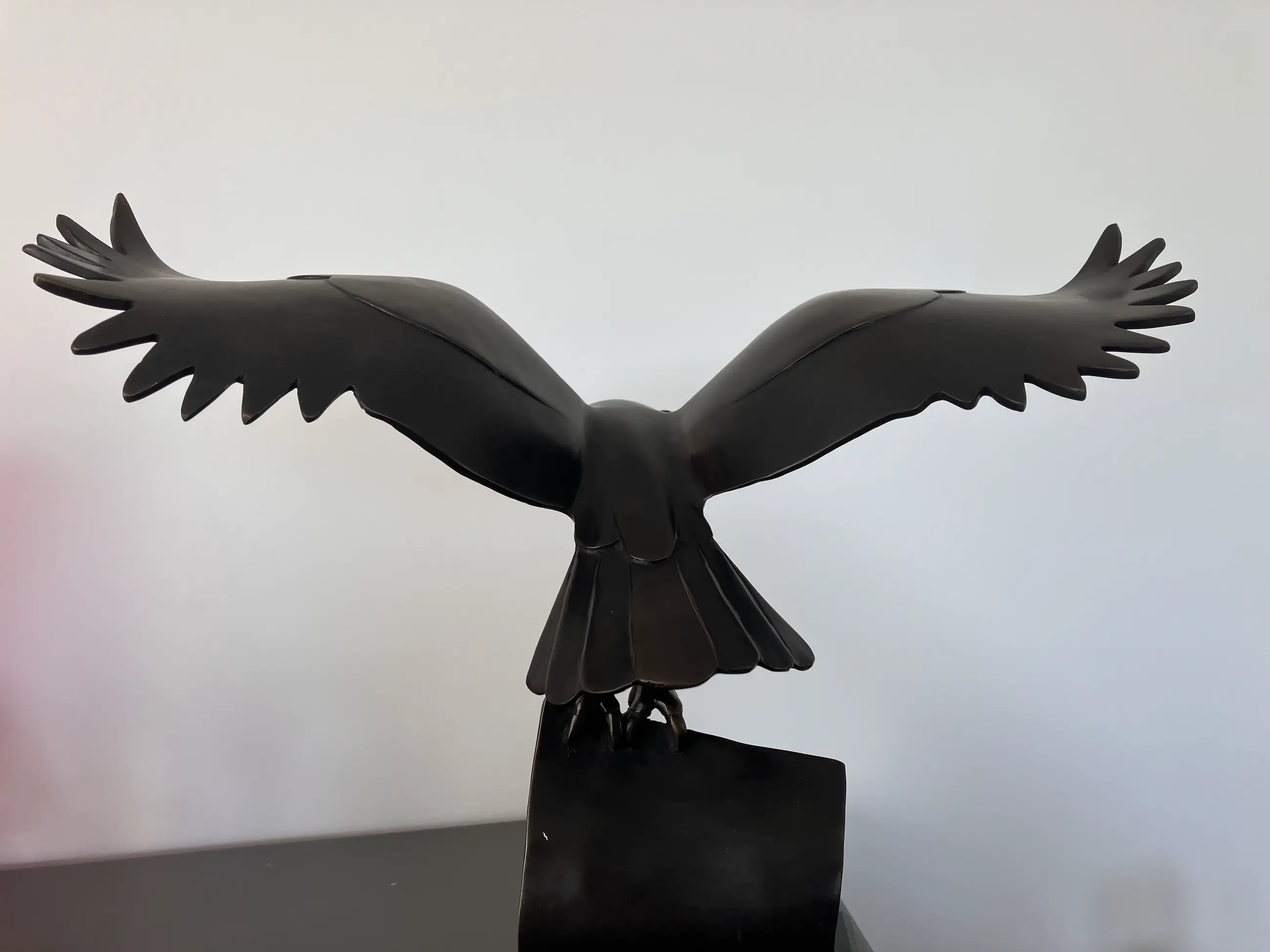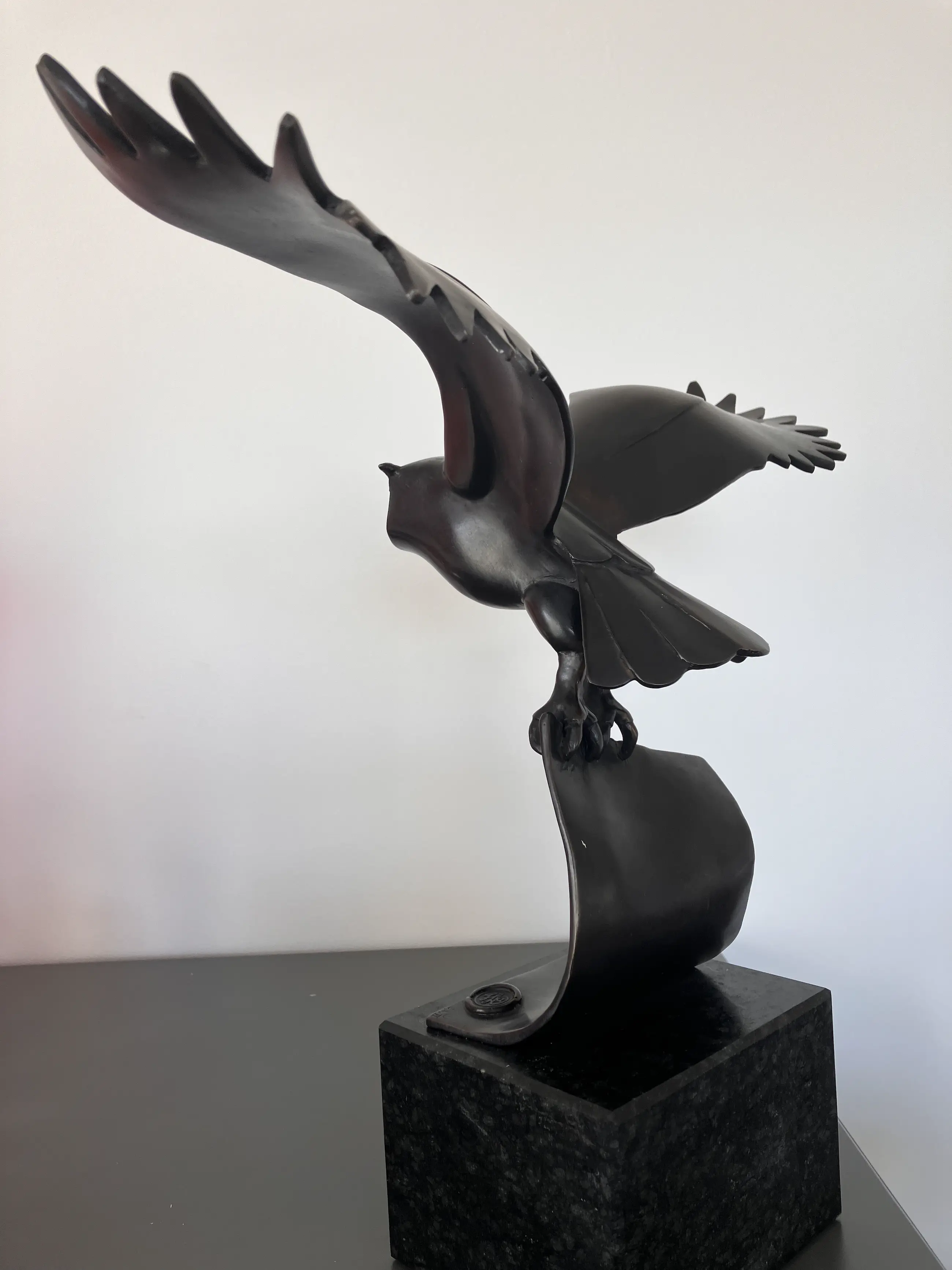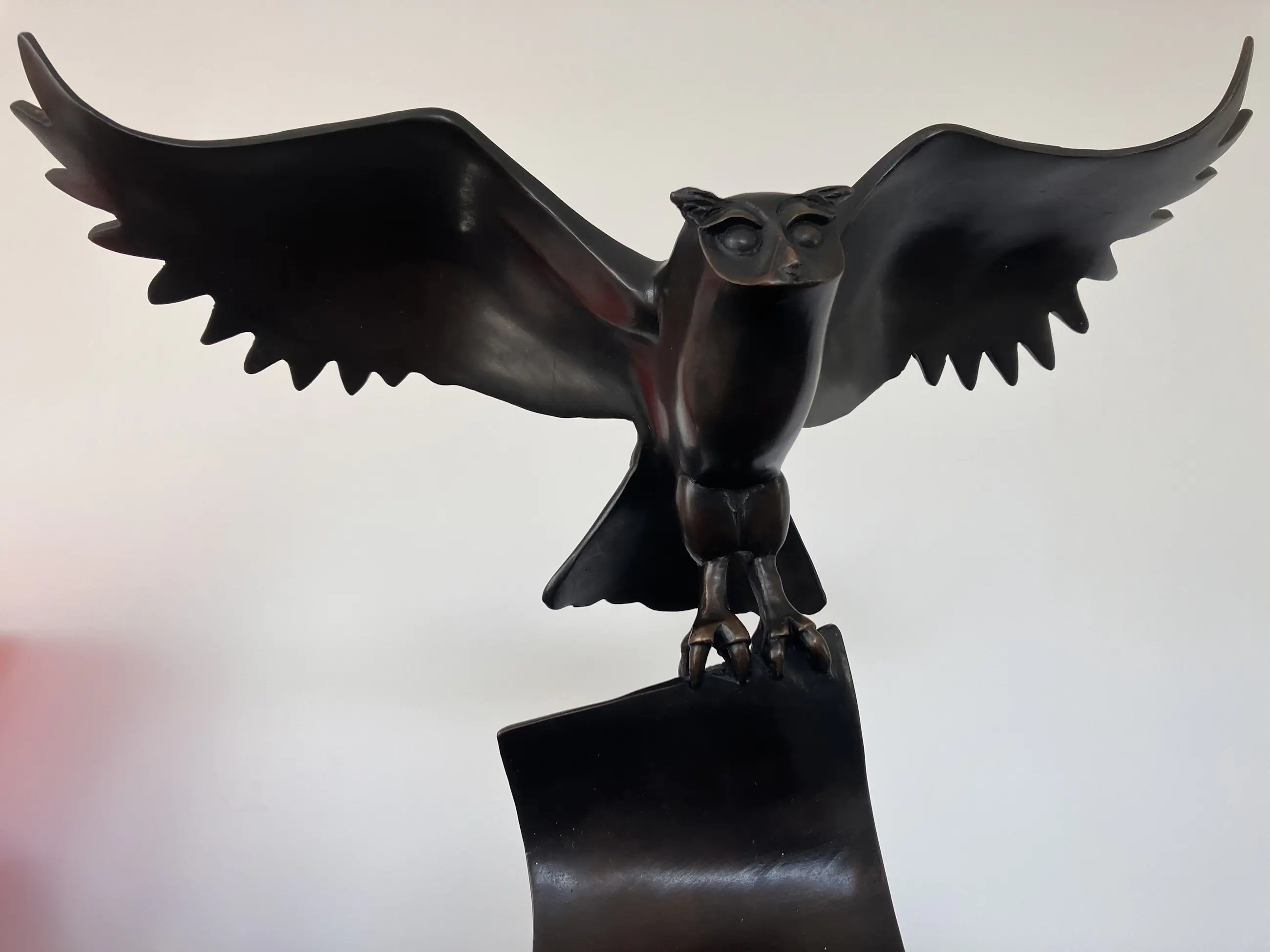 Uil met gespreide vleugels op natuurstenen sokkel Met voor mij onbekend bronsmerk en de initialen E.A. II