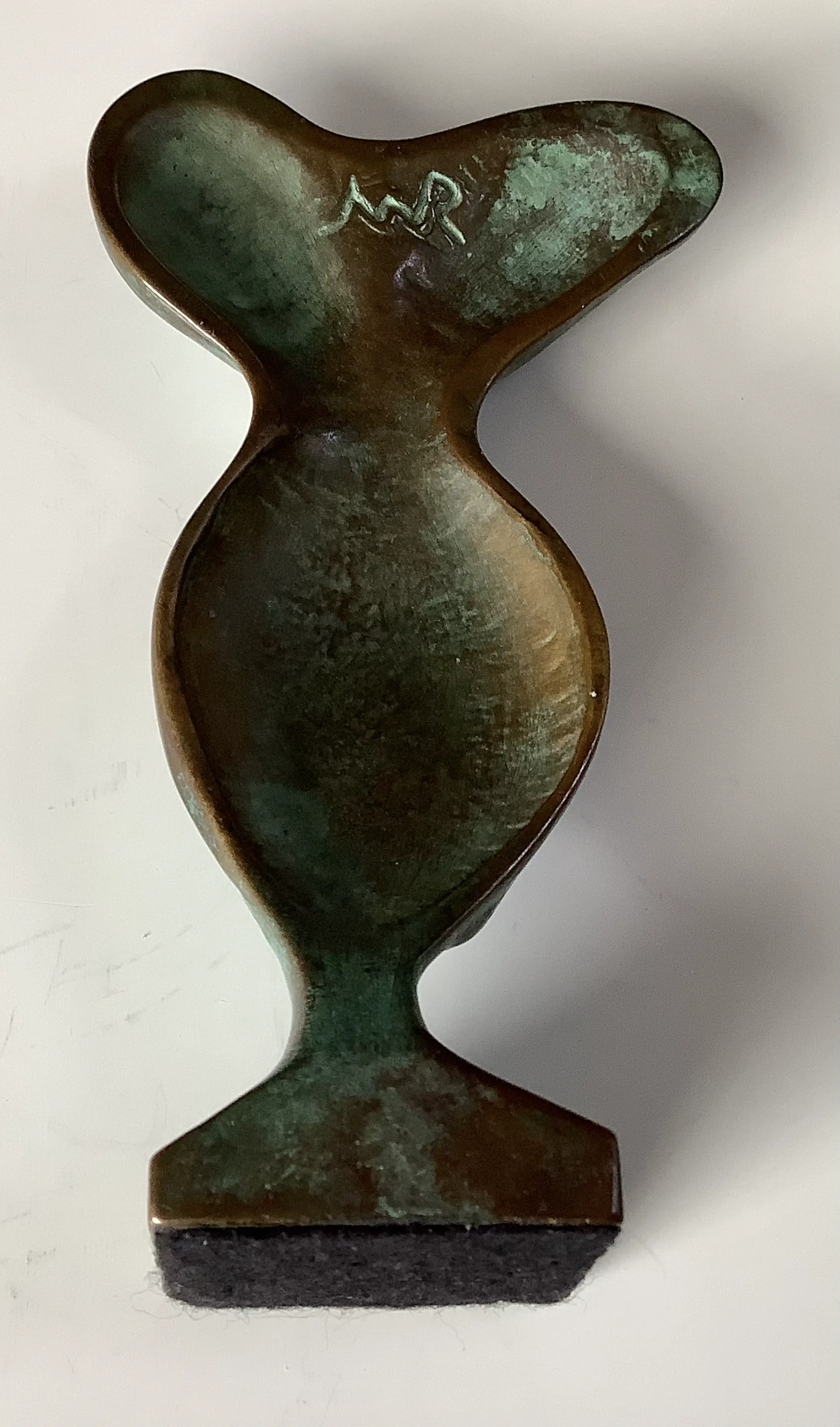 Tors vrouw, uit schelpachtige elementen opgebouwd. Fraai gietsel met mooie patina. Intrigerend en aantrekkelijk beeld. Gesigneerd met monogram, mij niet bekend.