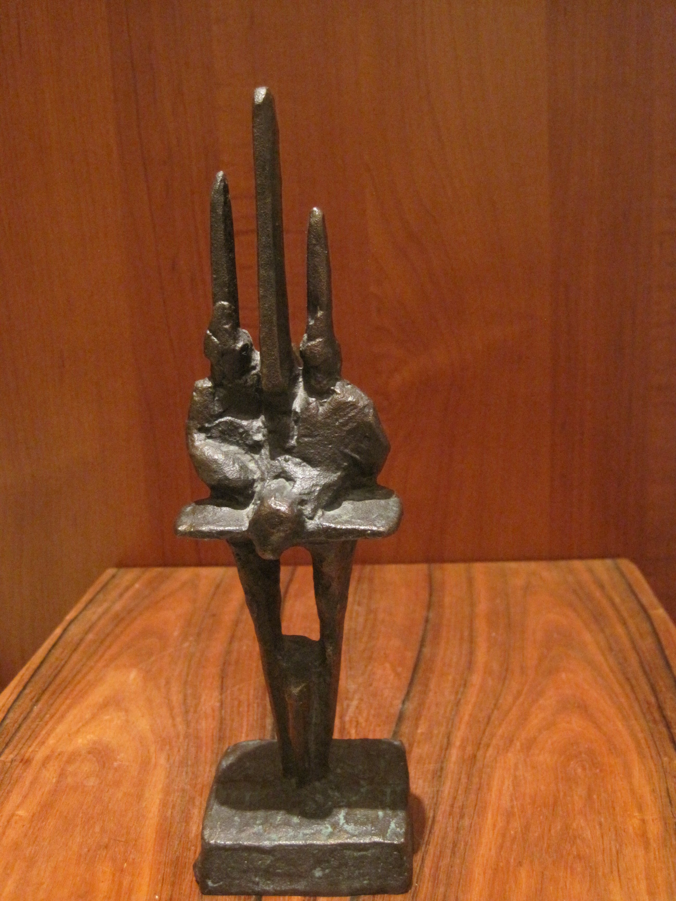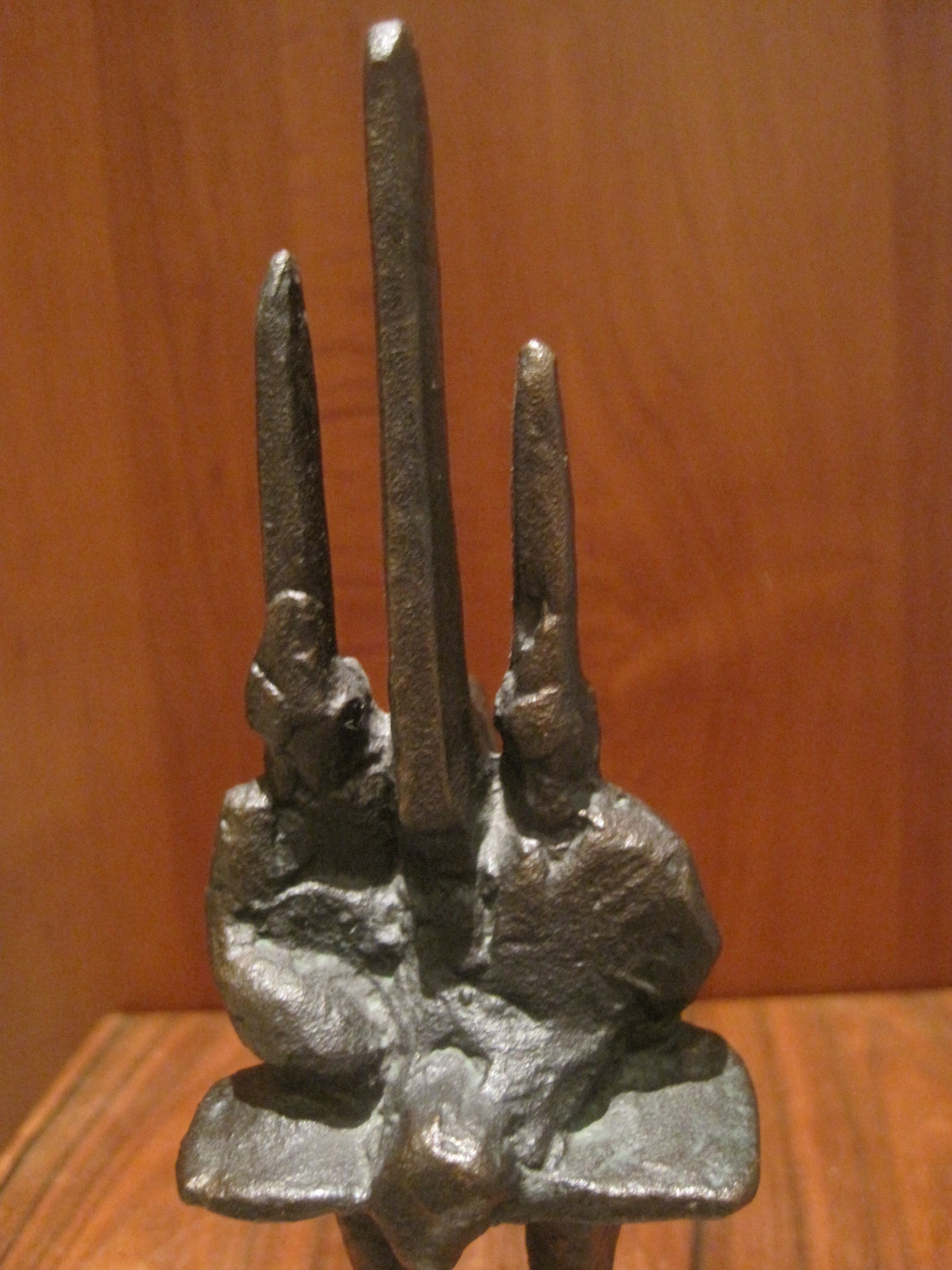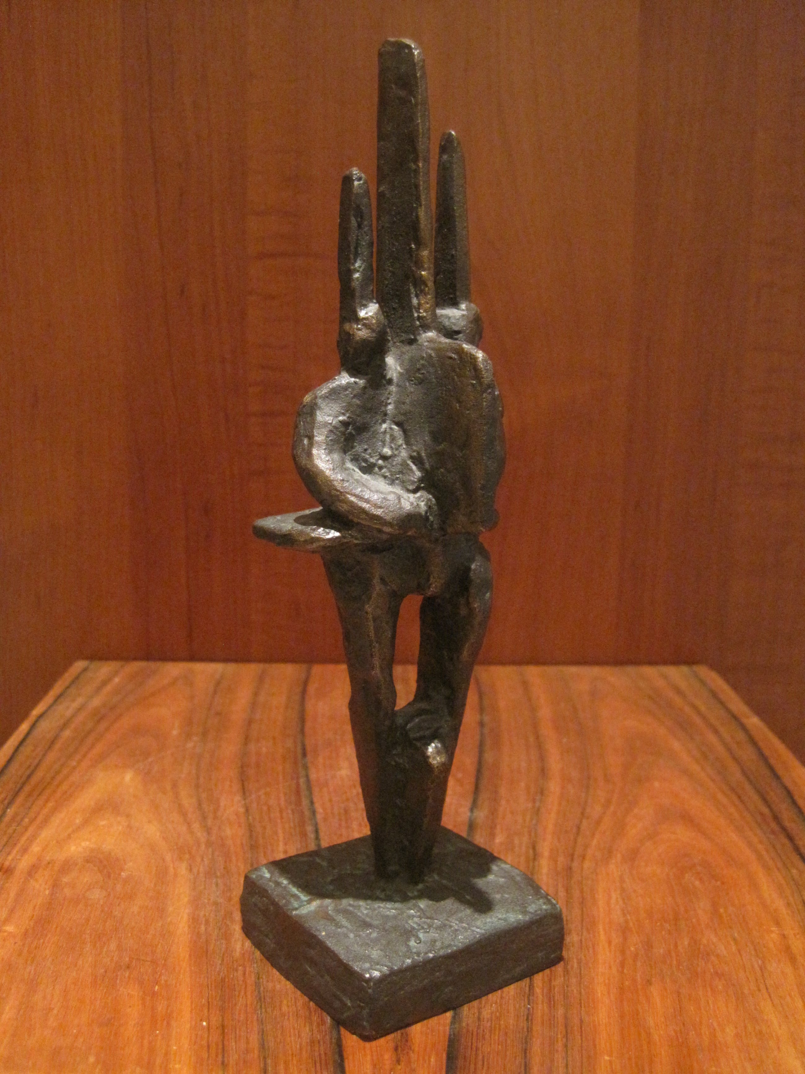 Heel zwaar massief abstract bronzen beeldje. Er zijn twee mensachtige figuren in te herkennen, samen lijken ze twee benen te hebben. Dit beeld is op de zijkant van de sokkel gesigneerd JU naar mijn mening. Op de onderkant Romeinse 1, 13 en 100. Wie weet wie de kunstenaar is, mag mij mailen.
