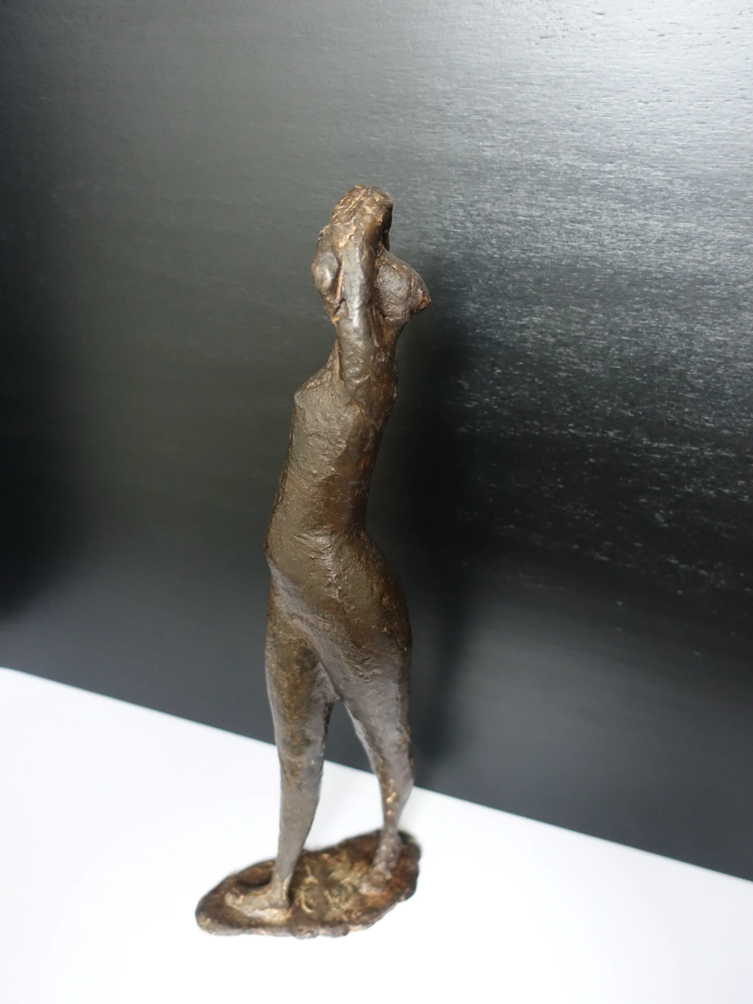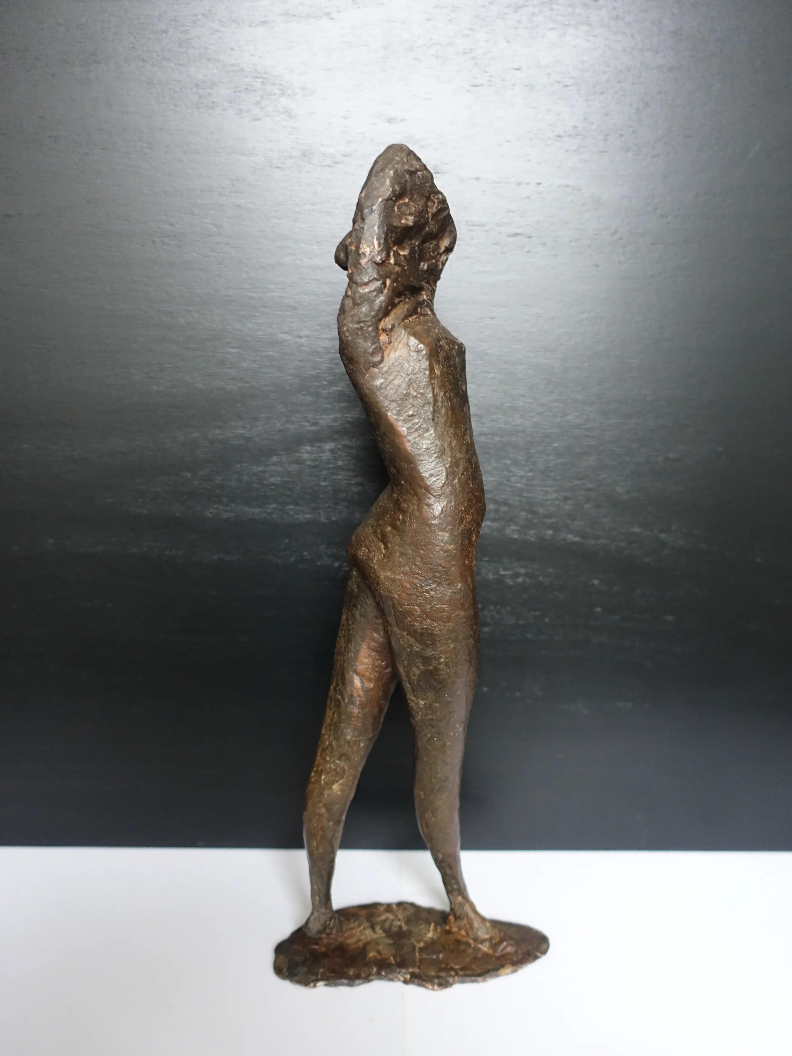 Zeer fraai gestileerd beeldje van zich ontkledende vrouw. Ouder beeldje. Het beeldje is gesigneerd en ook gedateerd zo lijkt het . OG - ?. In al haar eenvoud een prachtig beeldje.