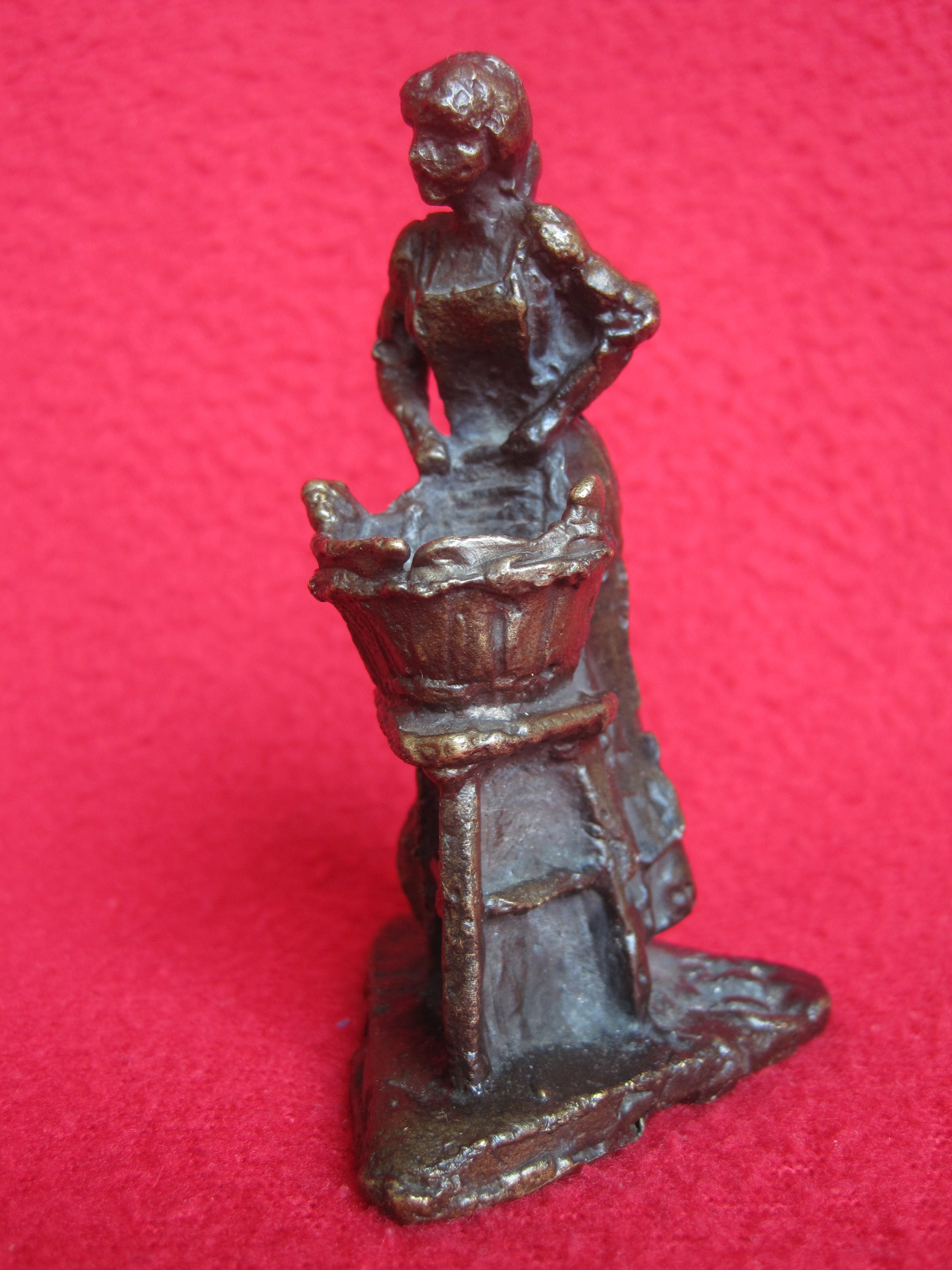 Prachtig massief bronzen beeldje van een vrouw zwoegend aan de wastobbe. Deze stijl doet mij sterk denken aan de stijl van Aimé Jules Dalou. Het beeldje is gesigneerd.