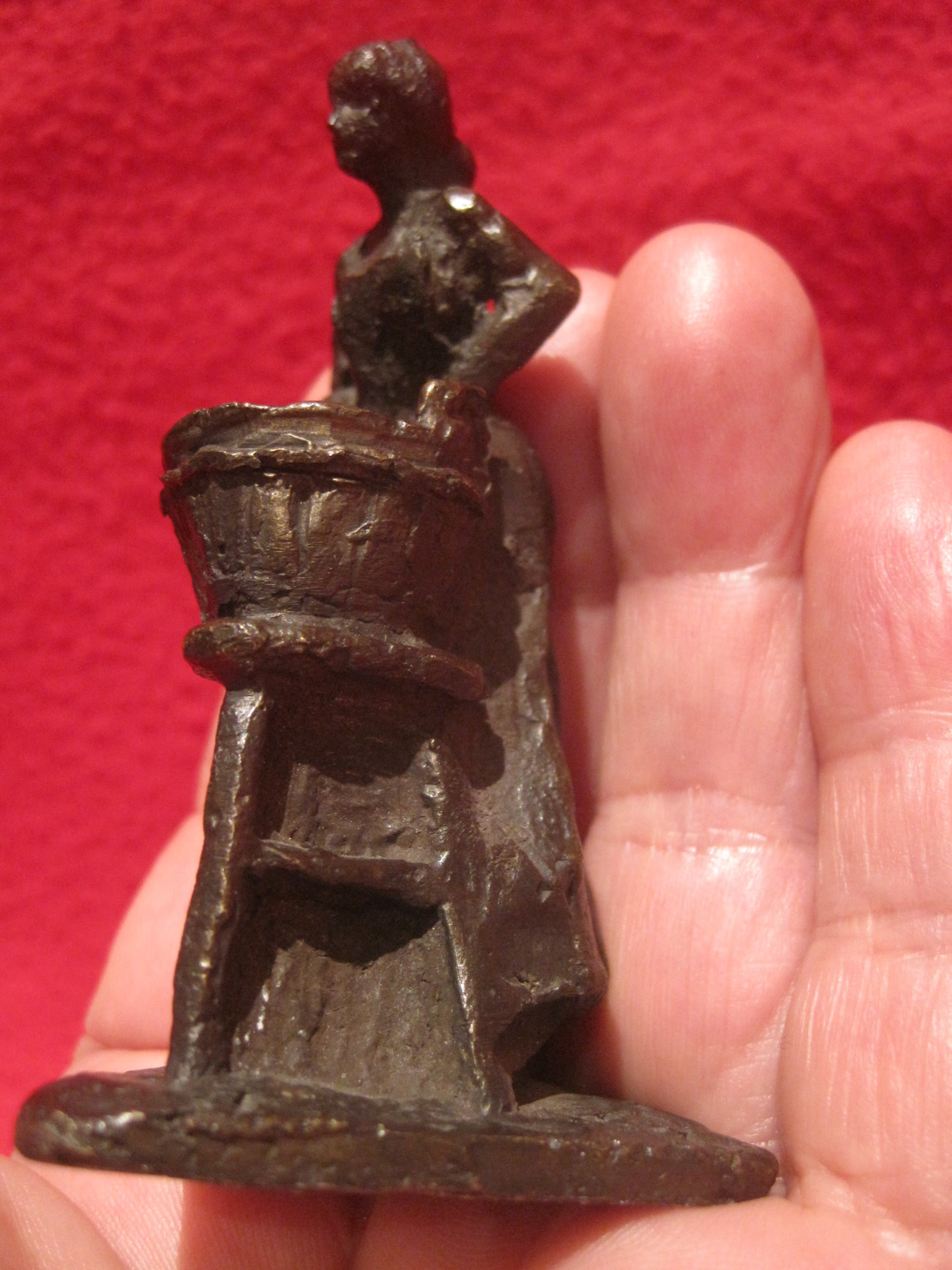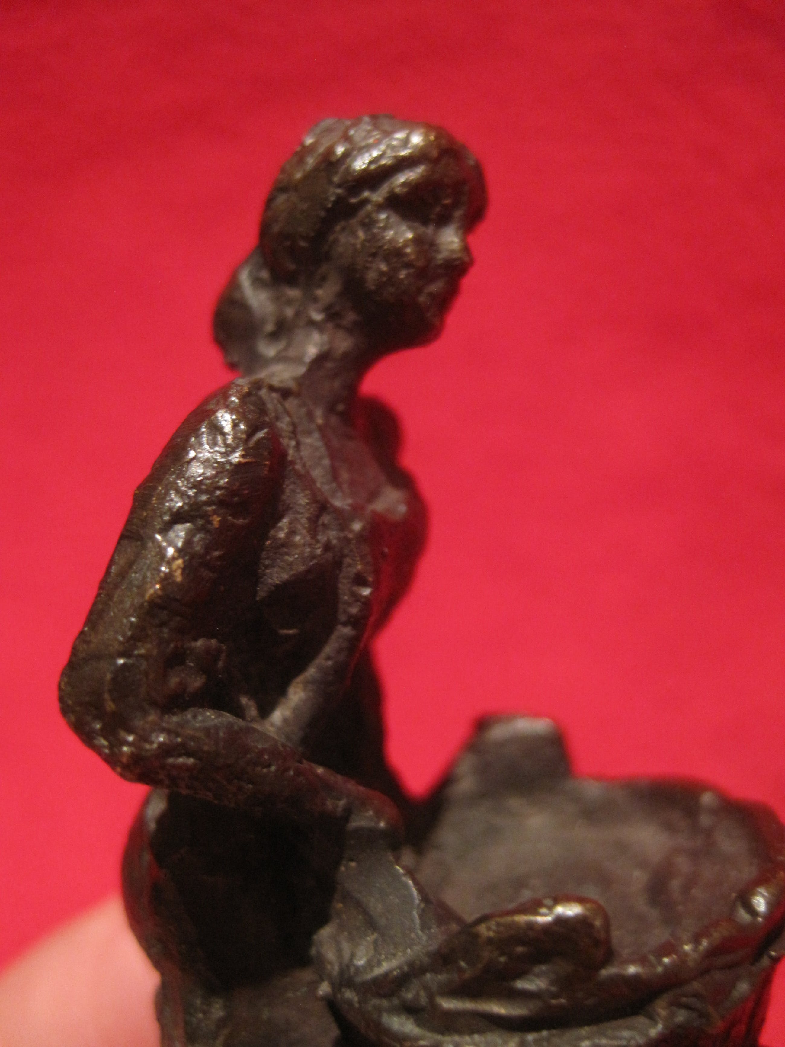 Prachtig massief bronzen beeldje van een vrouw zwoegend aan de wastobbe.