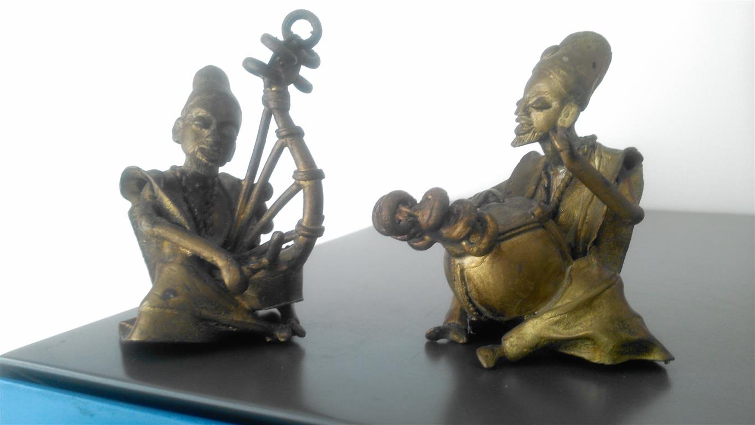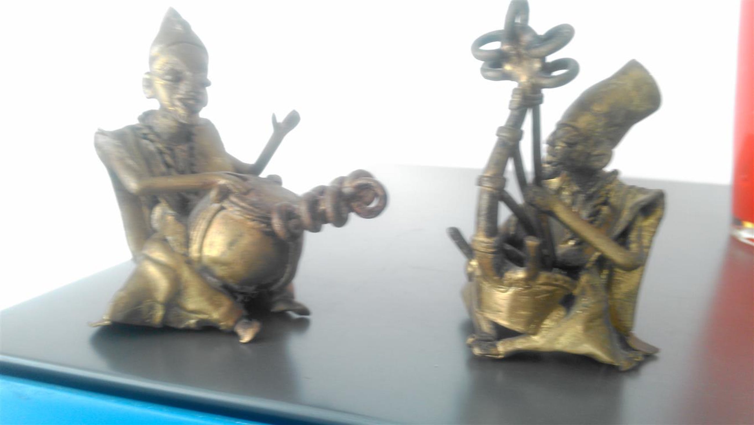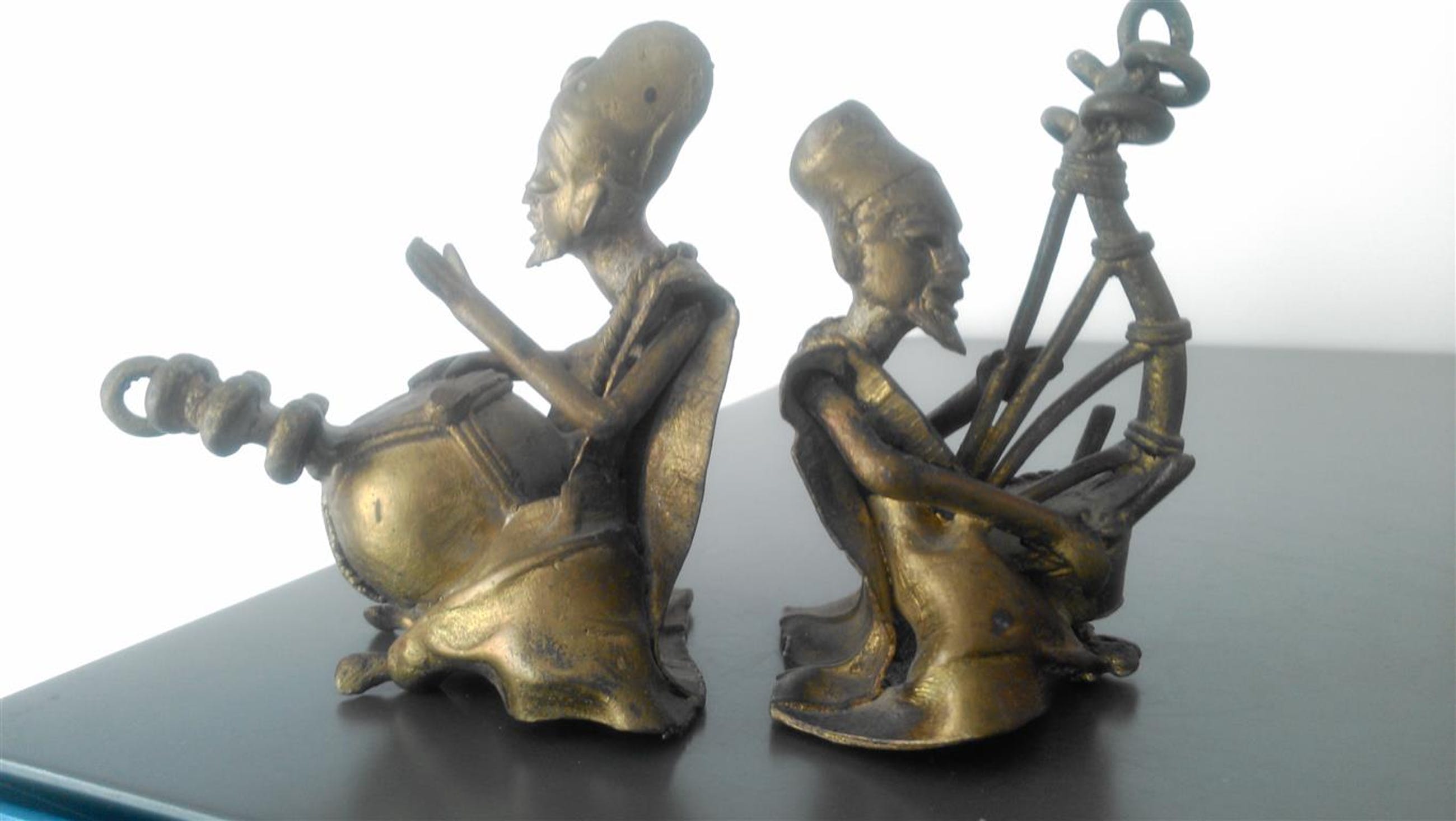 Een koraspeler en een drummer van brons mooi gedetailleerd in alle facetten zoals gezicht, handen, kleding en instumenten