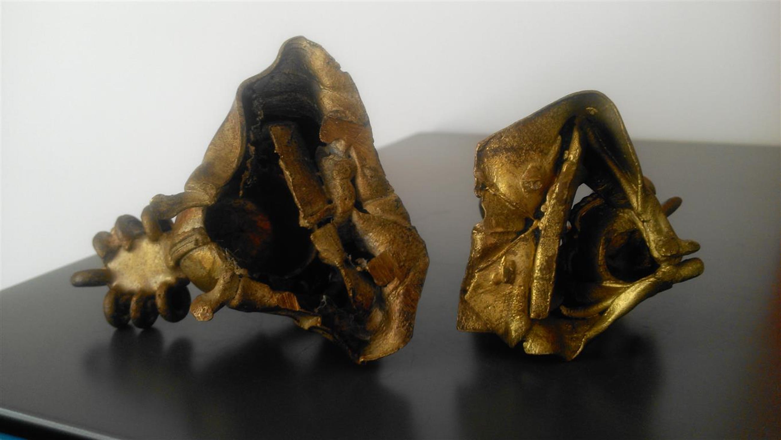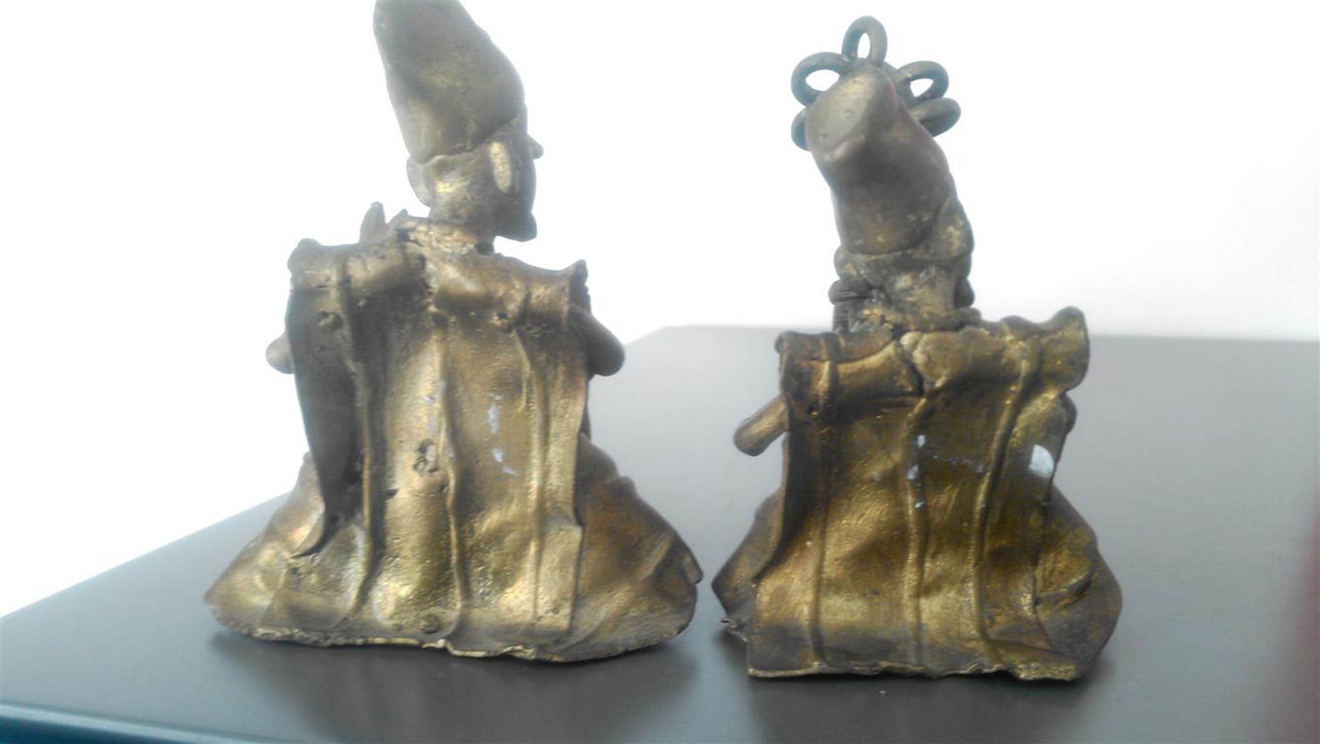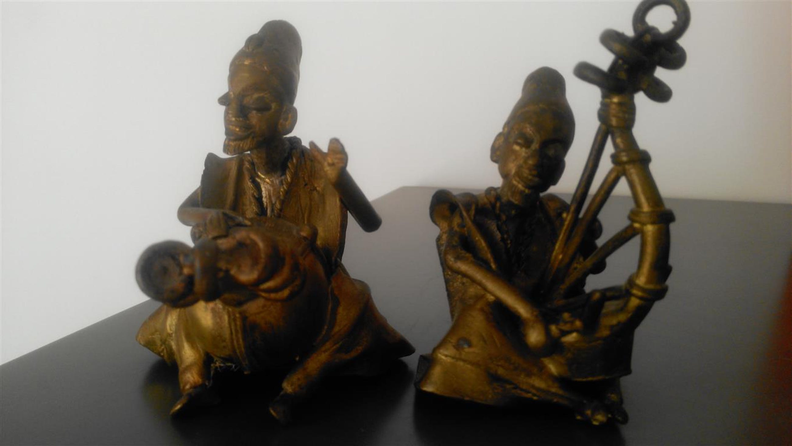 Een koraspeler en een drummer van brons mooi gedetailleerd in alle facetten zoals gezicht, handen, kleding en instumenten