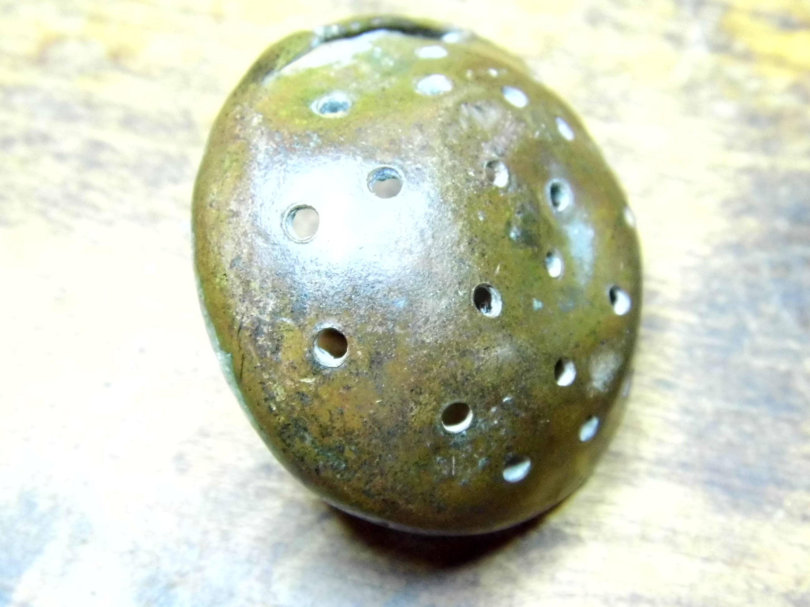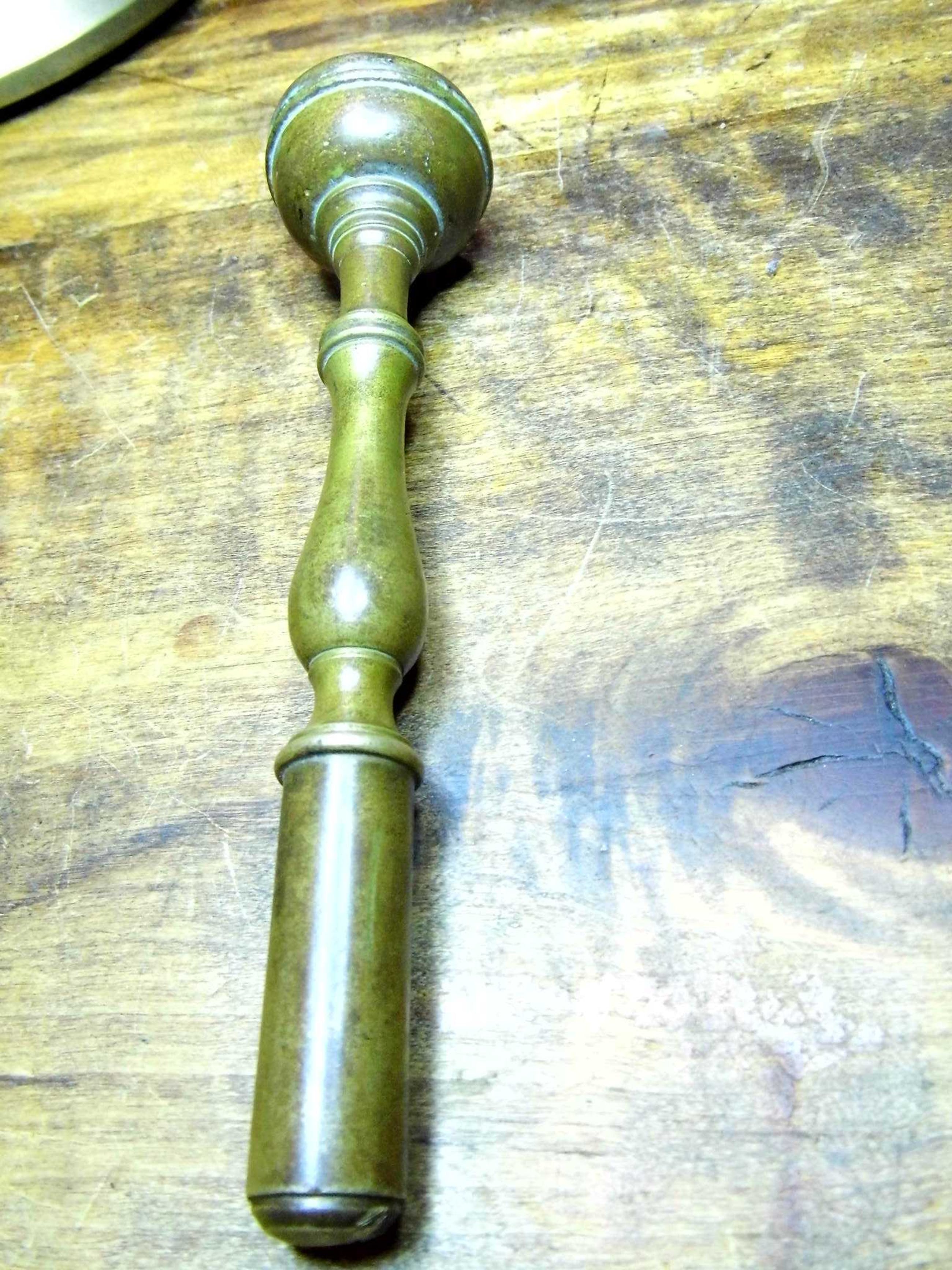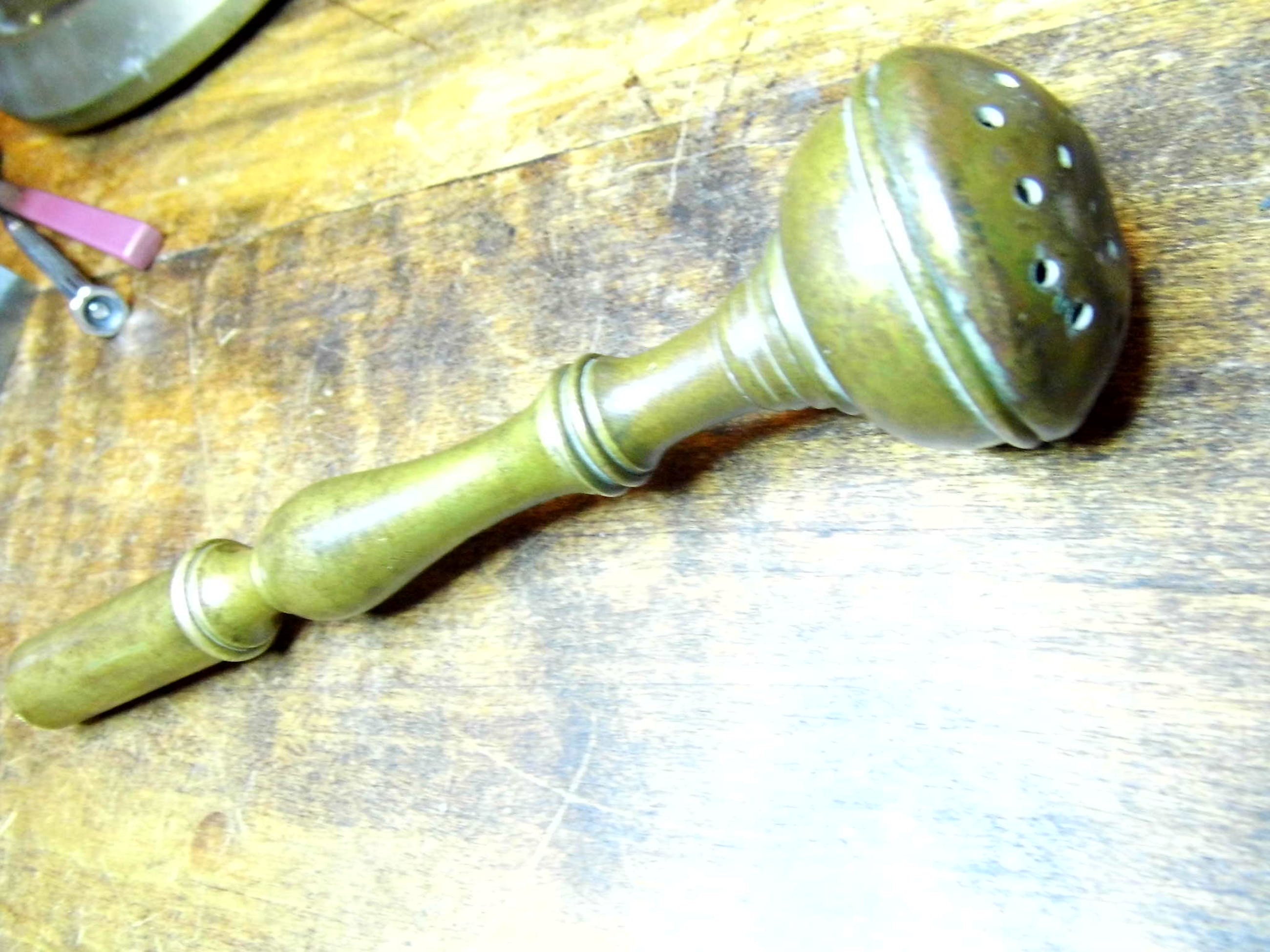Redelijk zeldzaam exemplaar van een wijwater-sprenkelaar. Steel is massief, kop is lichtelijk gedeukt. Heeft mooie ouderdoms-patina.