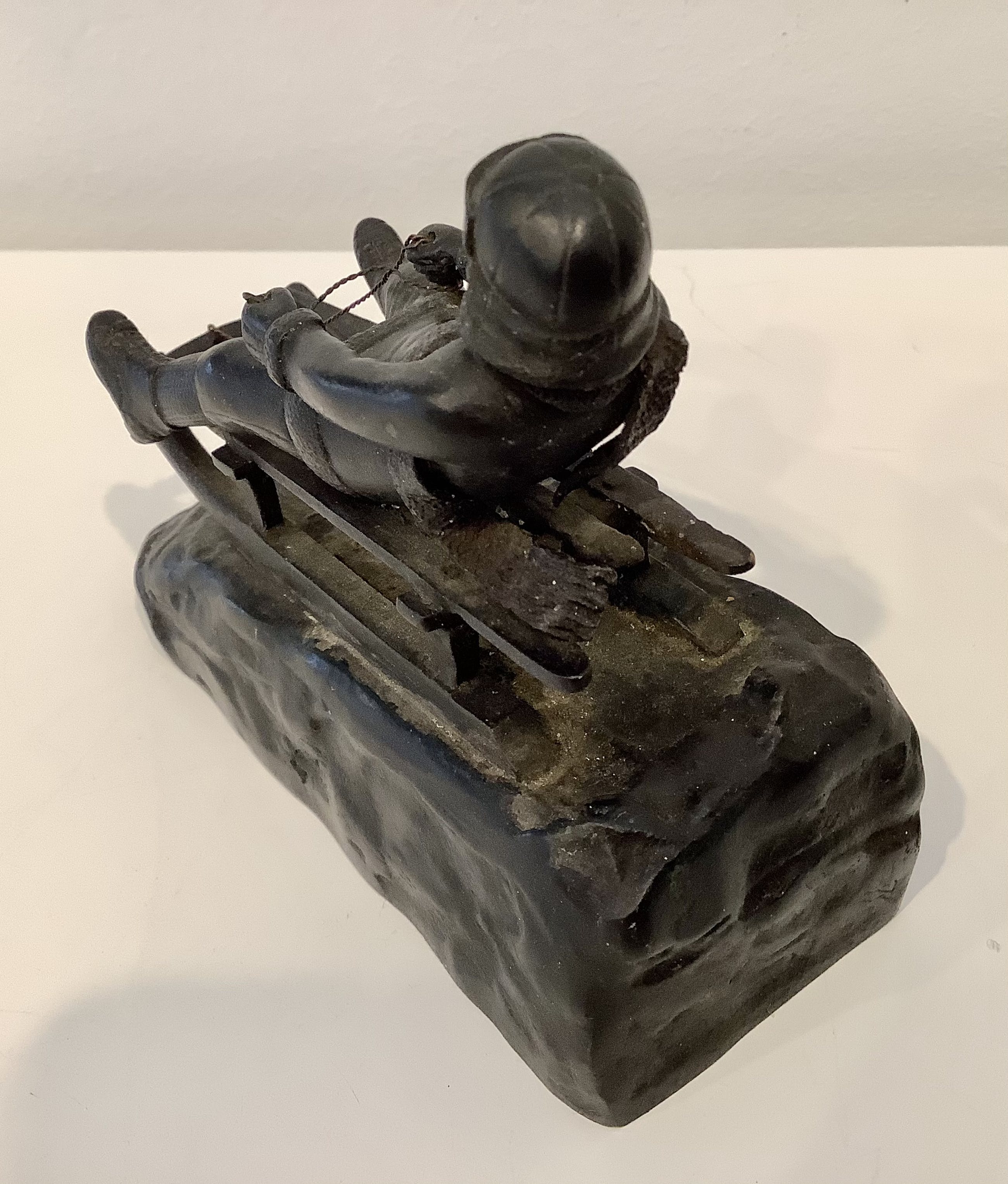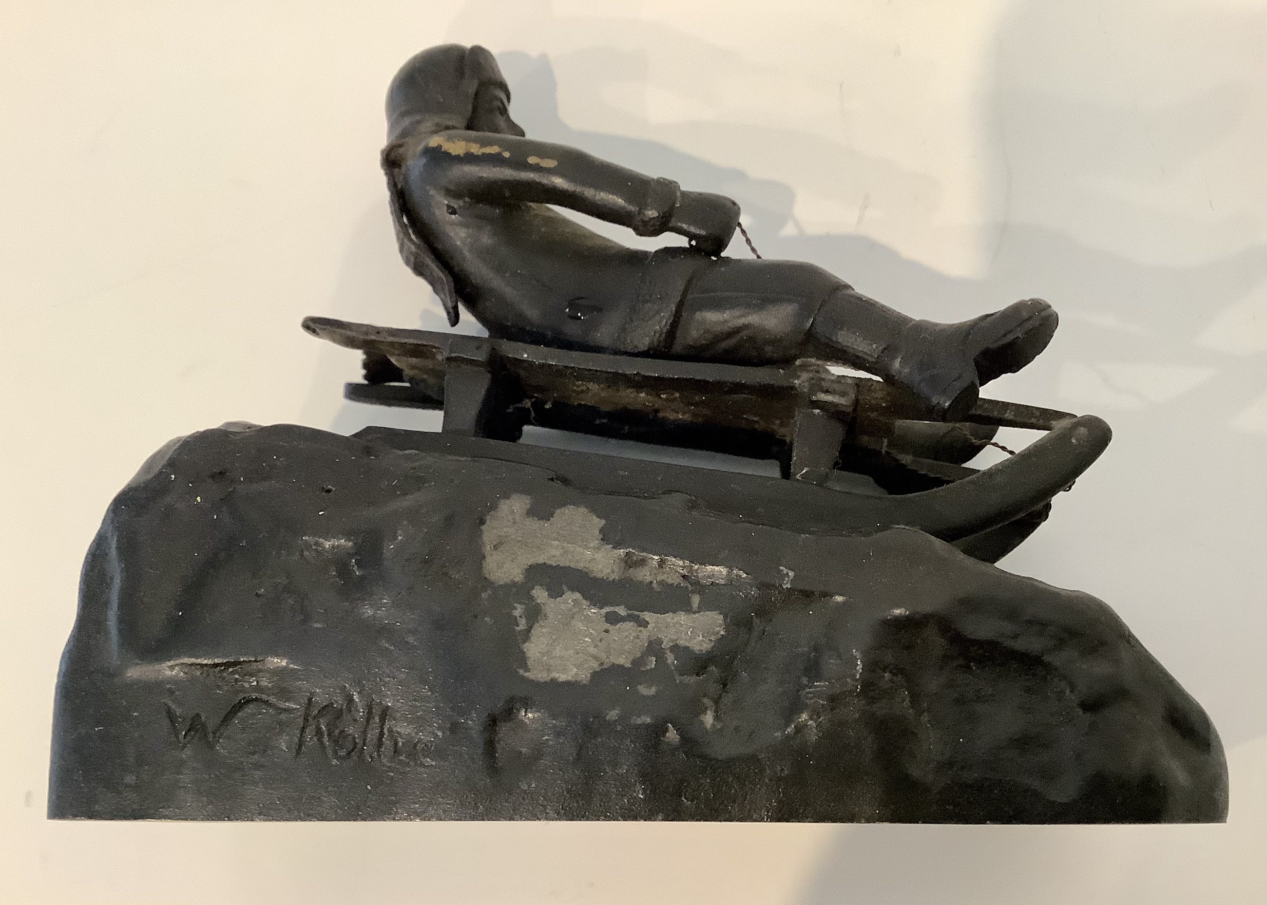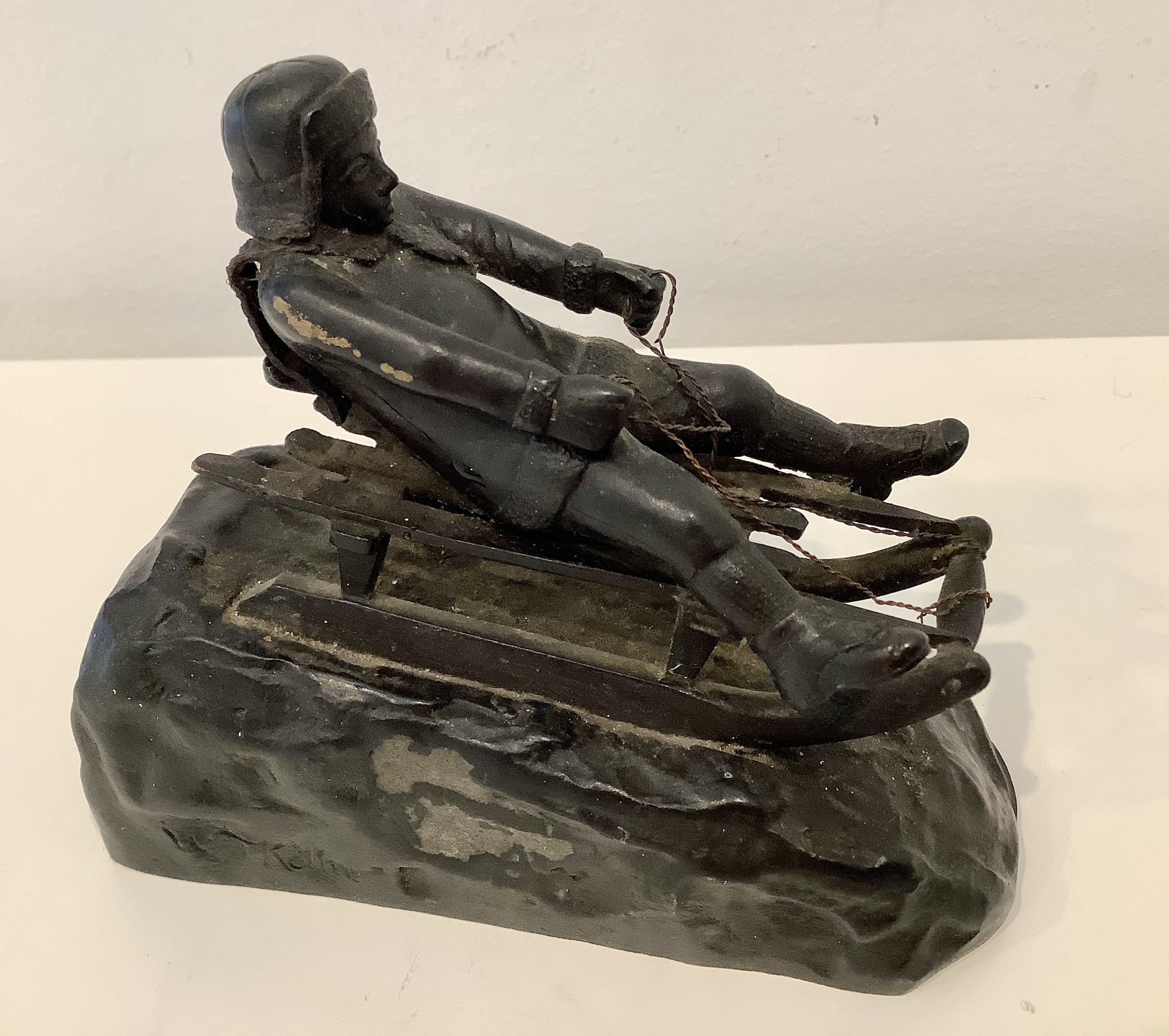 Aandoenlijke voorstelling van wintersporter op slee. Fraaie details. Zwaar brons. Gesigneerd.