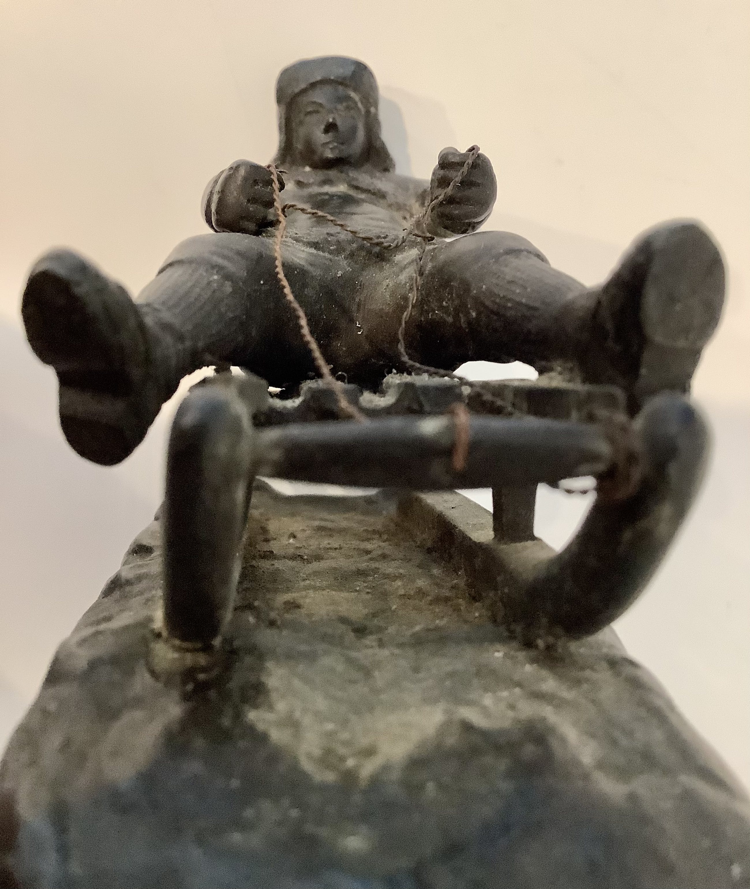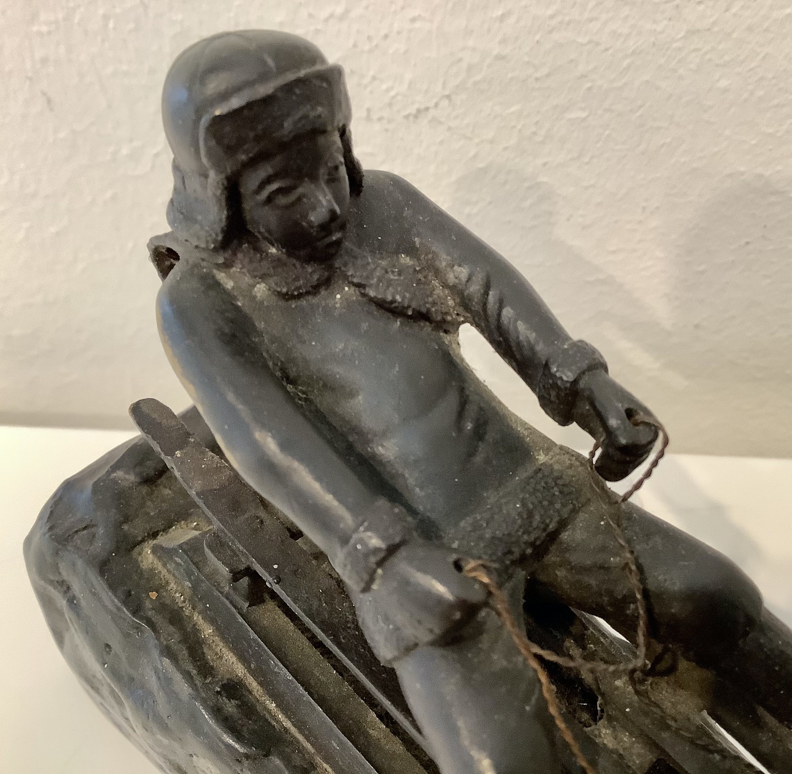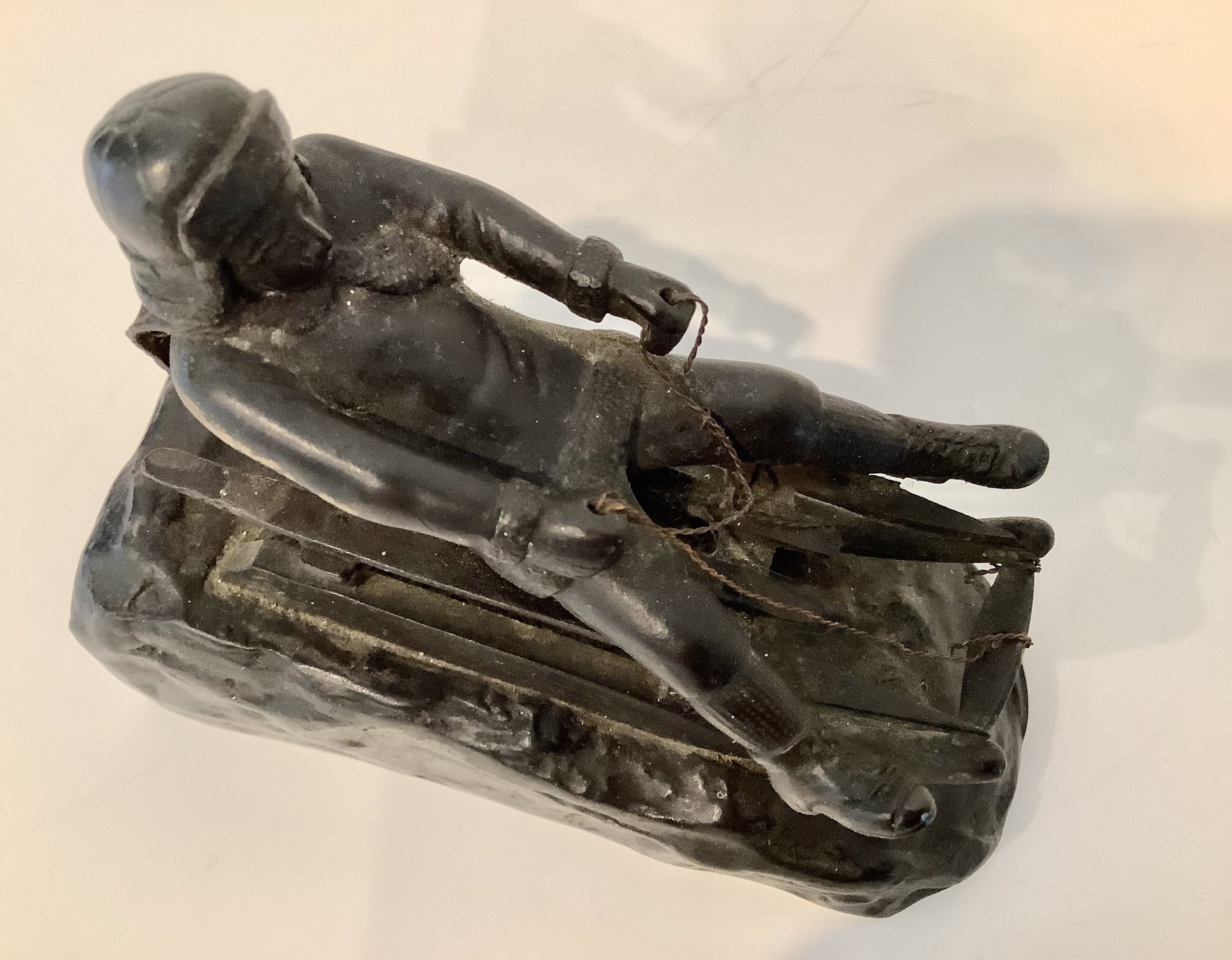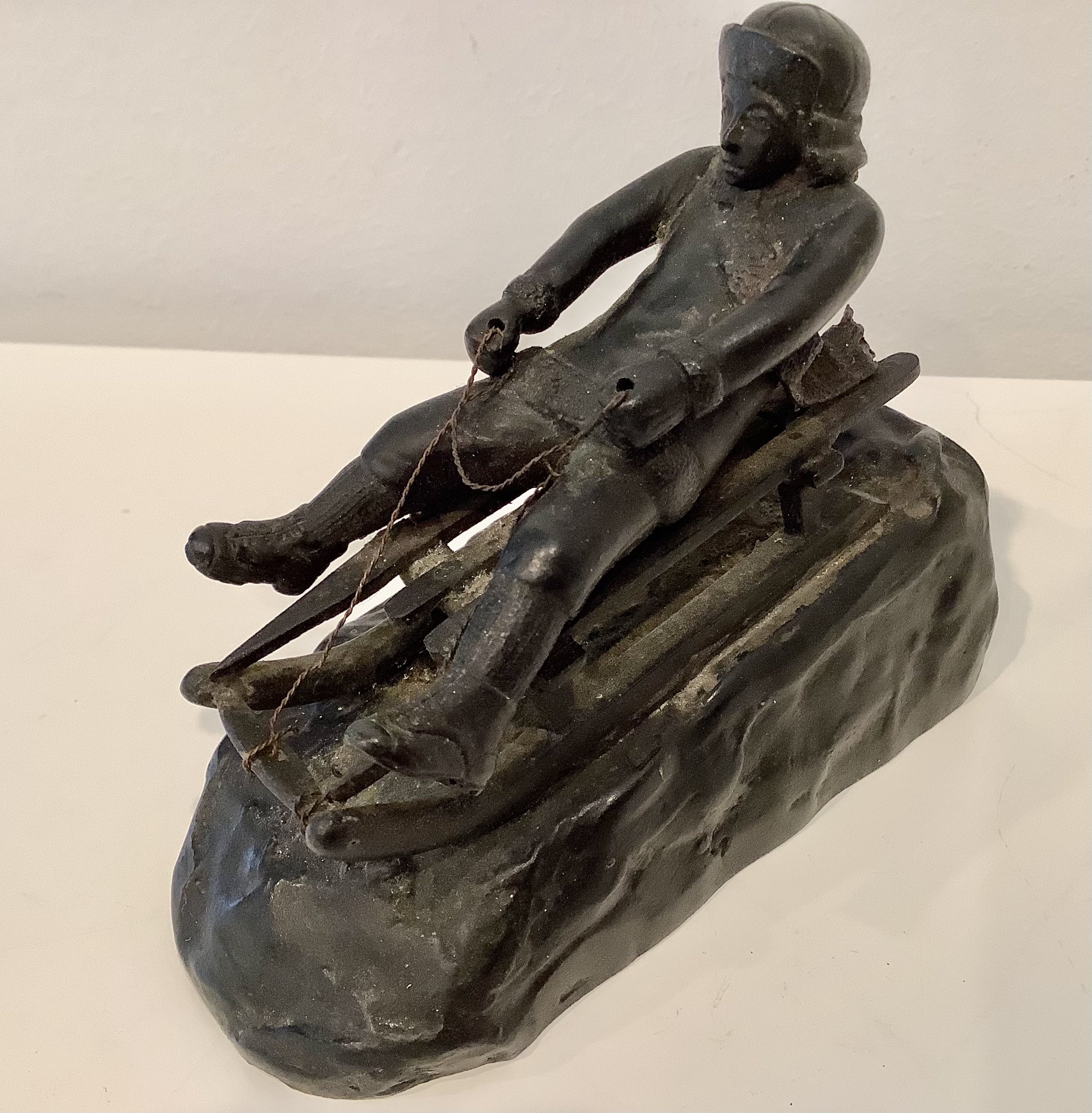 Aandoenlijke voorstelling van wintersporter op slee. Fraaie details. Zwaar brons. Gesigneerd.