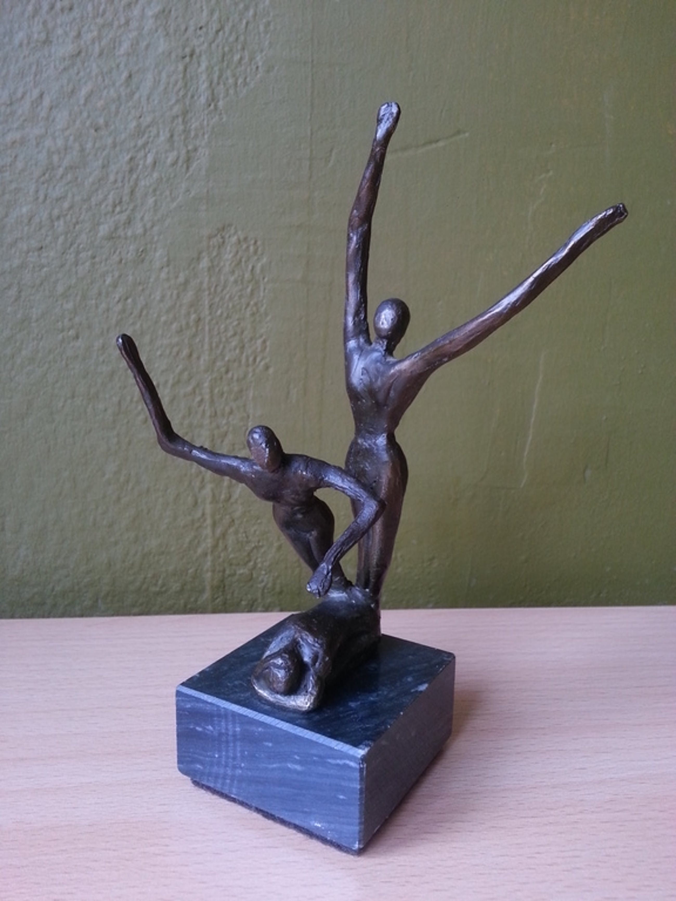 Een prachtig bronzen beeldje op marmeren sokkel dat in mijn ogen winst en verlies symboliseert.