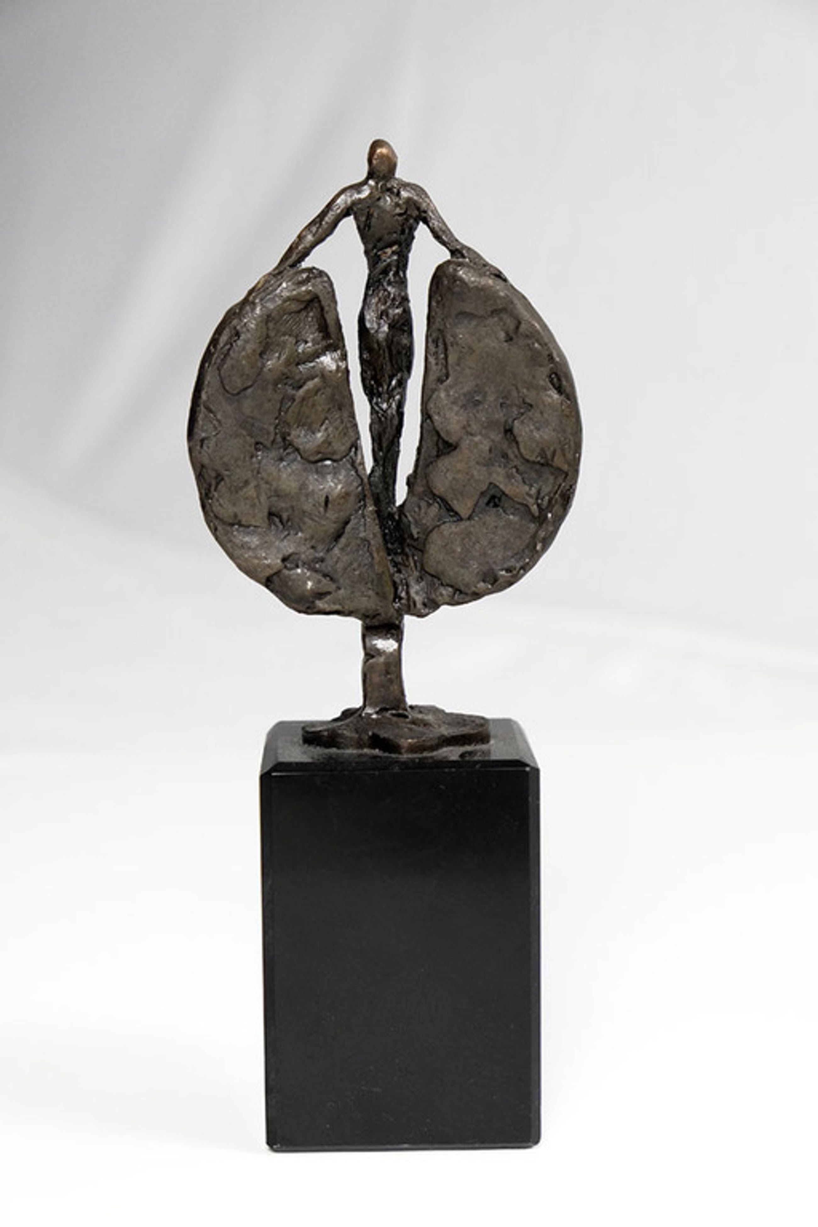 Een prachtig bronzen beeldje van een figuur met vleugels op een zwart marmeren sokkel.