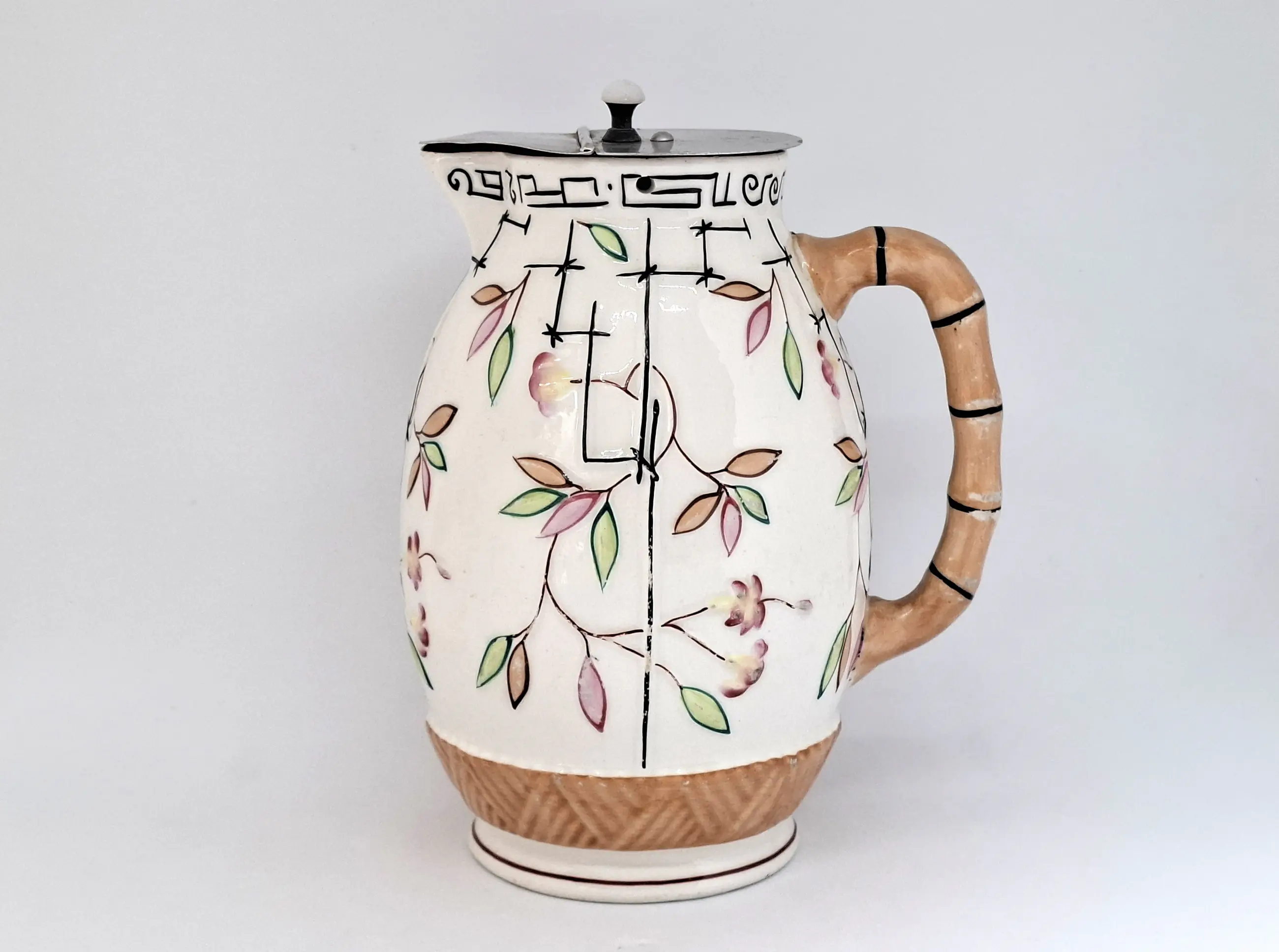 gedecoreerd met een motief van bamboe-loten in reliëf. Het handvat is uitgevoerd in Aziatische bamboestijl evenals een rand aan de onderkant. De oude, metalen deksel met daarin de tekst ‘Made in England’, is origineel. Er zijn diverse uitvoeringen bekend. Het gaatje en de opening aan de bovenrand zijn dat ook. De kan is op de onderzijde gemerkt met ’1544’.