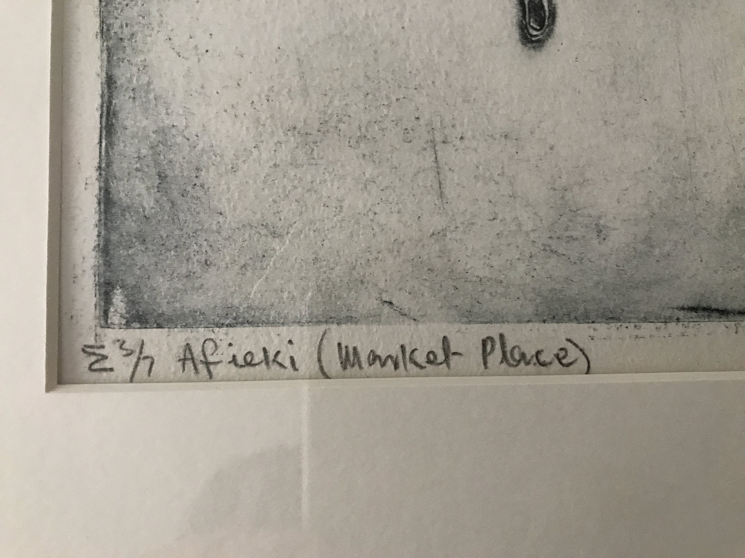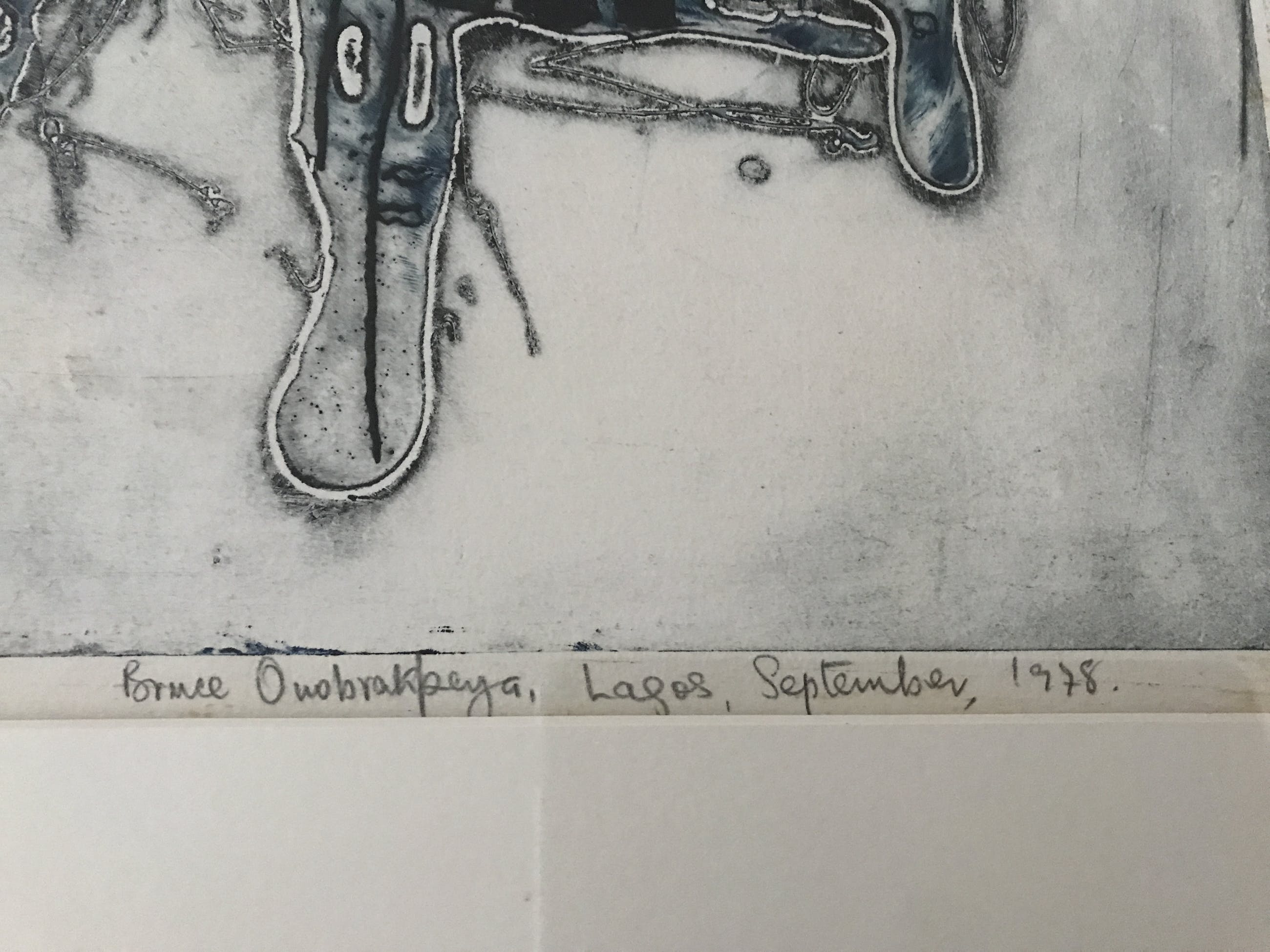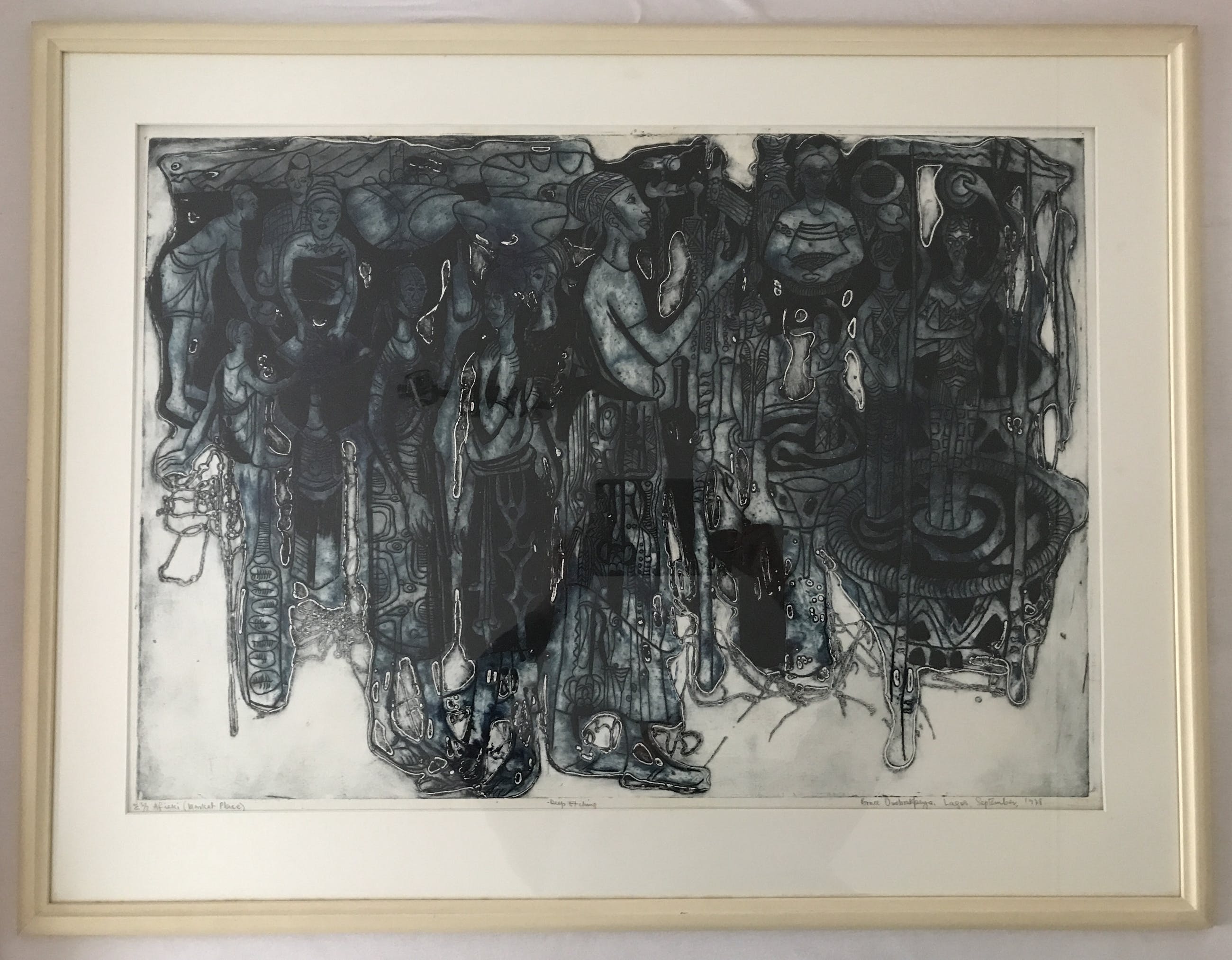 Deze “Deep Etching” is door mij, begin jaren tachtig van de vorige eeuw, rechtstreeks van de kunstenaar Bruce Onobrakpeya, in Lagos, Nigeria, aangekocht en in beheer gehouden.
