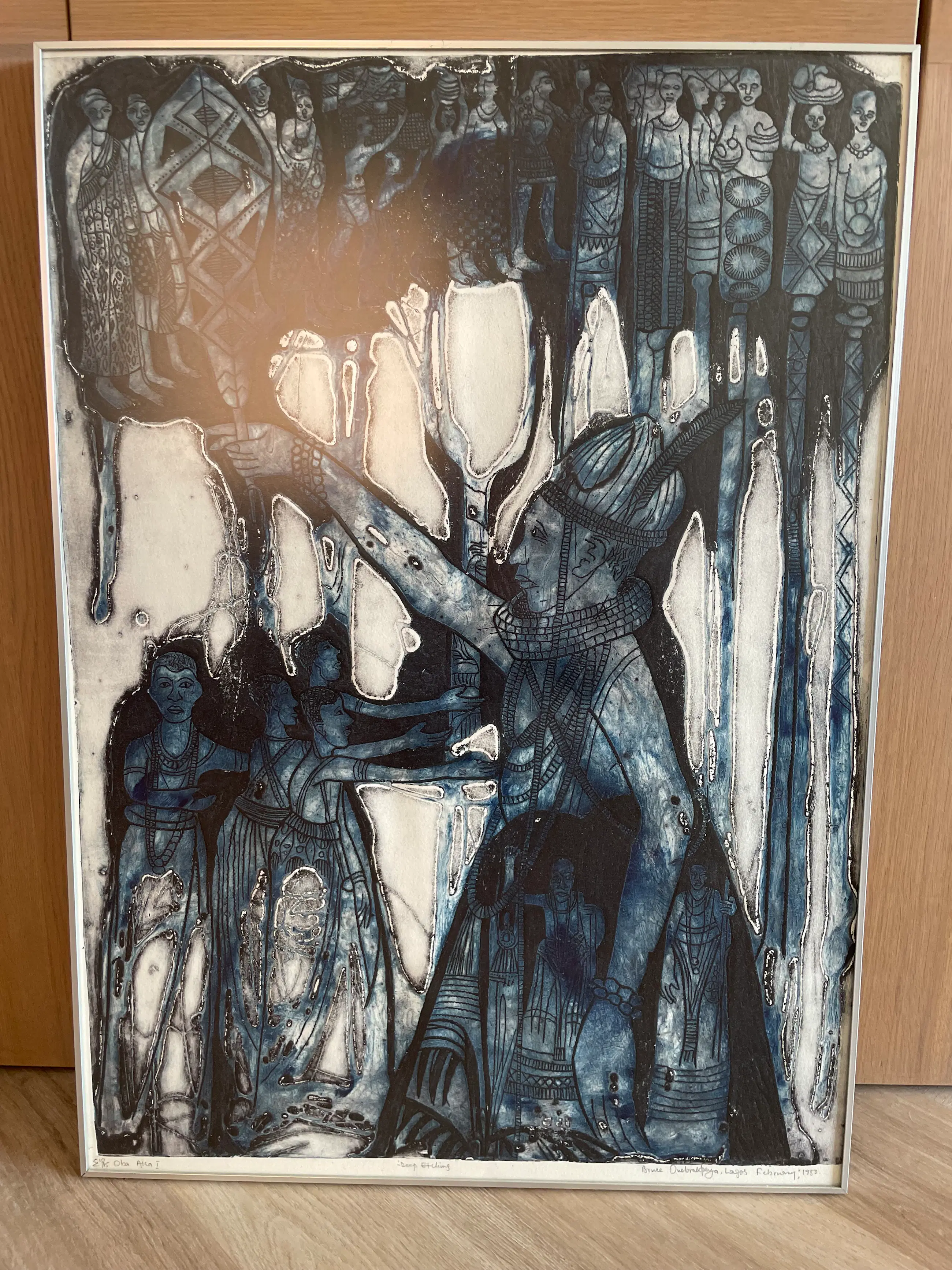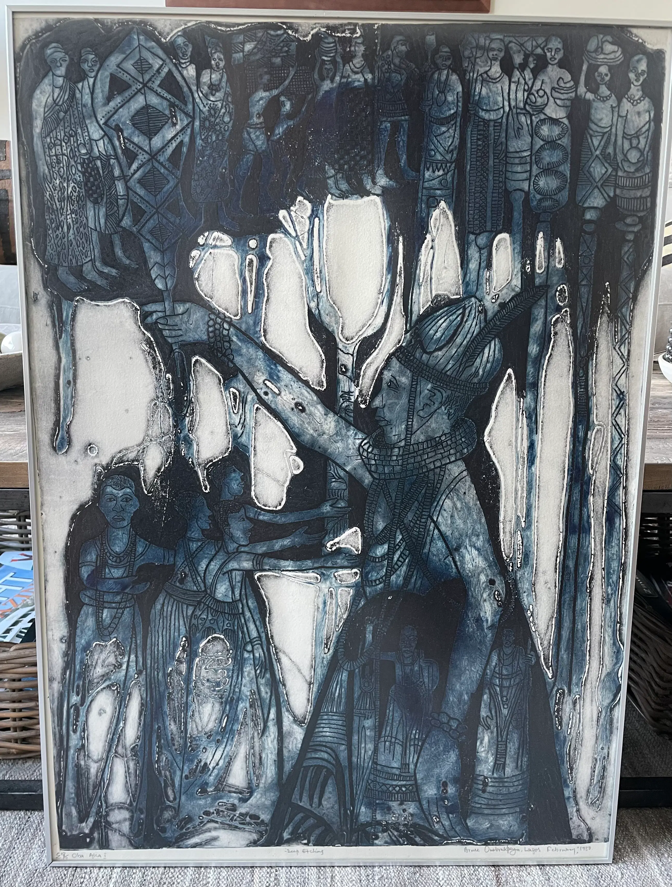 Ets van de beroemde Nigeriaanse kunstenaar Bruce Onobrakpeya. Gesigneerd. Titel: Oba Aka I (koning Aka in Toruba taal).