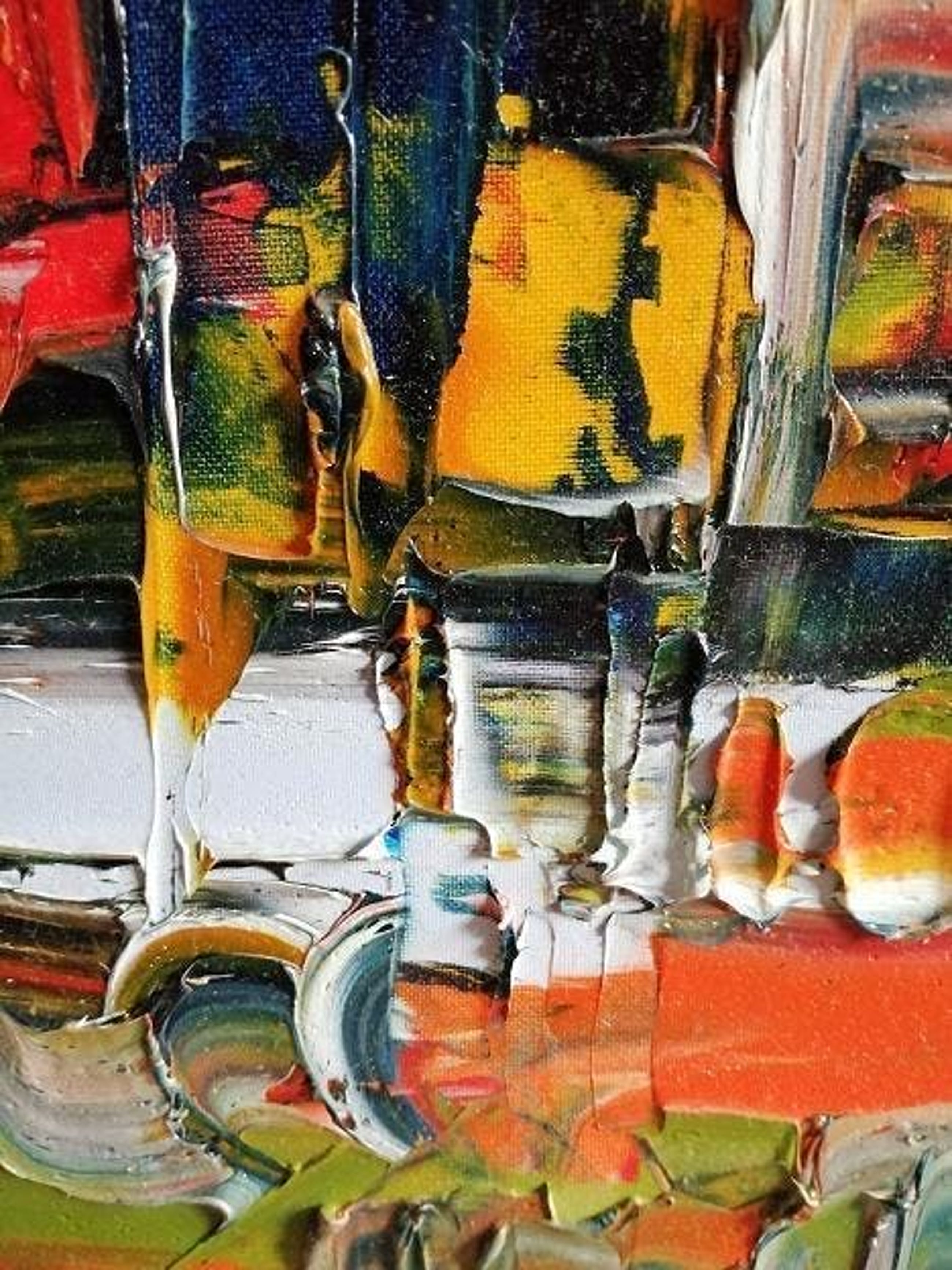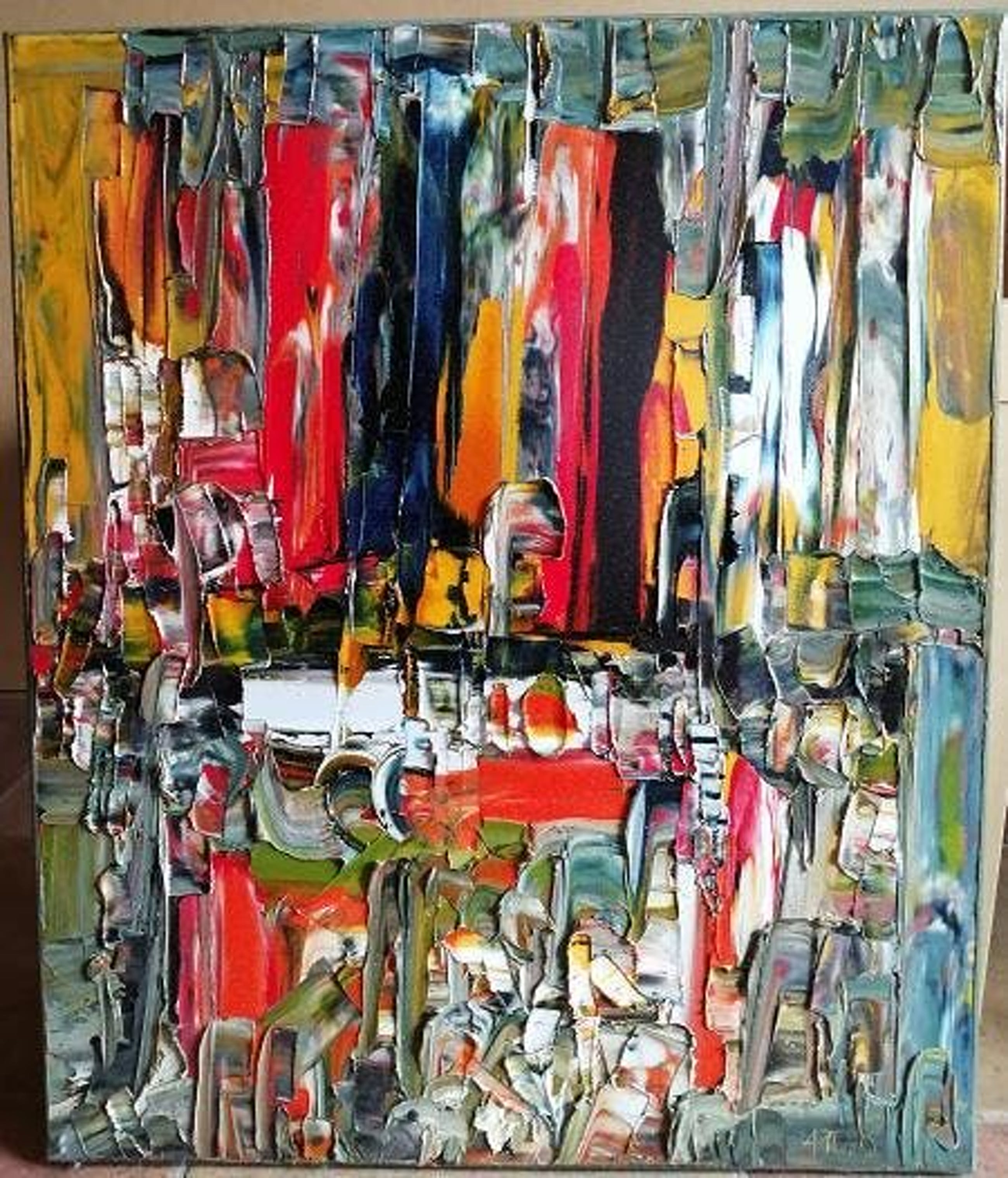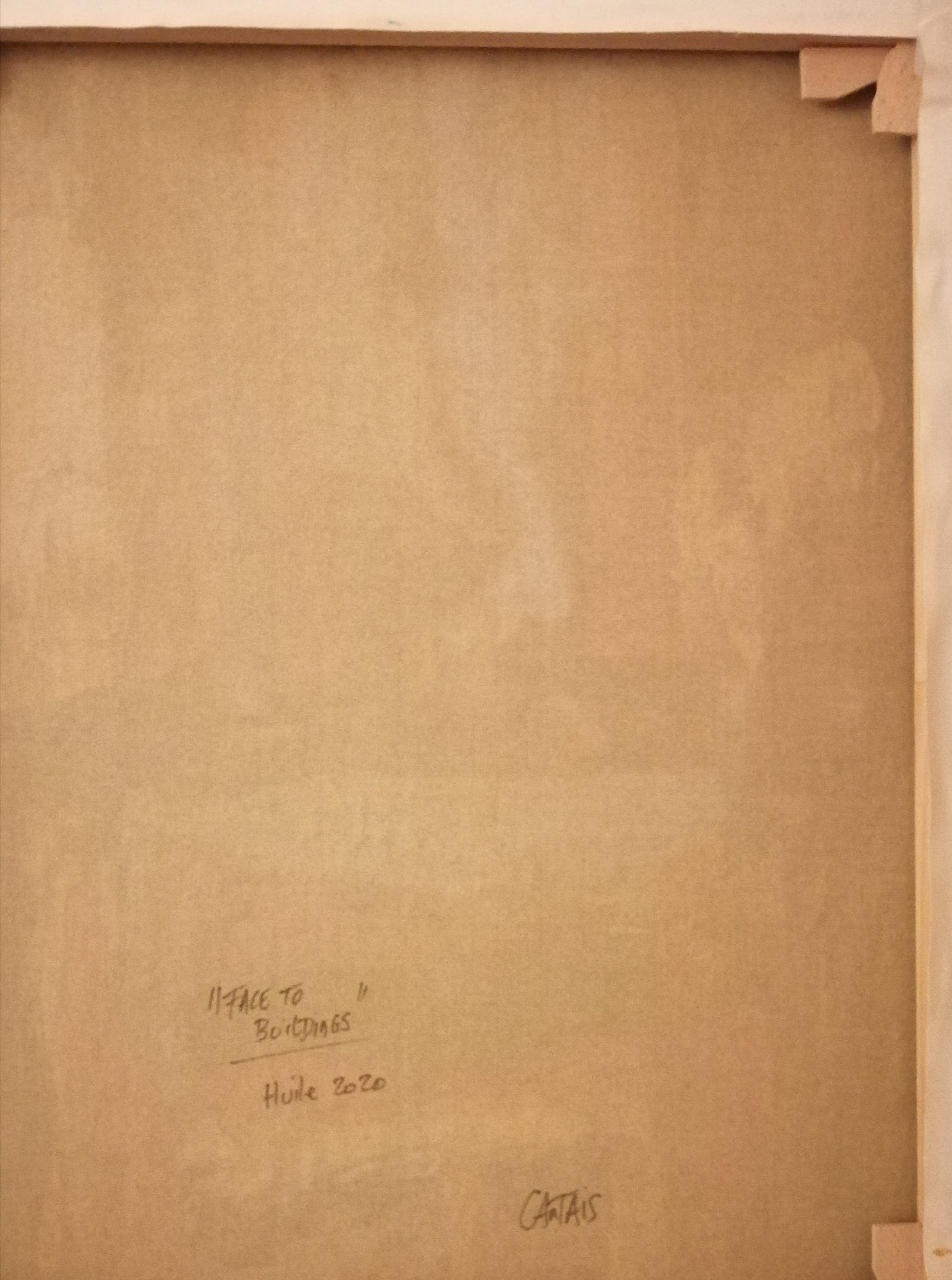 Expressionistisch olieverf schilderij, getiteld Face to Buildings, geschilderd door Bruno Cantais in 2020.