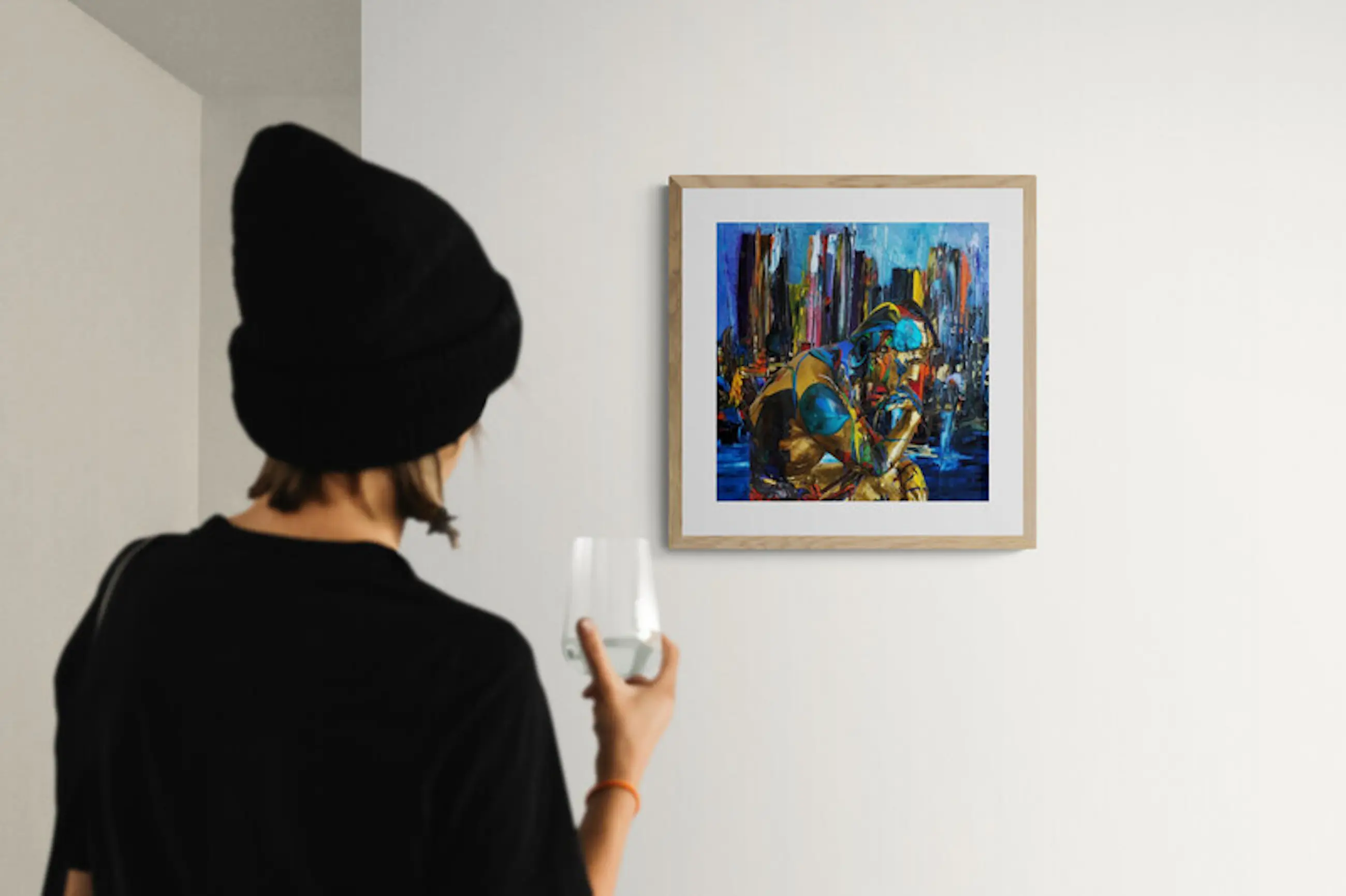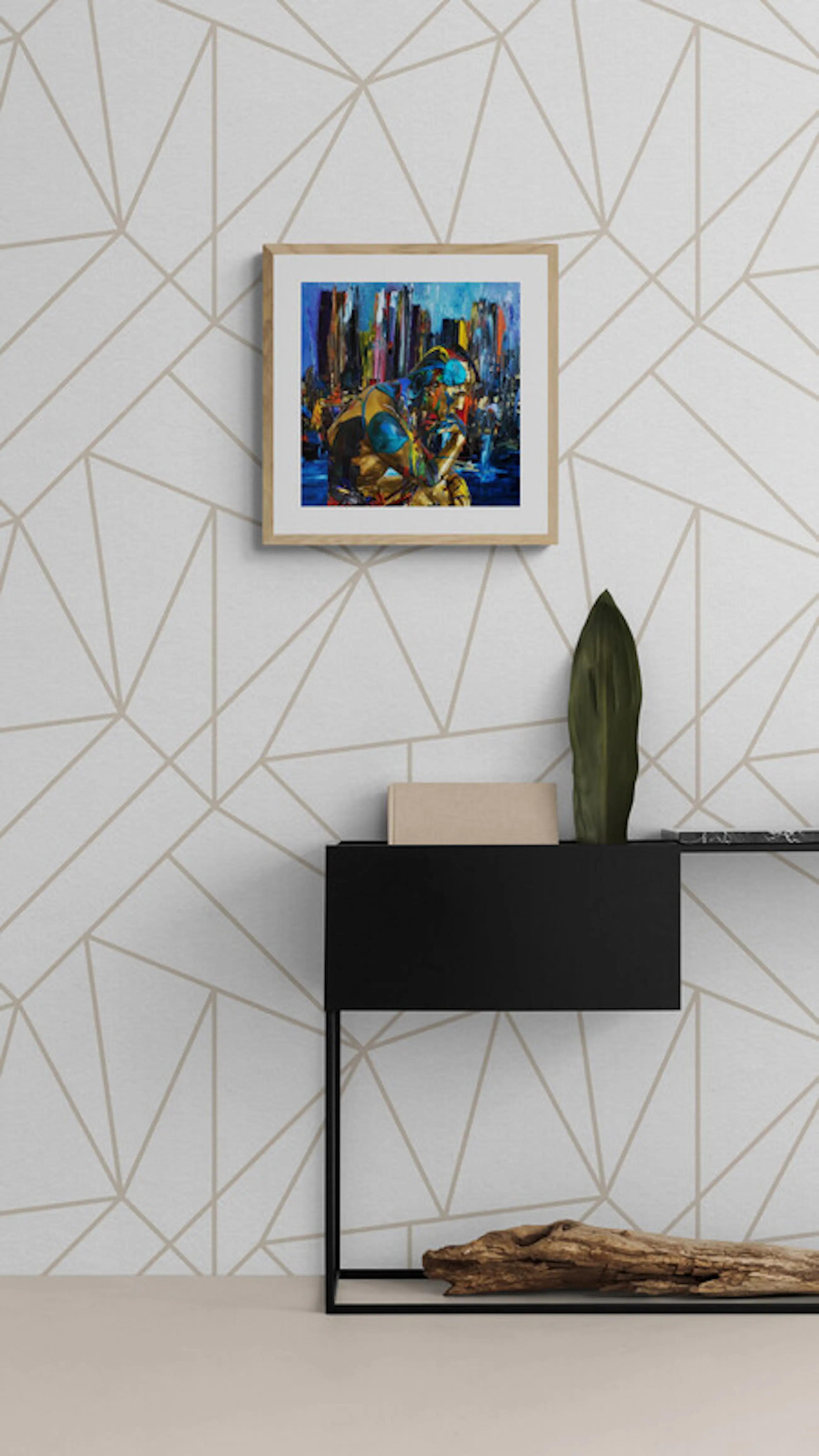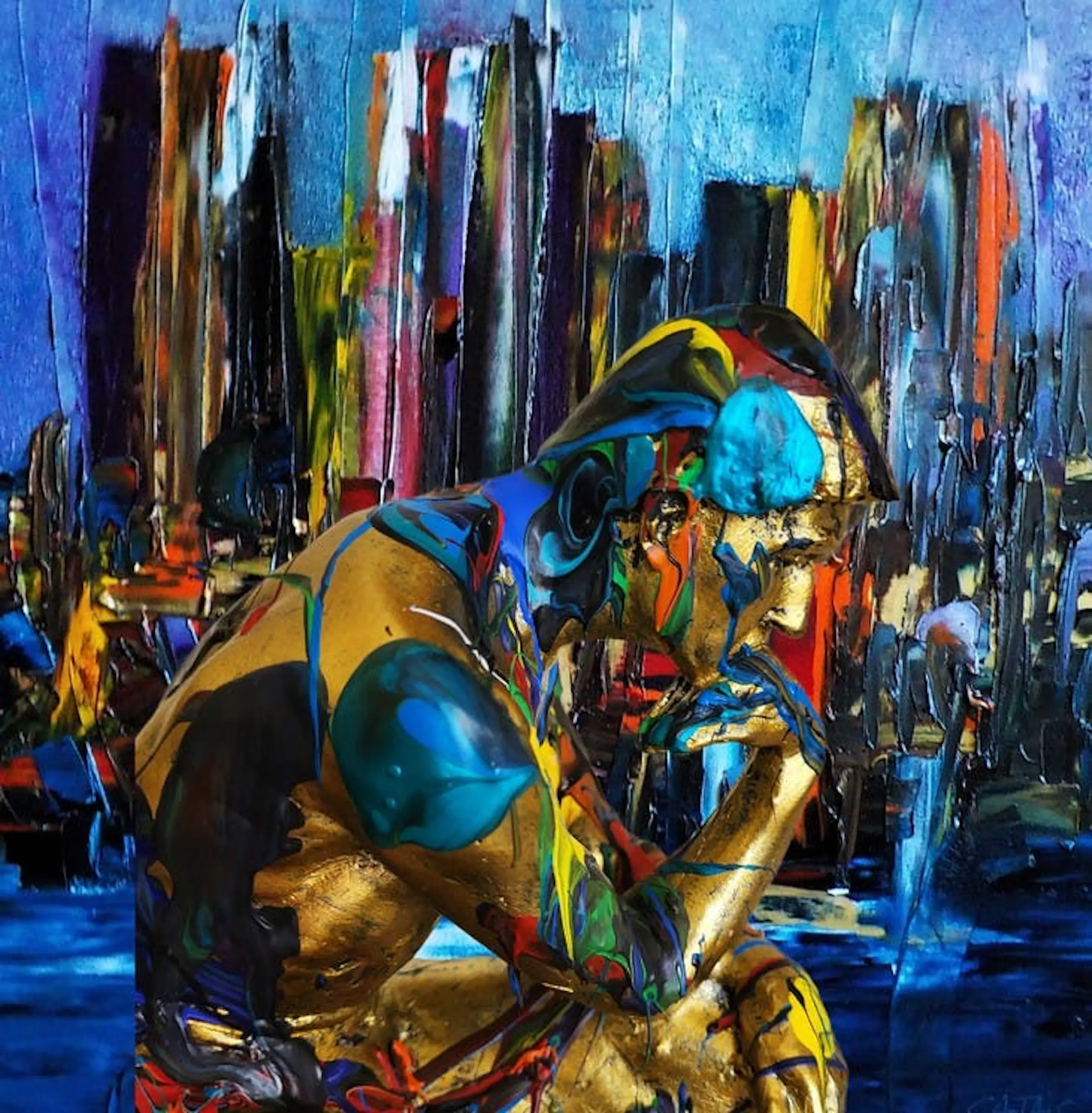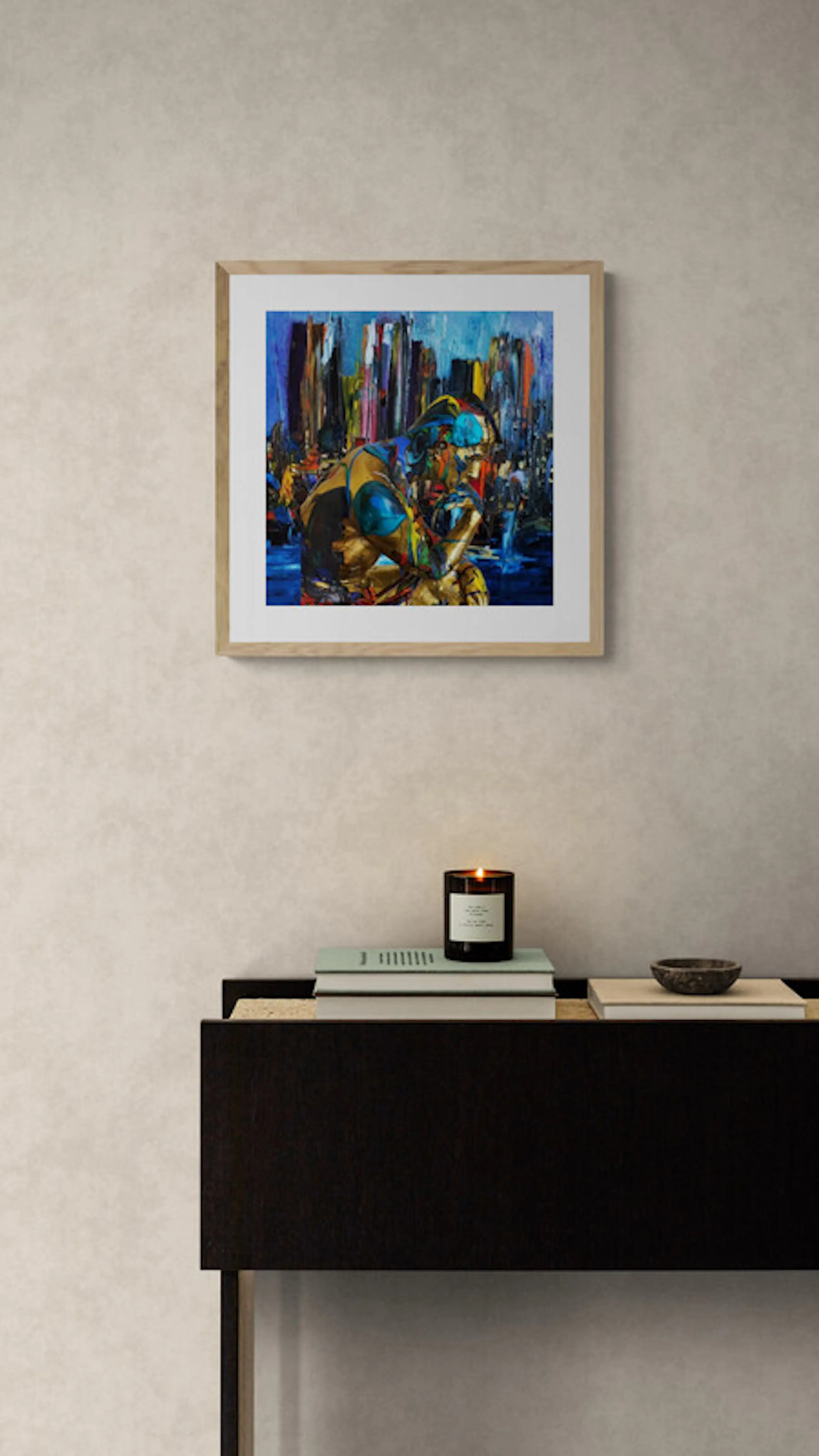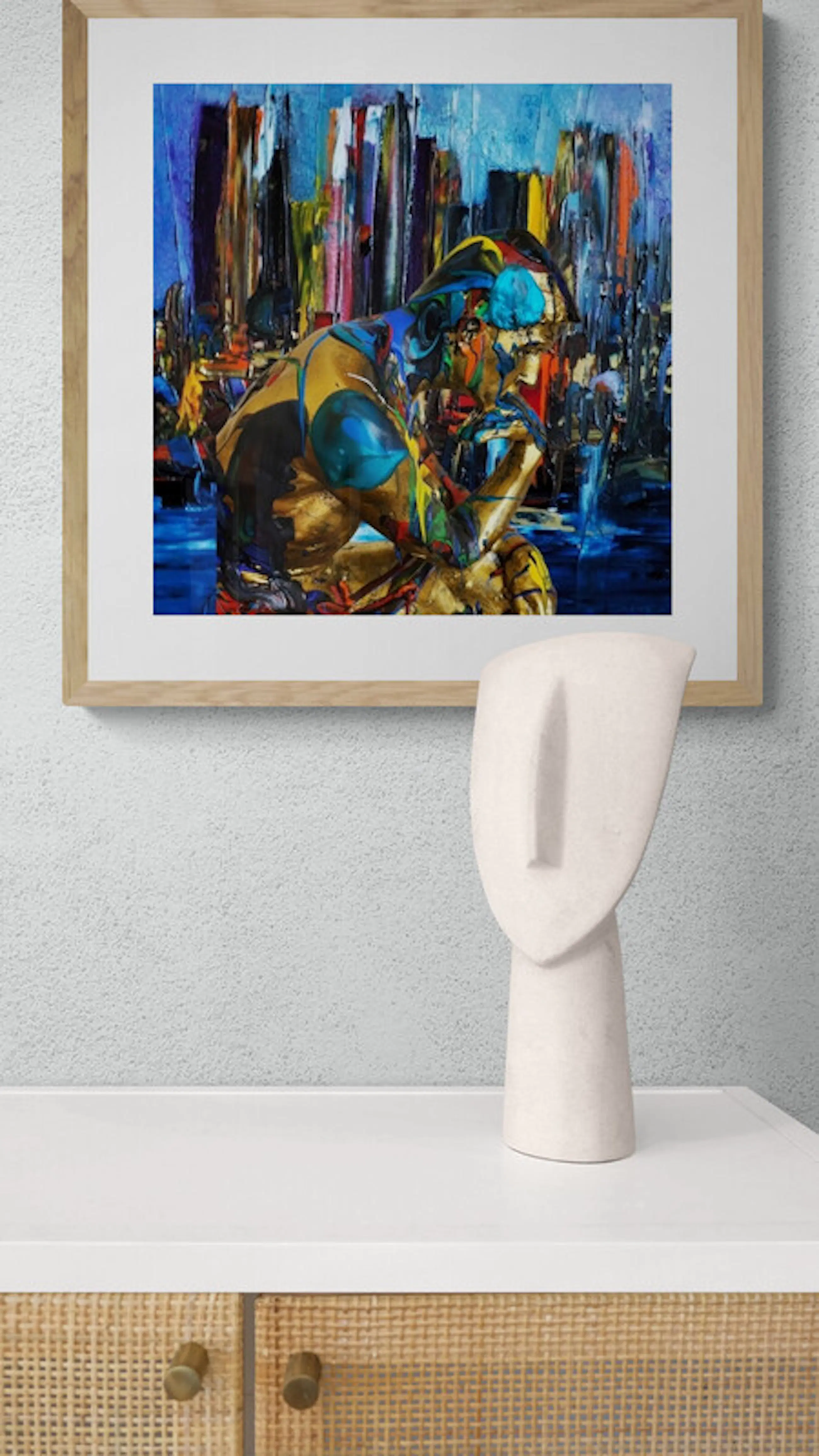 Digitaal gecreëerd kunstwerk. Digitale interactie van mijn afbeeldingen van schilderijen en beeldjes. 40x40x0,5 cm Op aluminium Genummerd 1/5