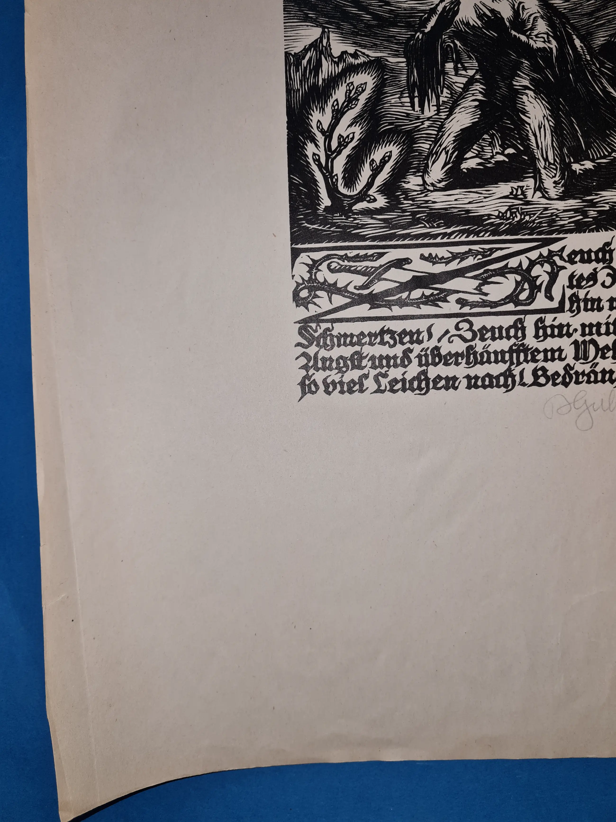 originele houtsnede door Bruno Goldschmitt (* 22 maart 1881 in Neurenberg; † 4 april 1964 in München) Houtsnede met een klacht na WO I Houtsnede: 18cm x 23cm Bladformaat 39cm x 50cm gesigneerd rechtsonder in lood Papier licht vergeeld, randdefecten erg zeldzaam !
