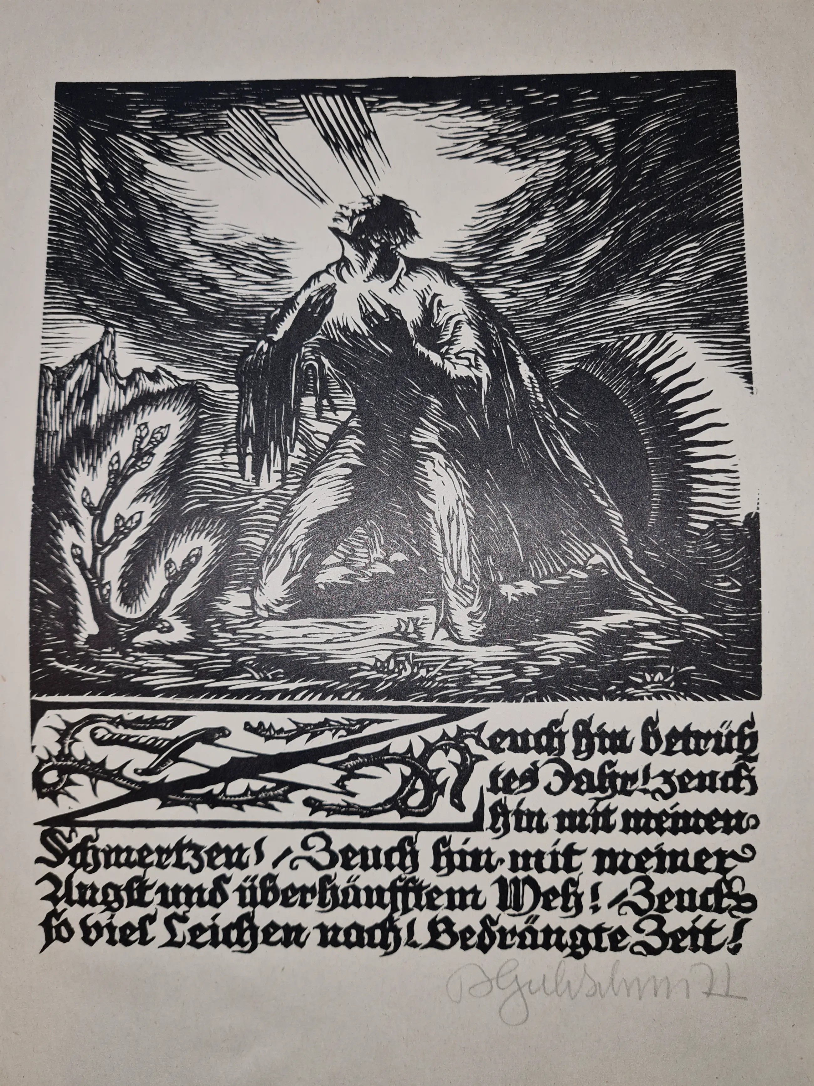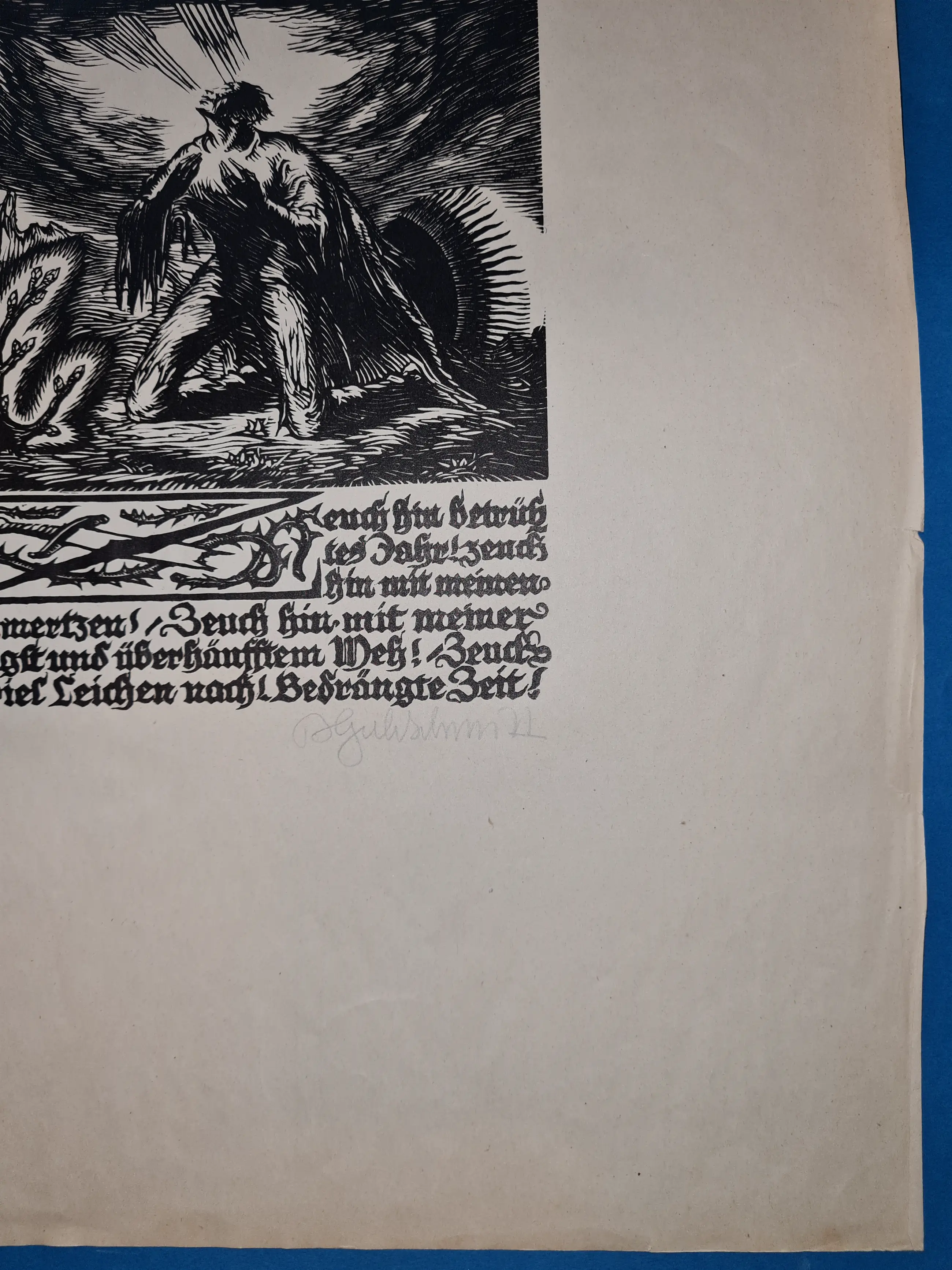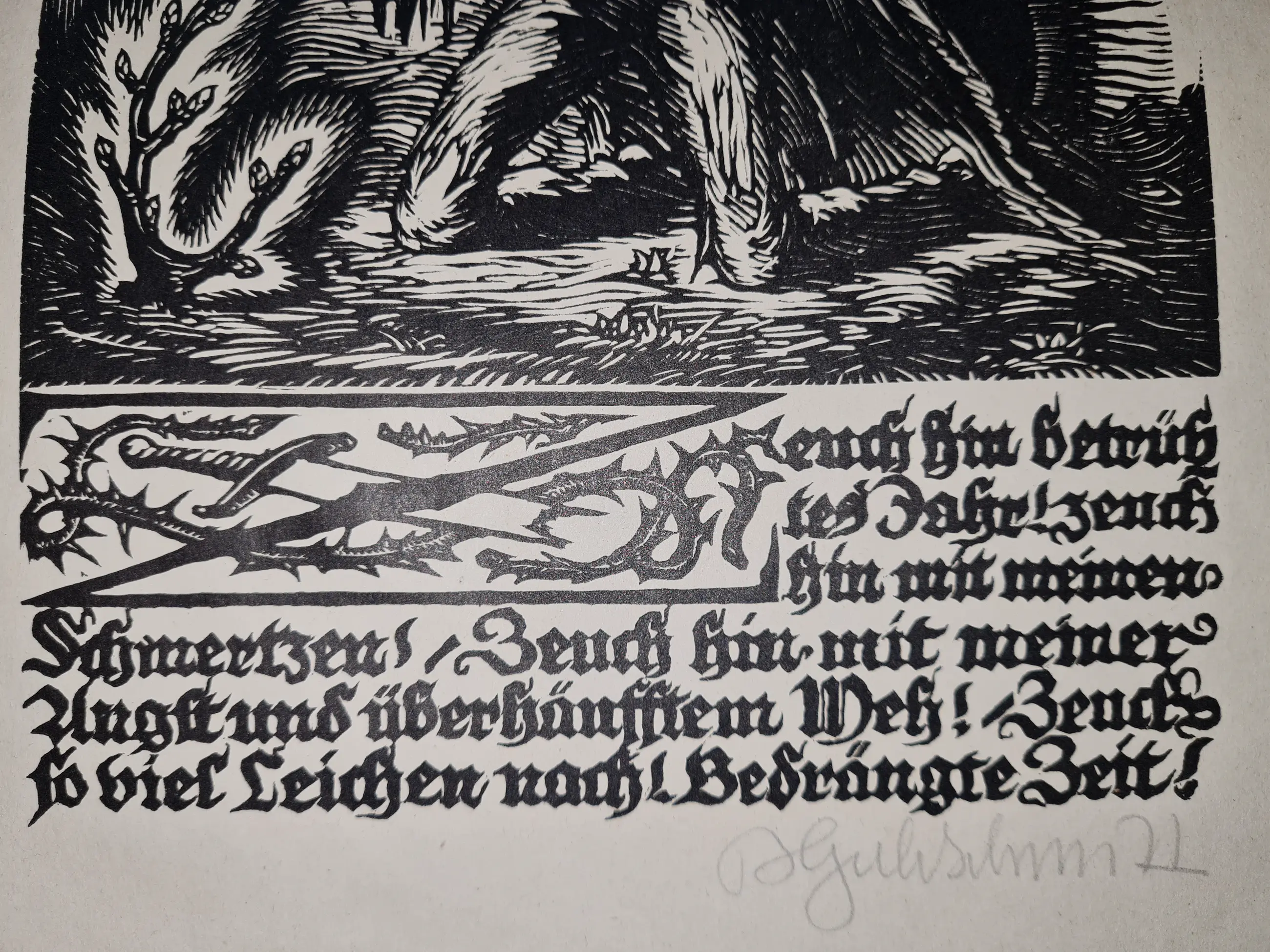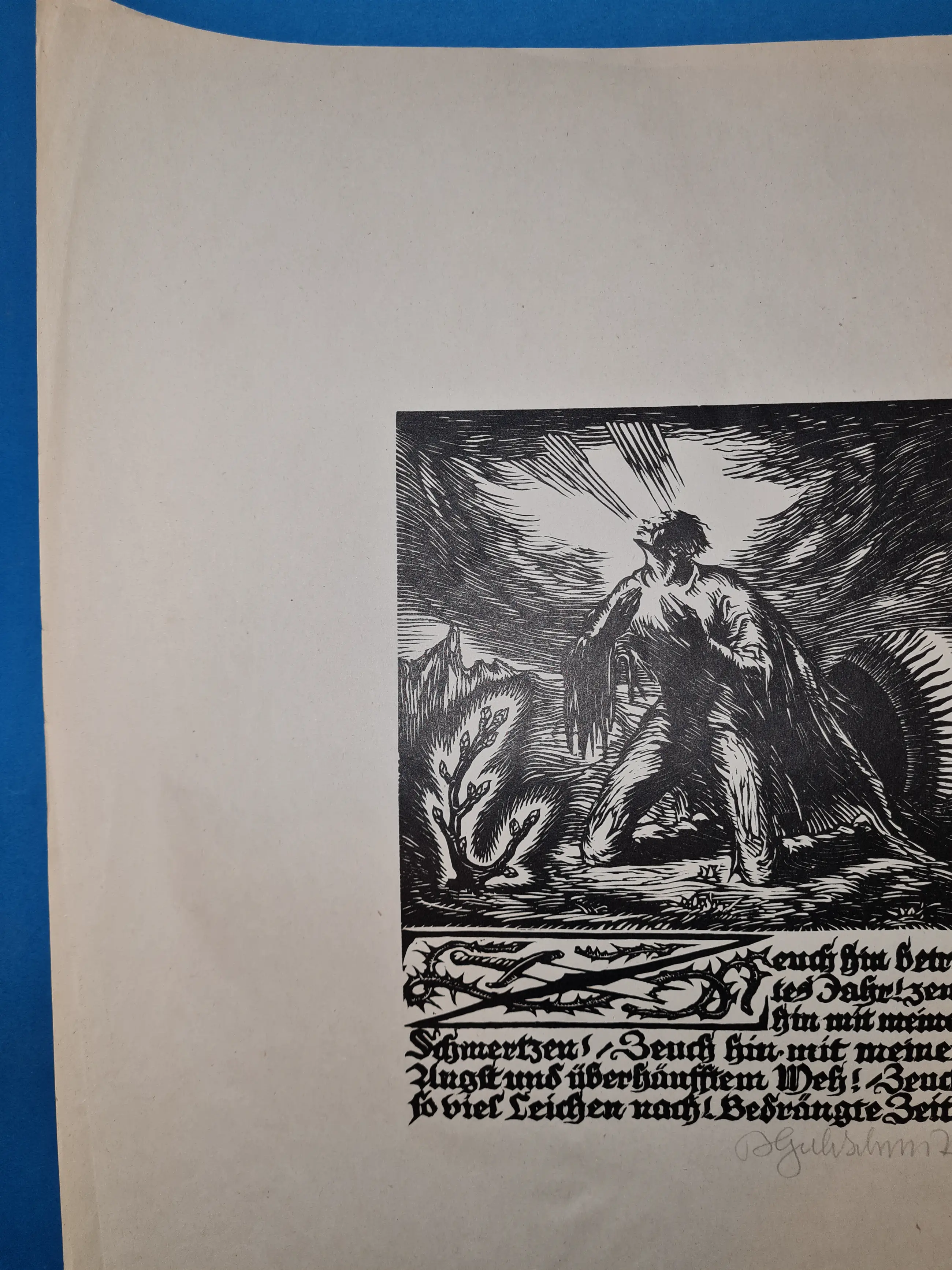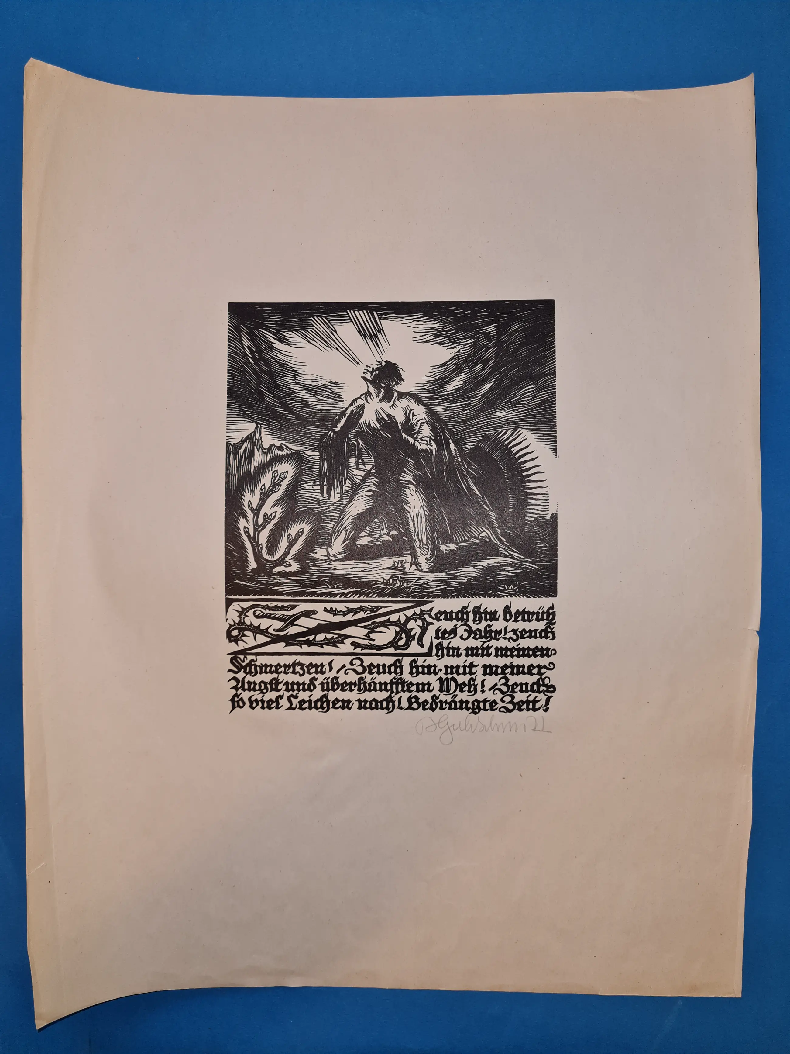 Bruno Goldschmitt - orig. Holzschnitt mit Spruch / Klage nach Krieg
