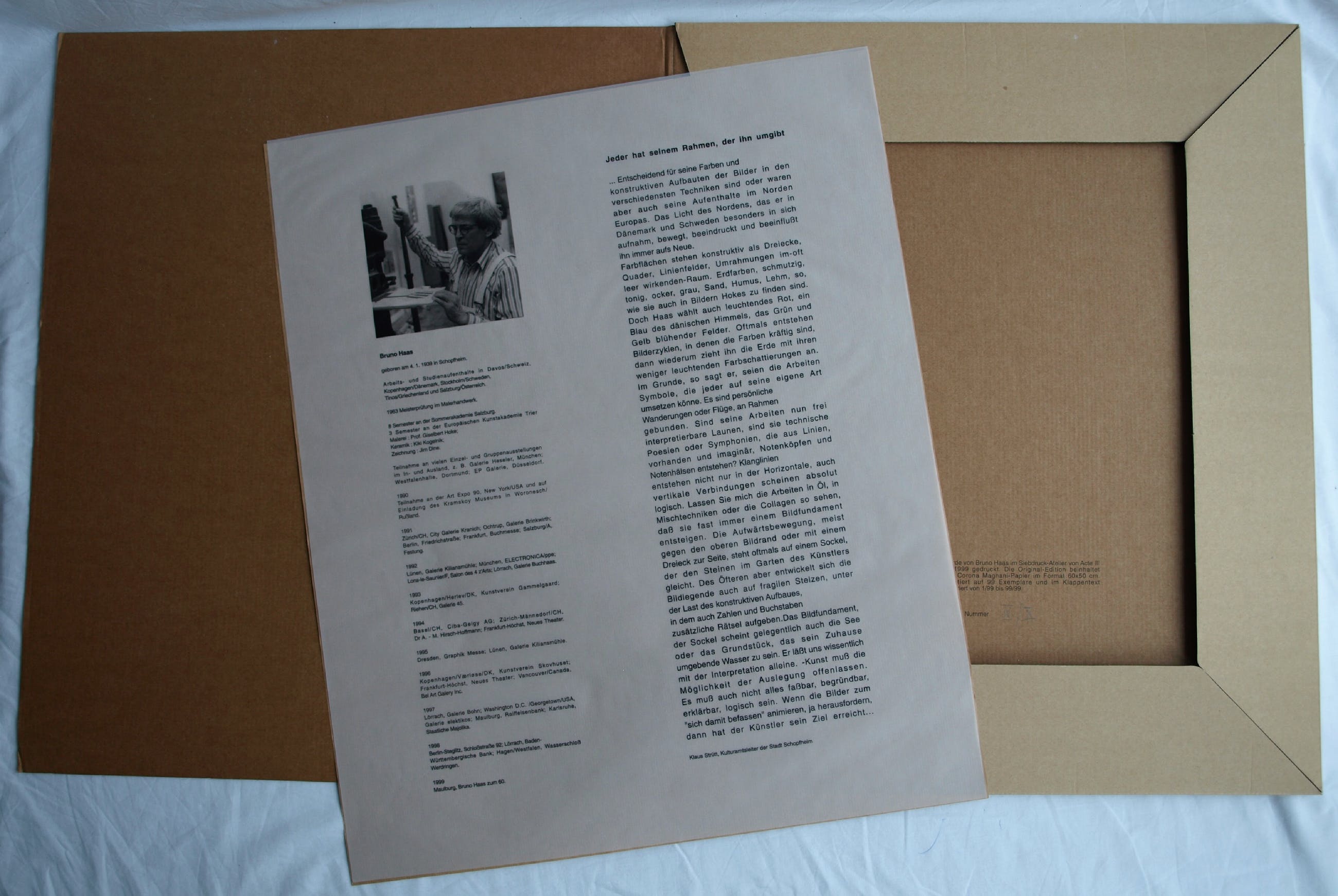 -Met informatie, afgedrukt op vloeipapier, geschreven door Klaus Strütt (hoofd Culturele Zaken van de gemeente Schopfheim, de geboortestad van de kunstenaar).
