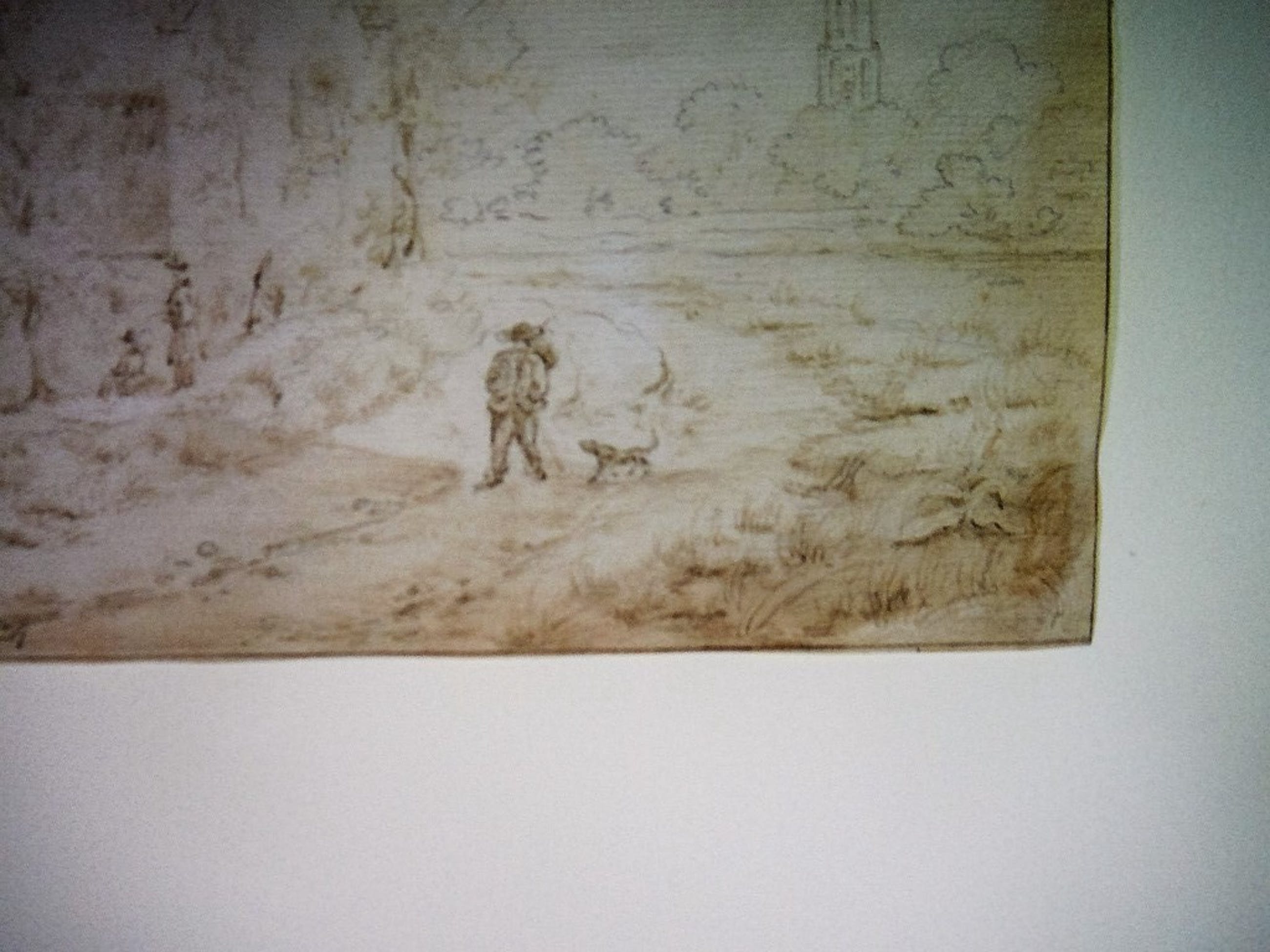 Tekening in bruine inkt landschap met personen en huis door Bruno van Straaten 1786 - 1870