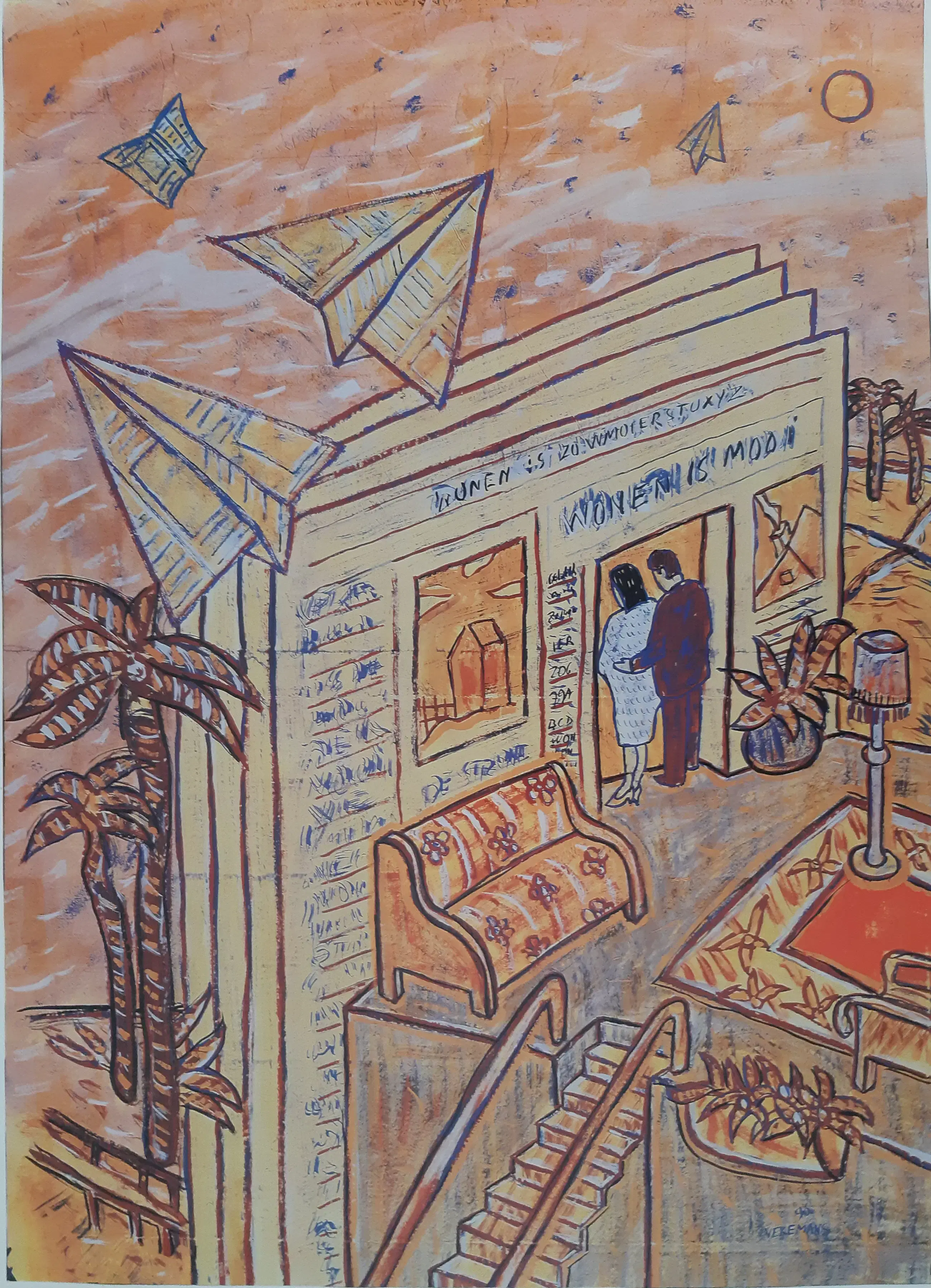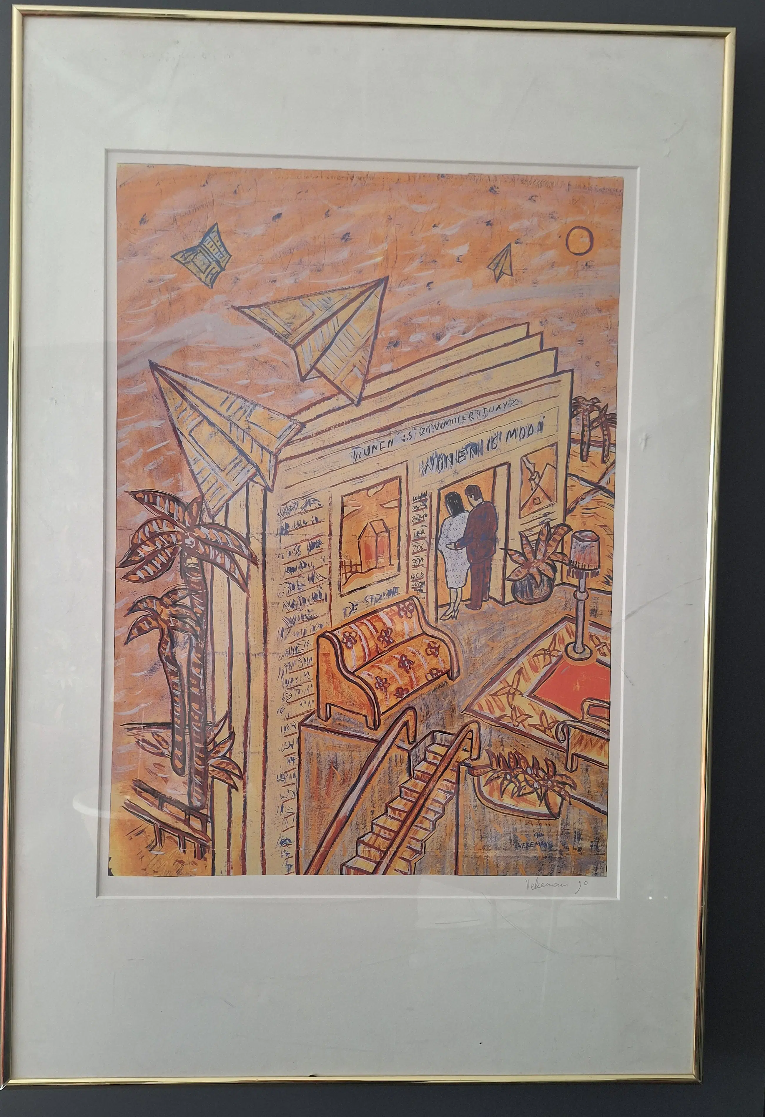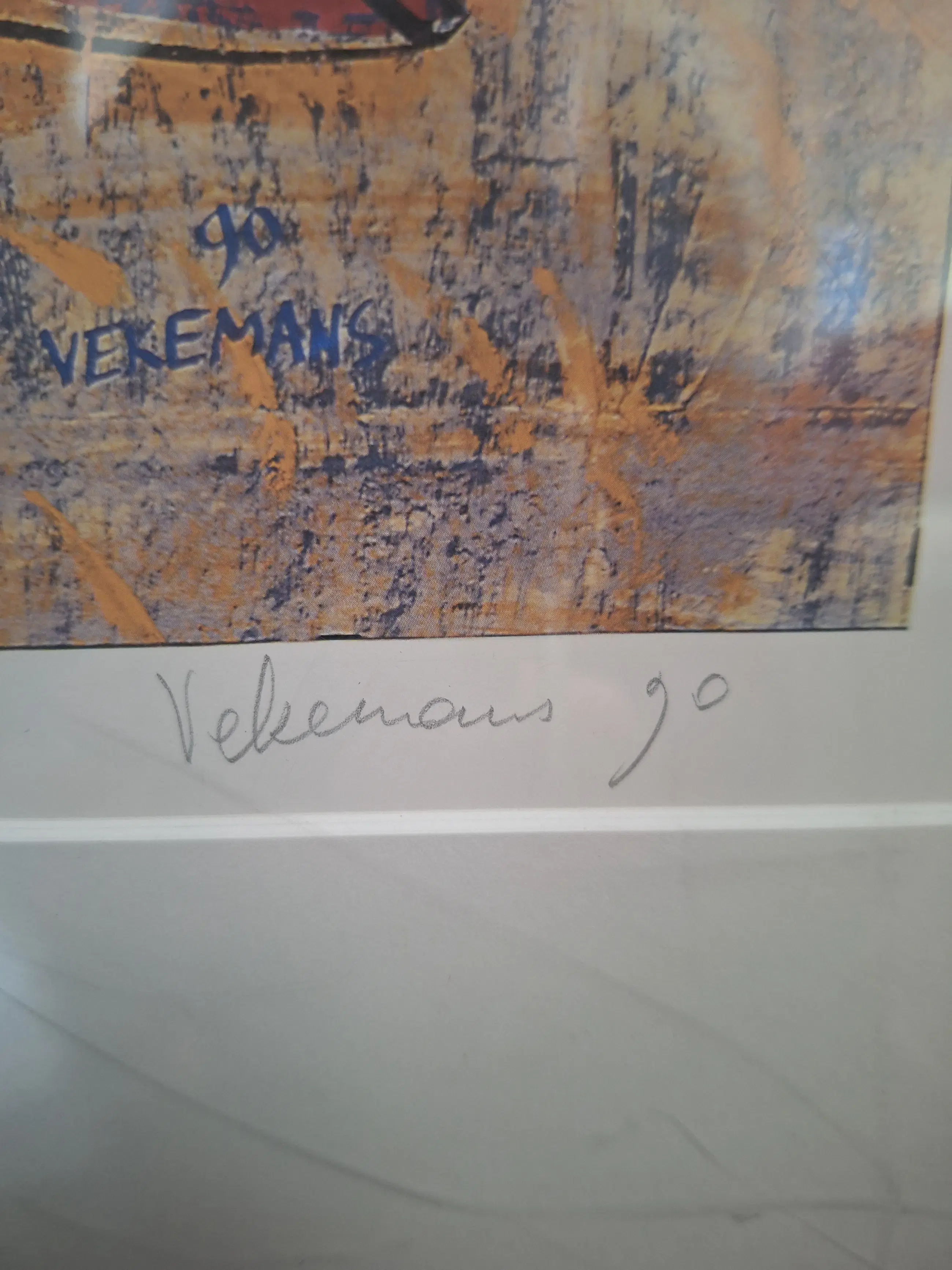 Zeefdruk van Bruno Vekemans, ingelijst en gesigneerd. Conditie van afbeelding is uitstekend, de glasplaat heeft enkele krassen.