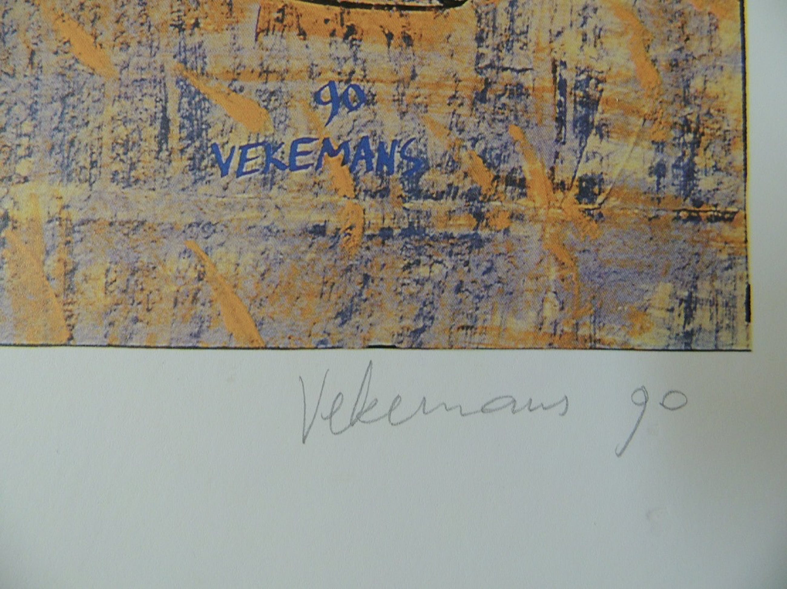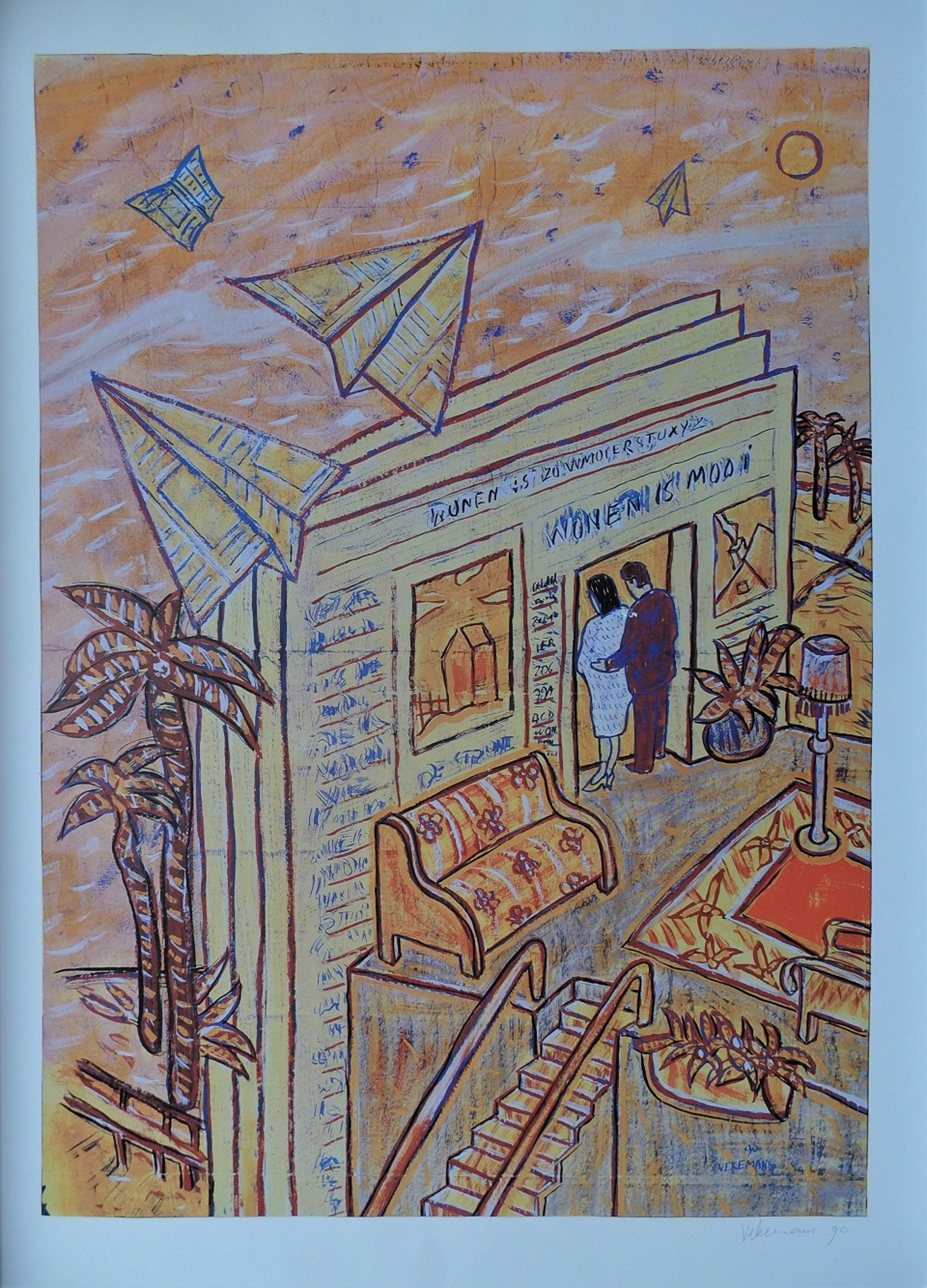Kunstenaar: Bruno Vekemans; Techniek: zeefdruk Titel: wonen is mooi; Afmetingen 50 x 70 cm Ingelijst; gesigneerd in de plaat en met potlood;