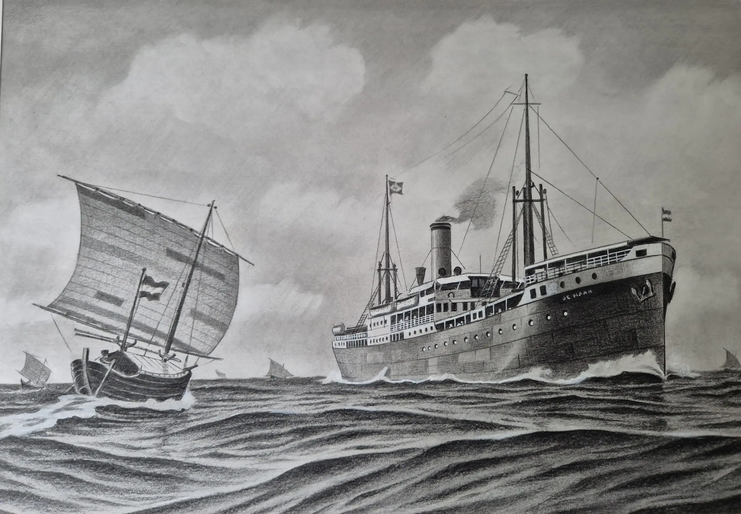 Oude K.P.M. stomer (type de Haan) + Inheemse Prauwen in de Javazee.