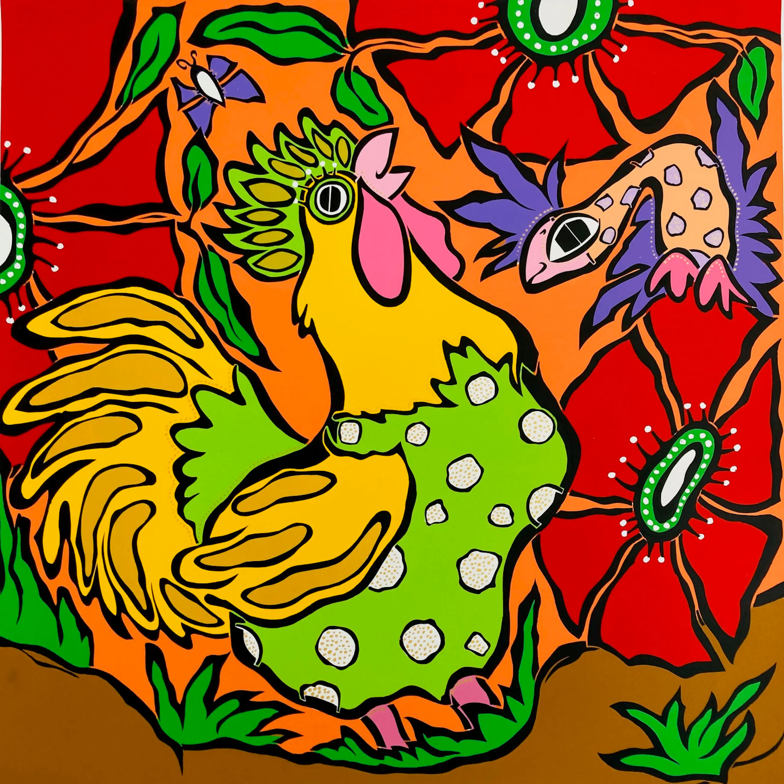 Vrolijke zeefdruk van Caja Wong Chung. Het werk is in goede staat. Het bedrukte deel is 60 x 60 cm groot.