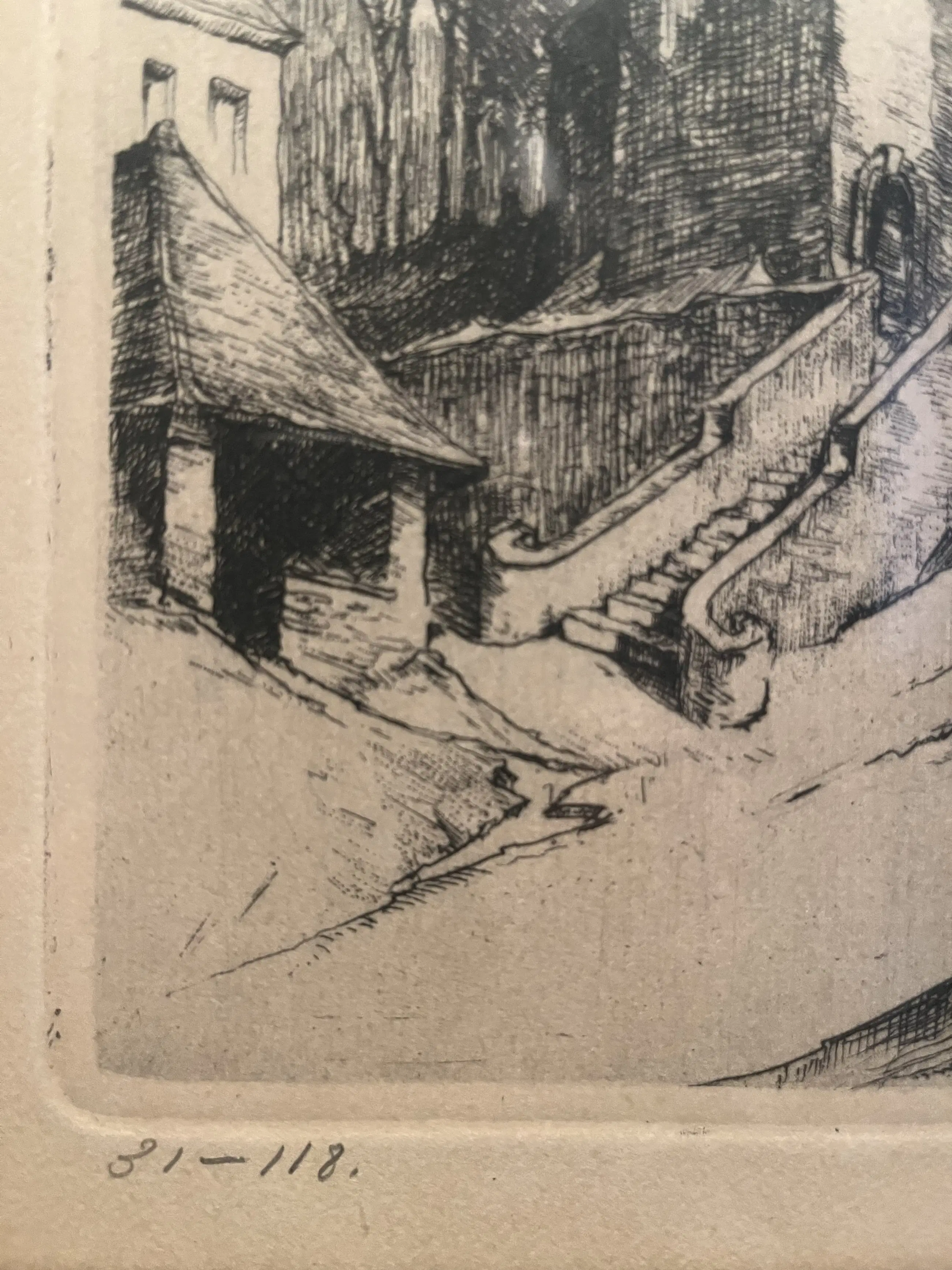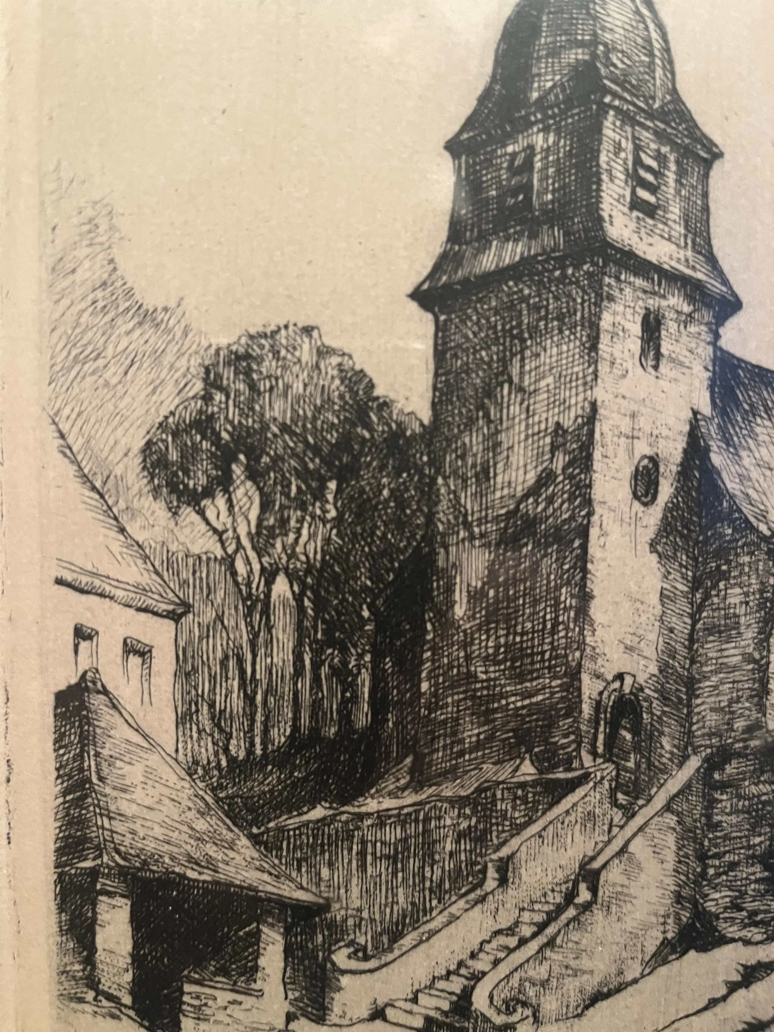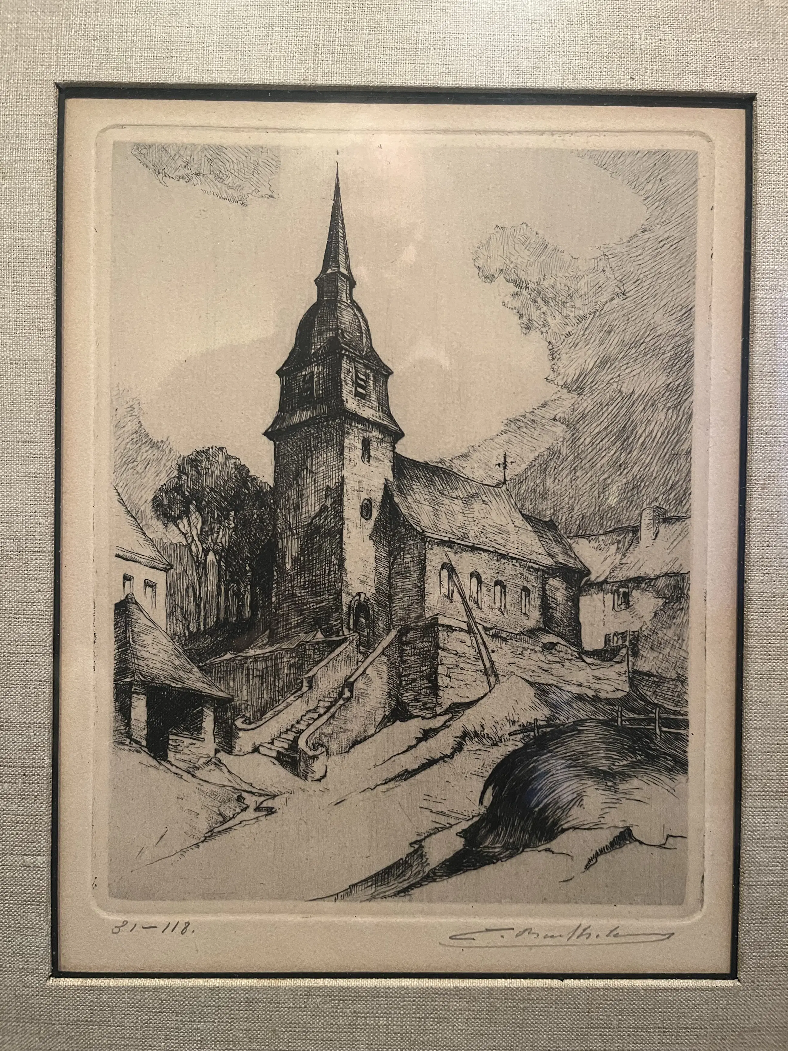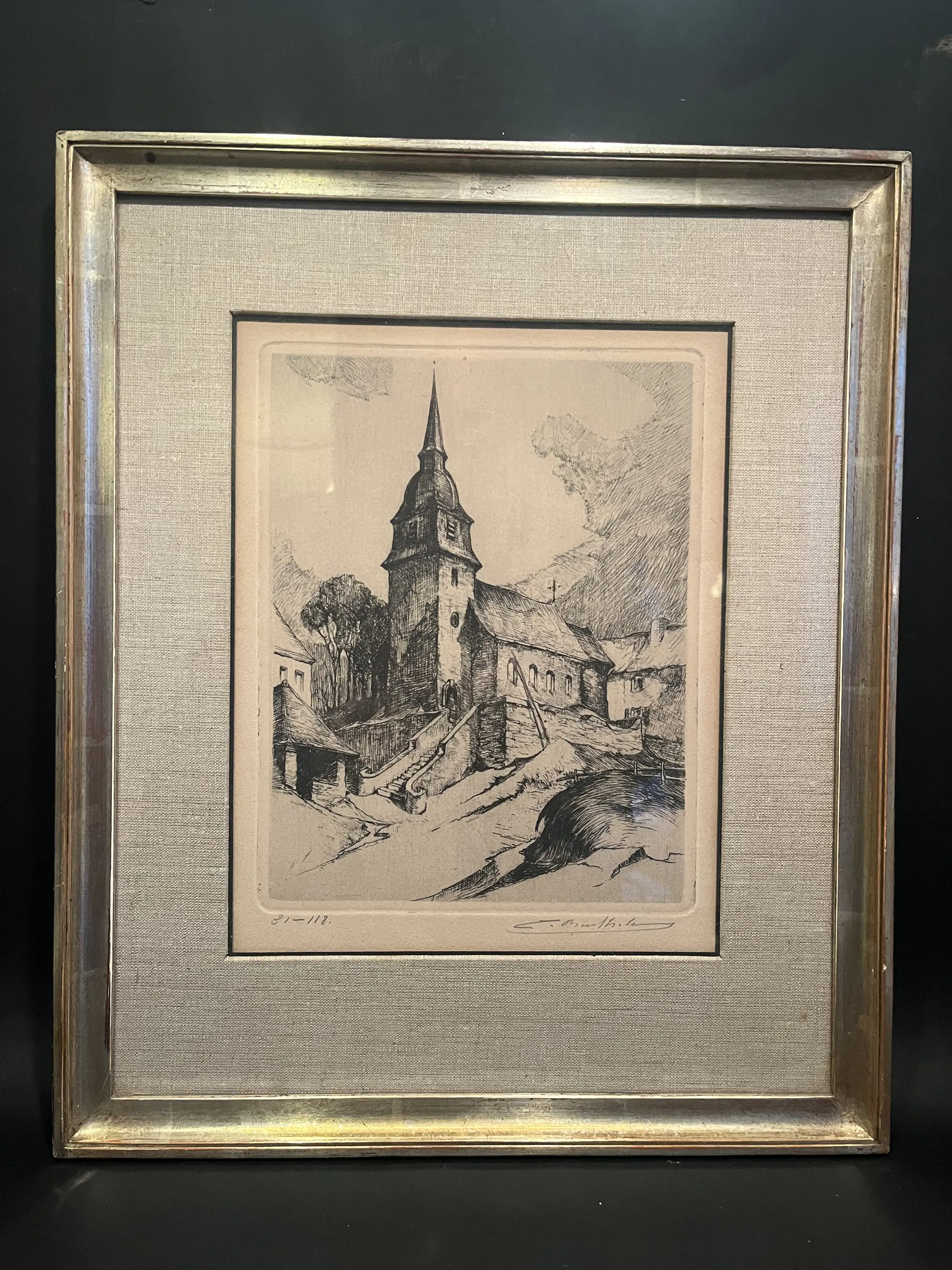 kunstwerk is een originele, gesigneerde ets van de Belgische kunstenaar Camille Barthélemy (1890–1961), bekend om zijn landschappen en etsen van Belgische kerken en dorpen. Vermoedelijk Waals kerkje. Getekend en genummerd 31 van 118 In houten kader met glas