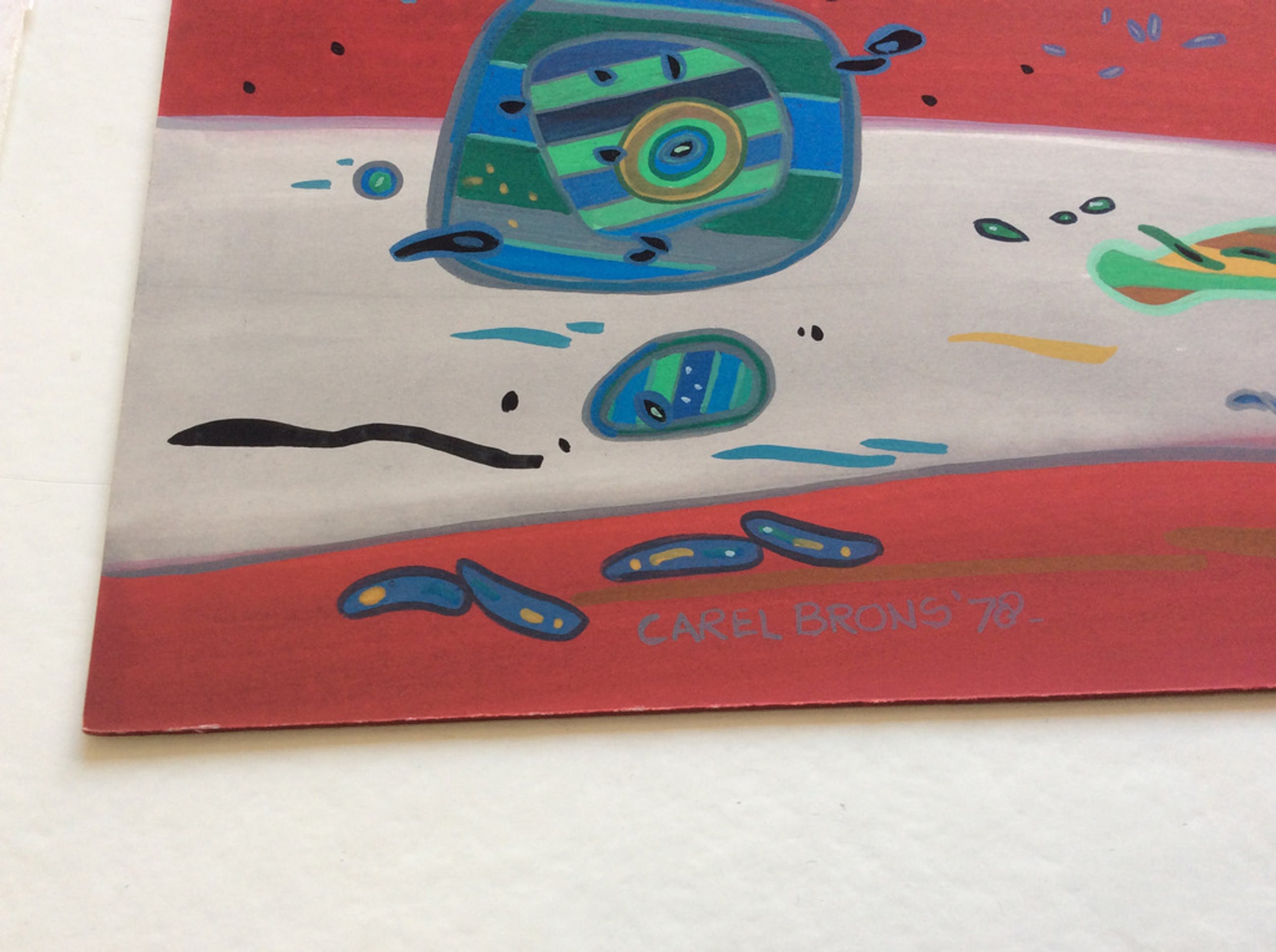 Carel Brons: abstracte voorstelling met figuren - gouache op stevig karton. Hand gesigneerd en gedateerd '78 l.o. Formaat 42 x 32 cm.