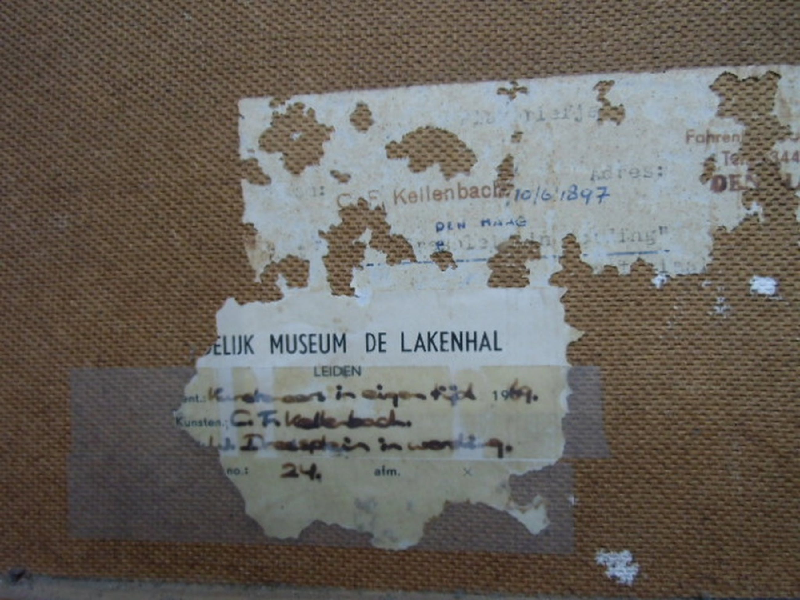 Herkomst : van een tentoonstelling in Stedelijk Museum De Lakenhal in Leiden (zie etiket)