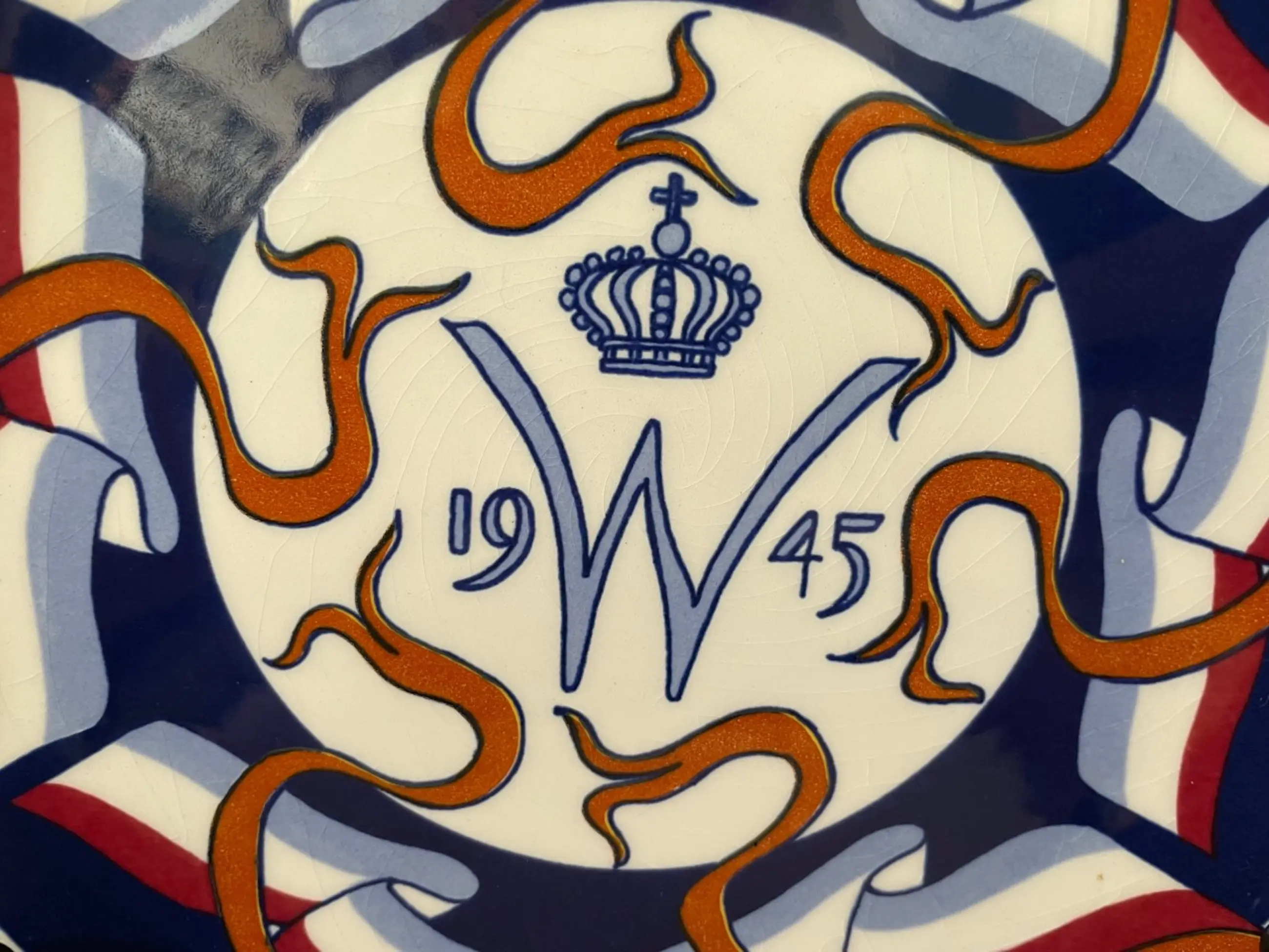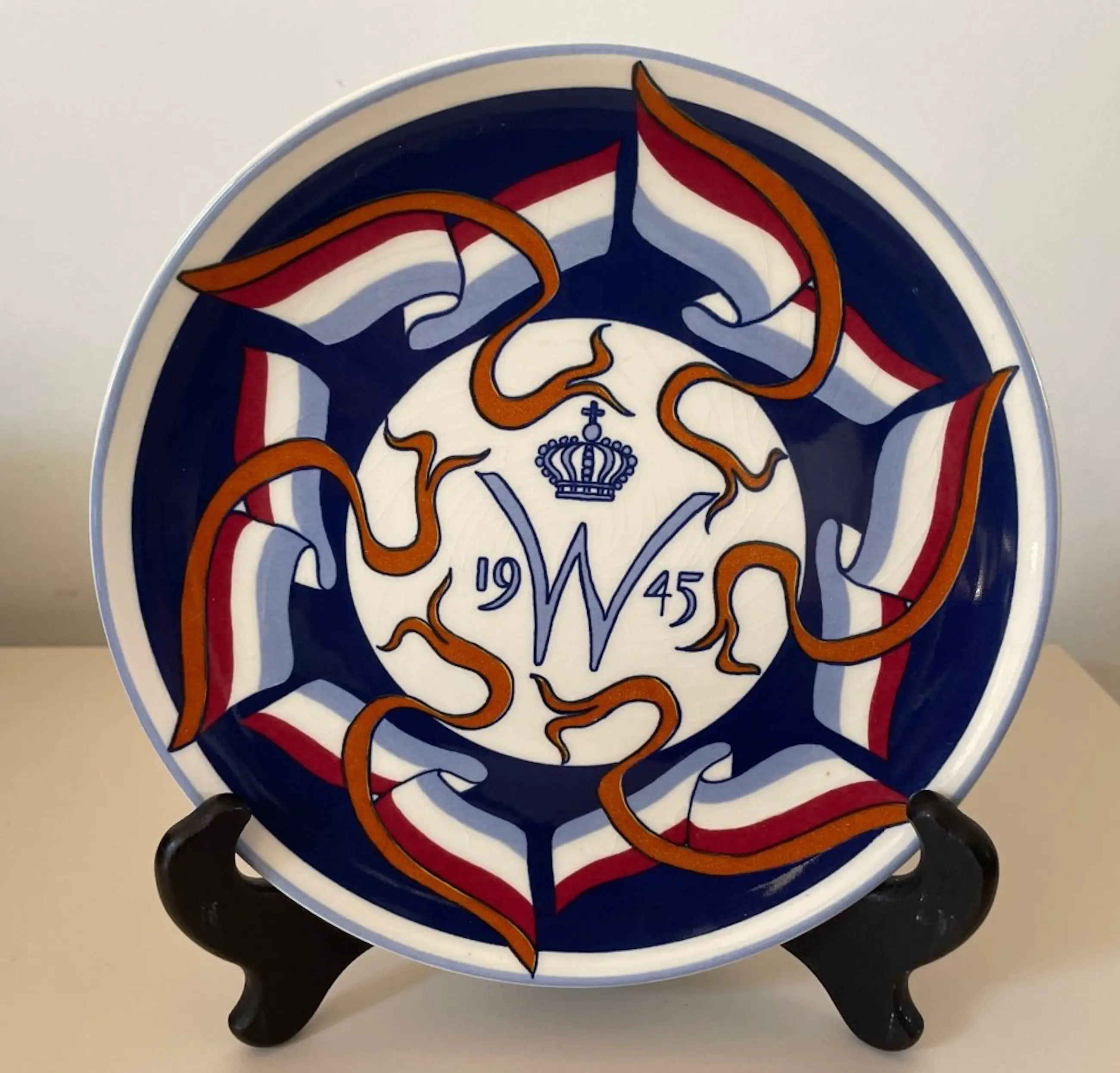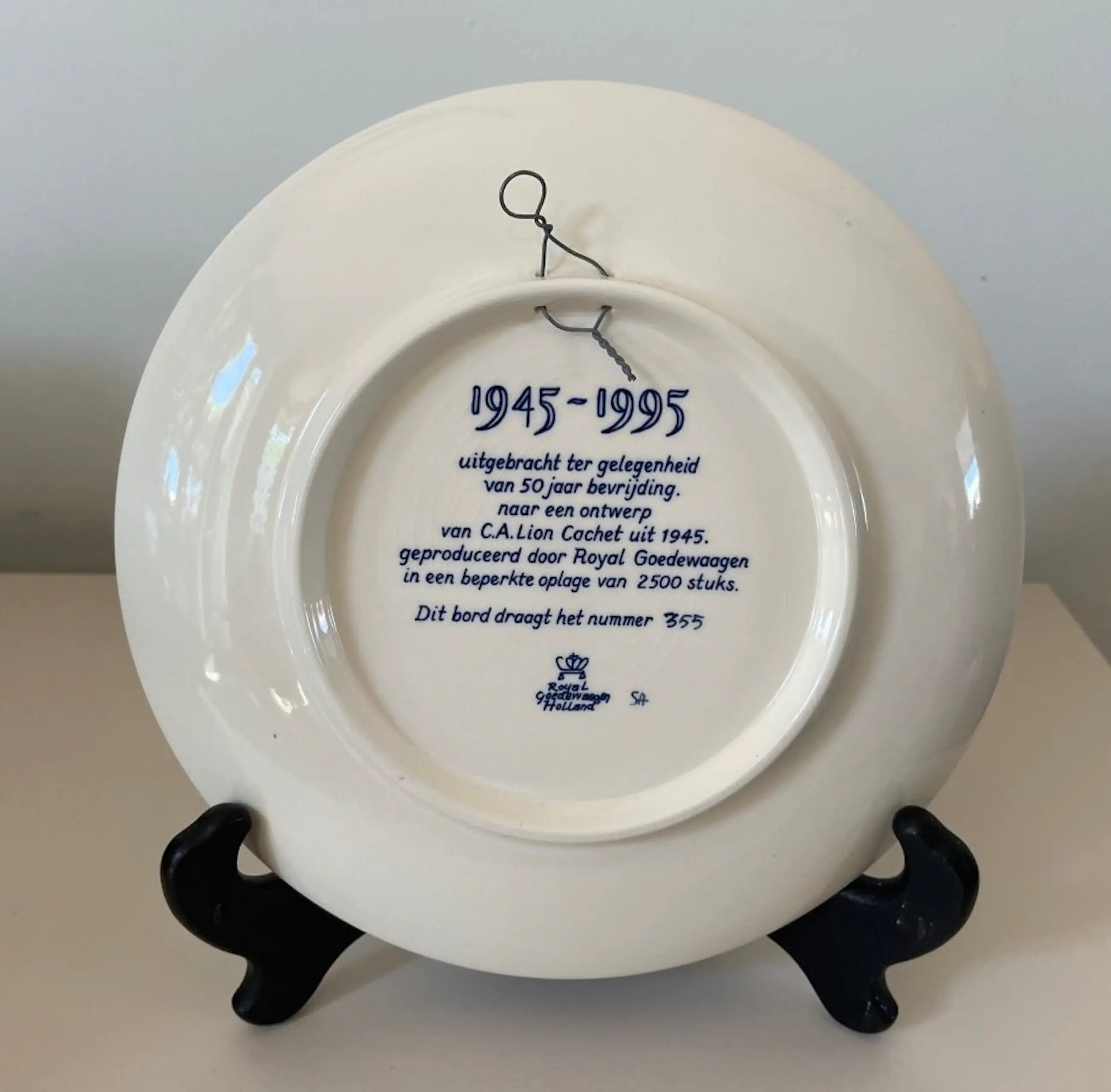 Platelen wandbordje 50 jaar bevrijding voor Royal Goedewaagen - oplage 2500 stuks. Dit is nummer 355. Het ontwerp is naar een origineel ontwerp van Carel Lion Cachet. In onbeschadigde conditie, heeft alleen wat lichte craquele. Aan de achterzijde gemerkt.
