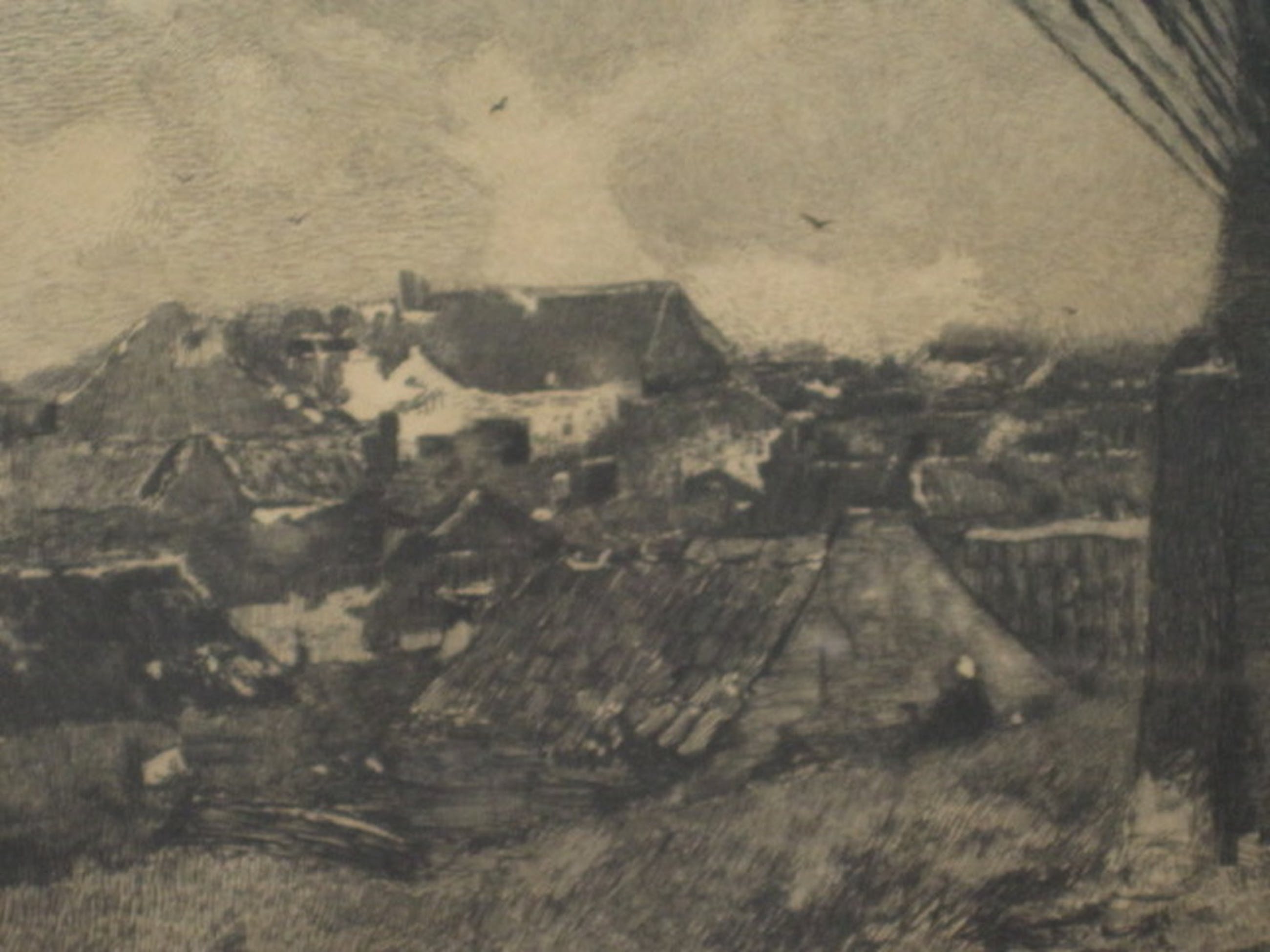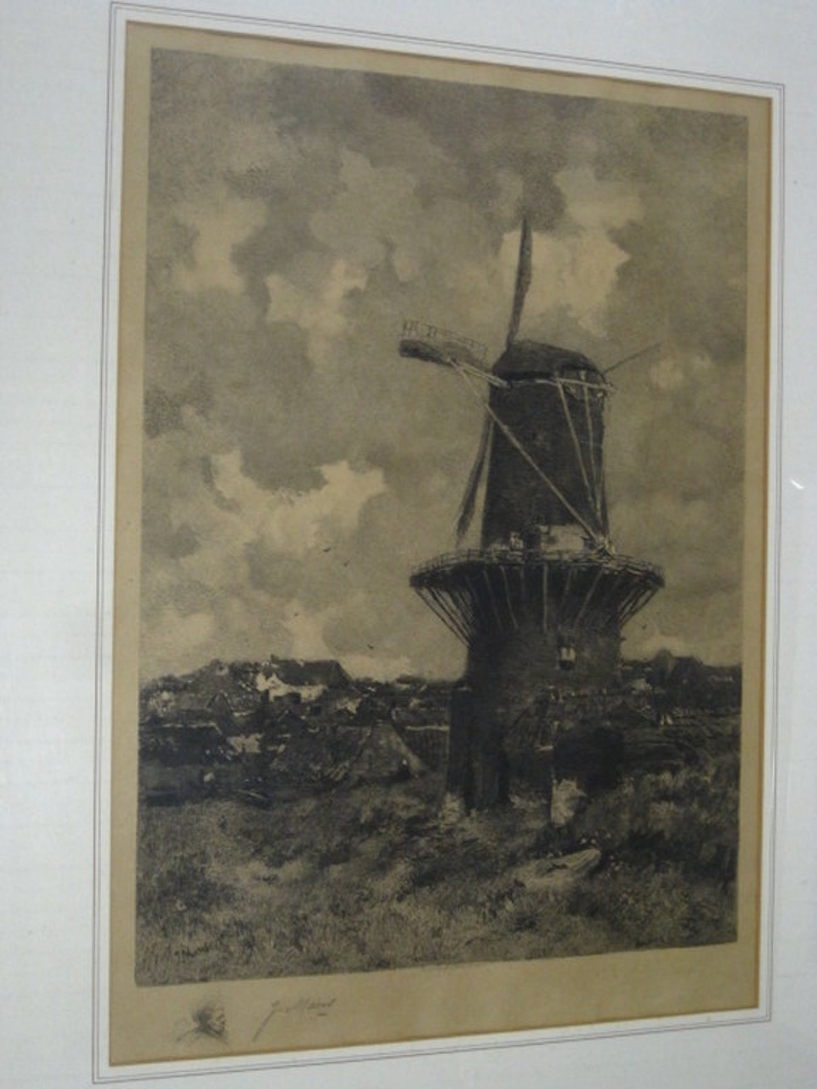 Een zeer grote ingelijste ets, in ‘1ste staat’, van Dake naar een werk van Jacob Maris uit ca 1860