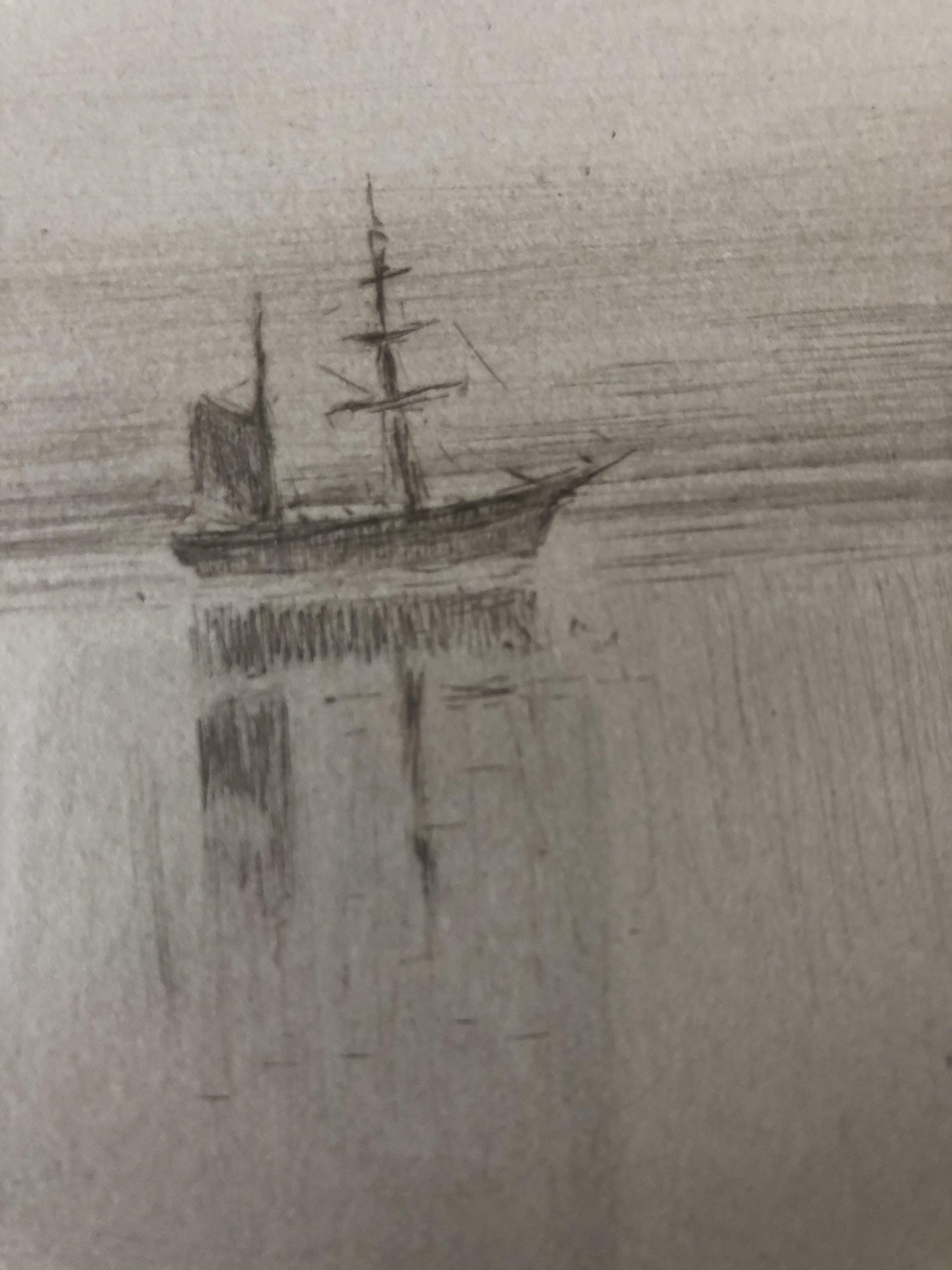 Ets van diverse zeilschepen en een motorschip op de Schelde (‘s ochtends)