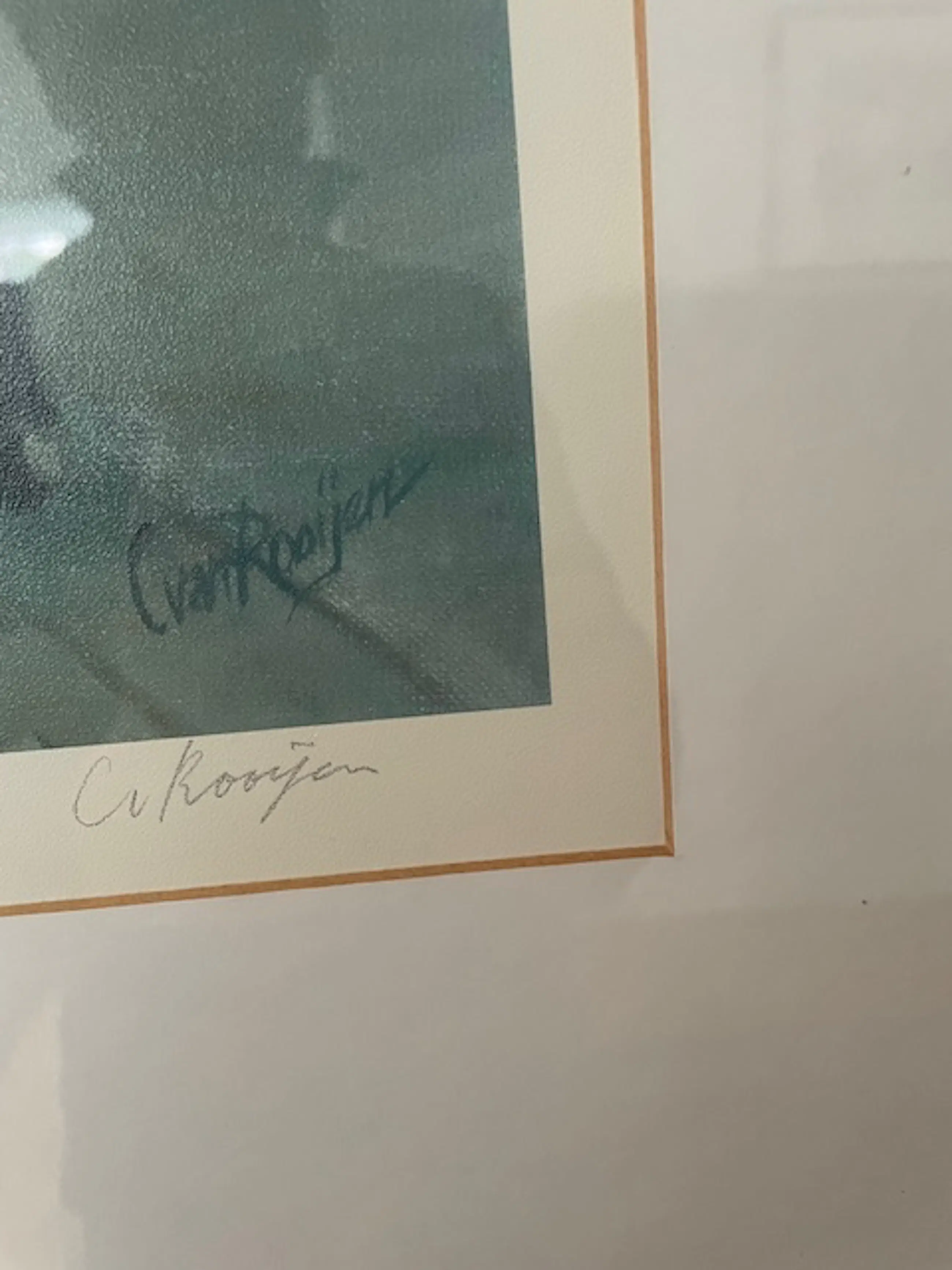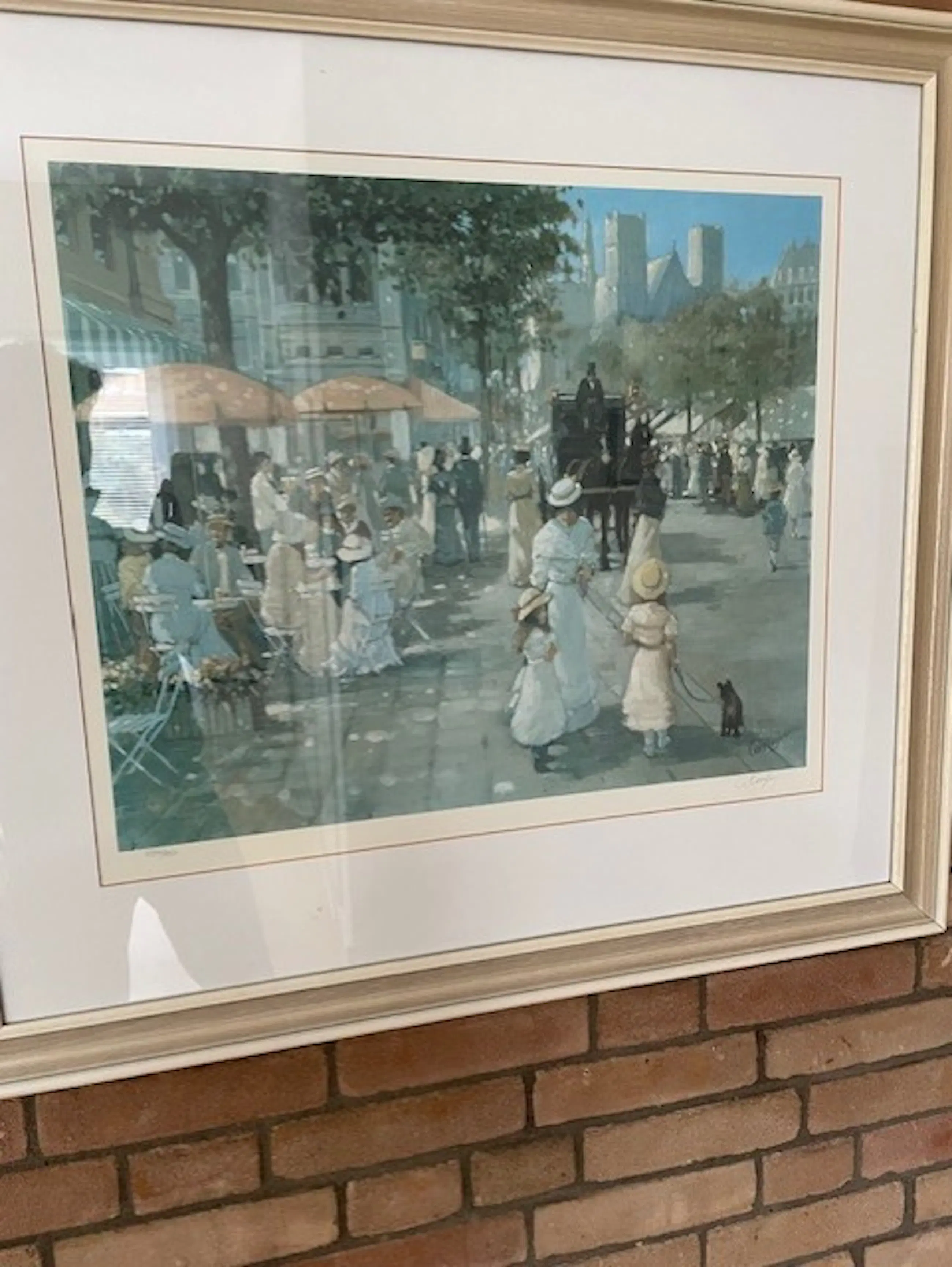 Mooie ingelijste prent van Carel van Rooijen, met handgeschreven signatuur in potlood. Voorstelling van een sfeervol stadsgezicht met terras en wandelaars, vermoedelijk Parijs. Werk verkeert in nette staat en is ingelijst achter glas.