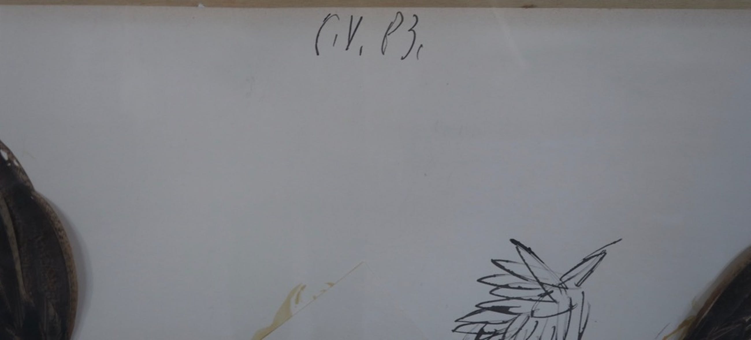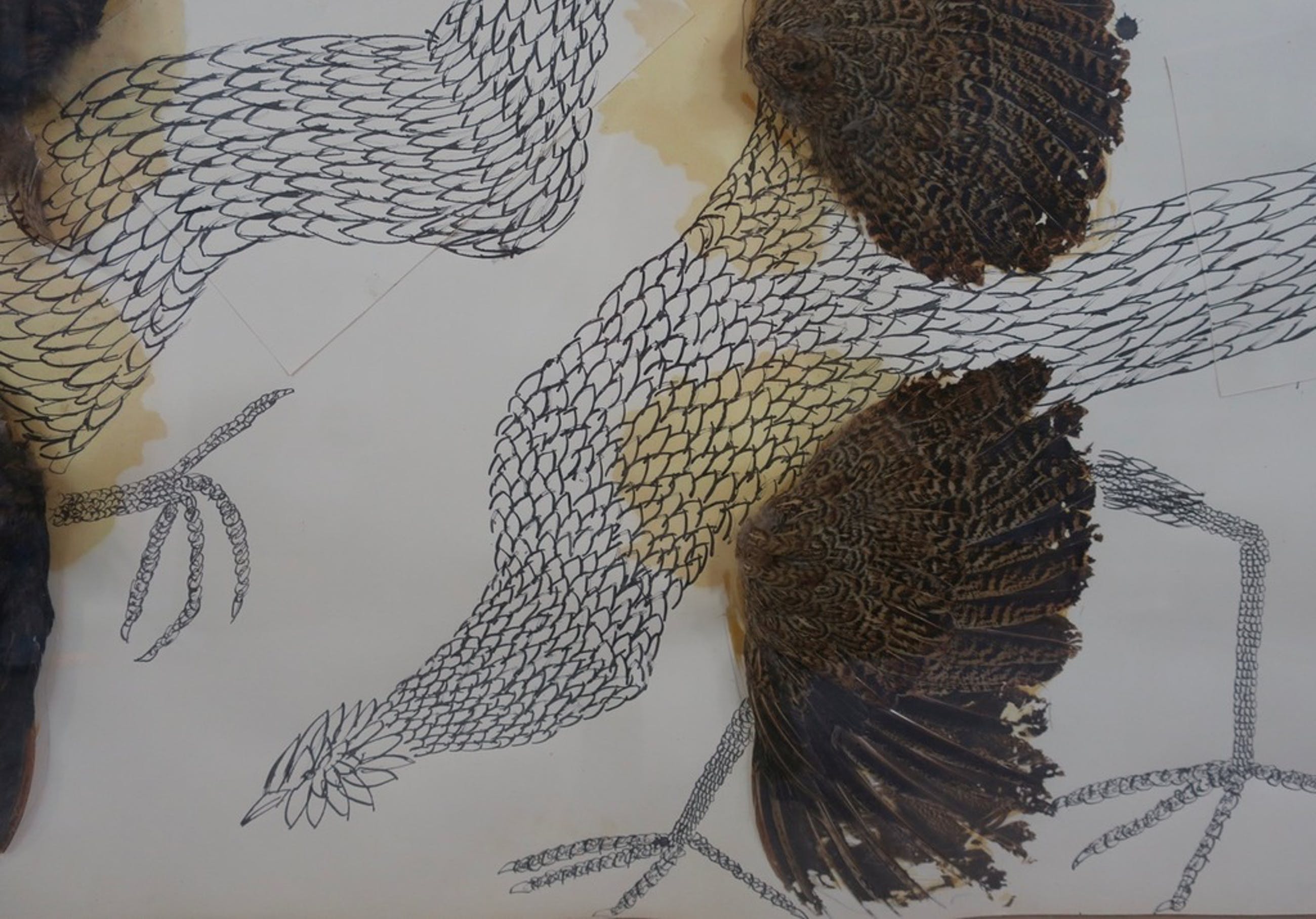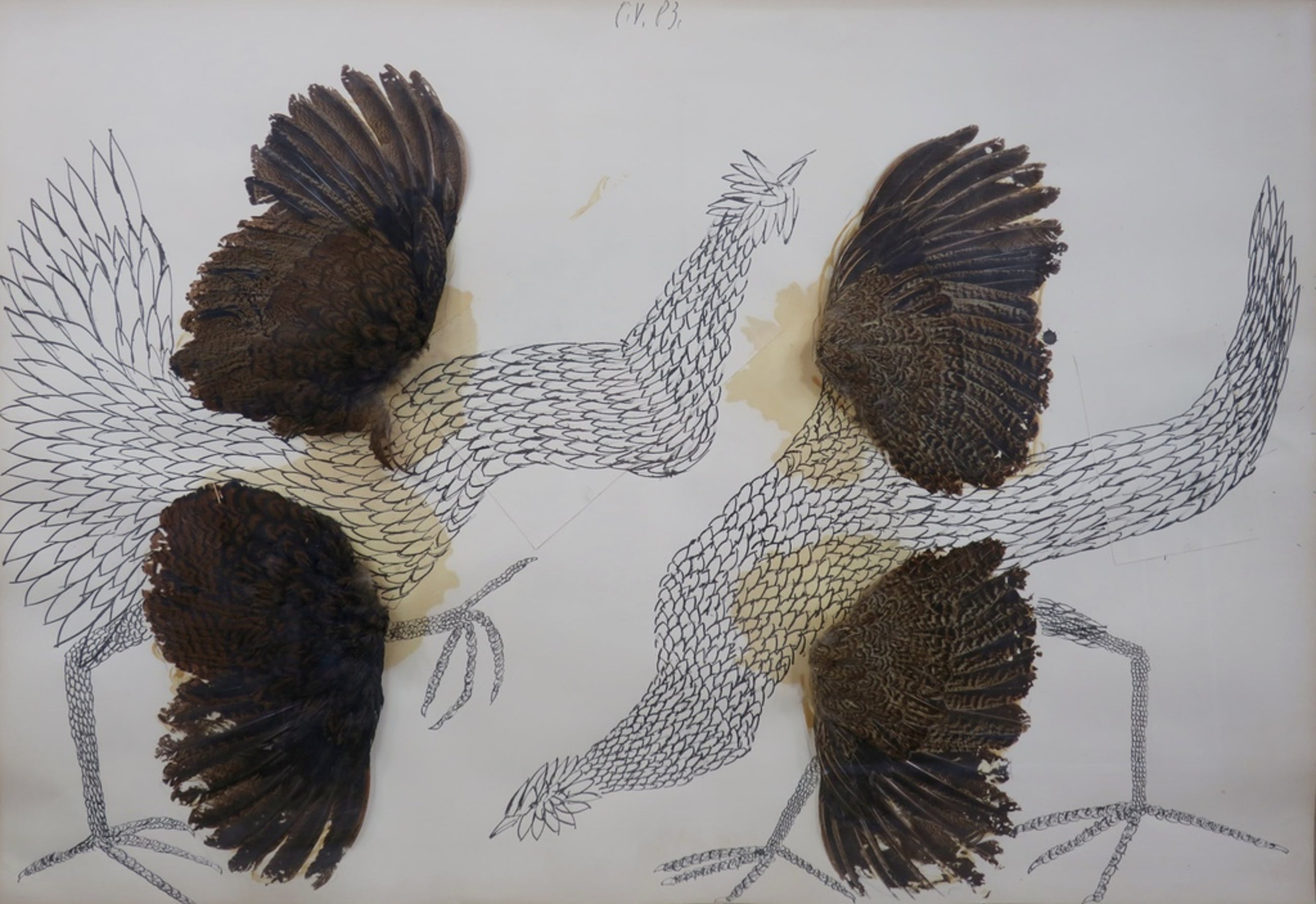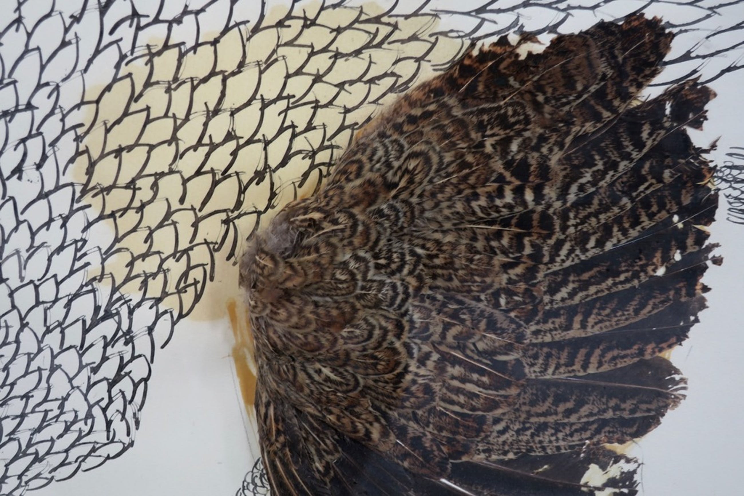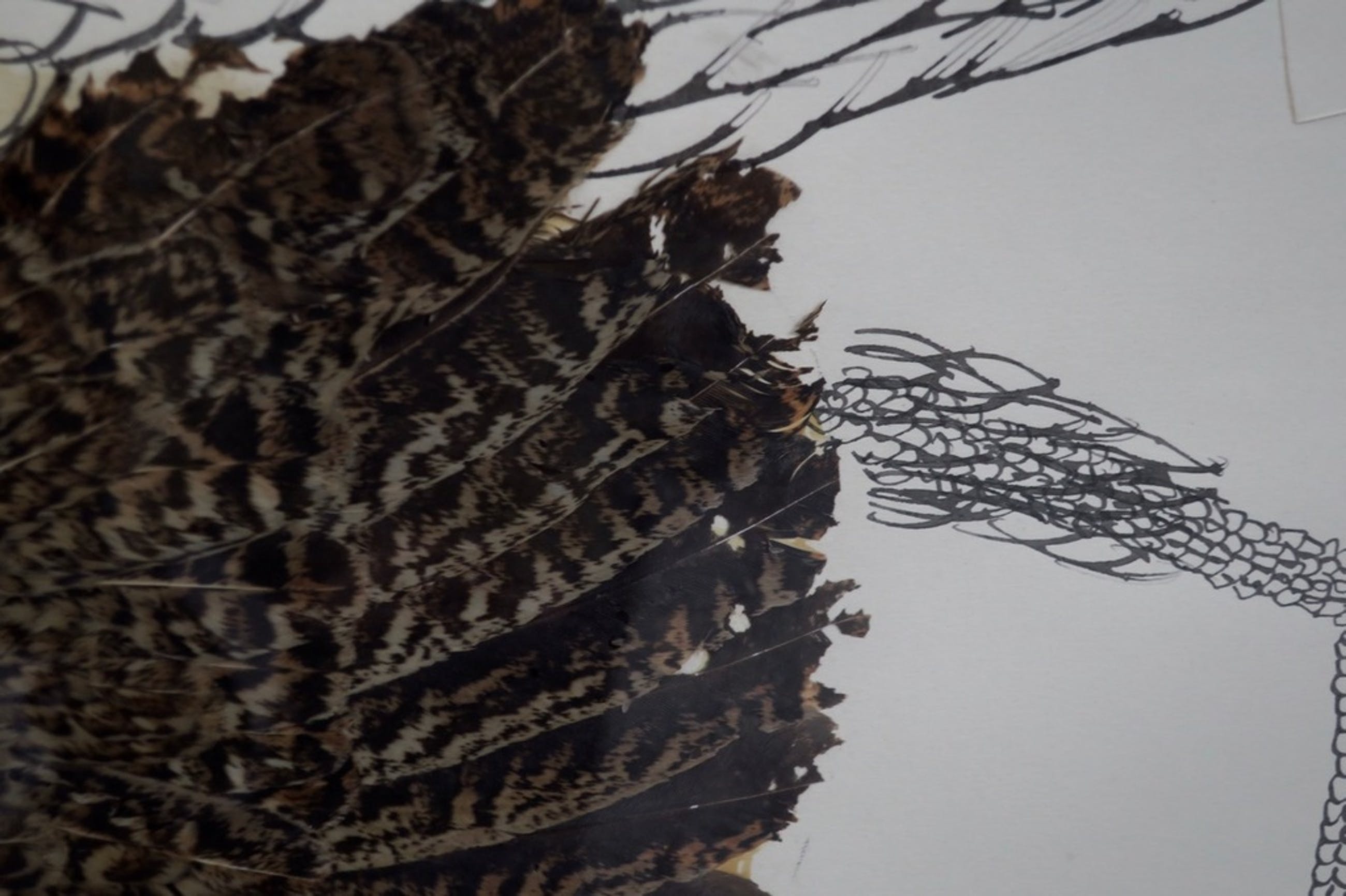 Materiaal: Gemengde techniek op papier, o.a. inkt, lijm, papier, veren