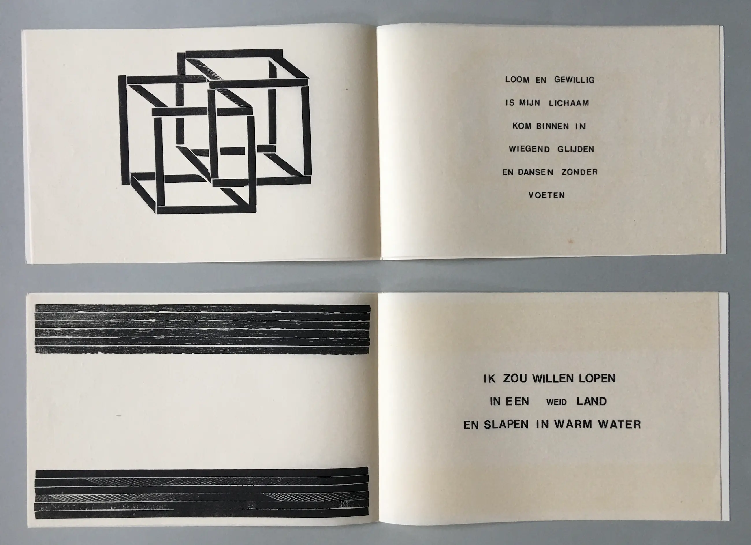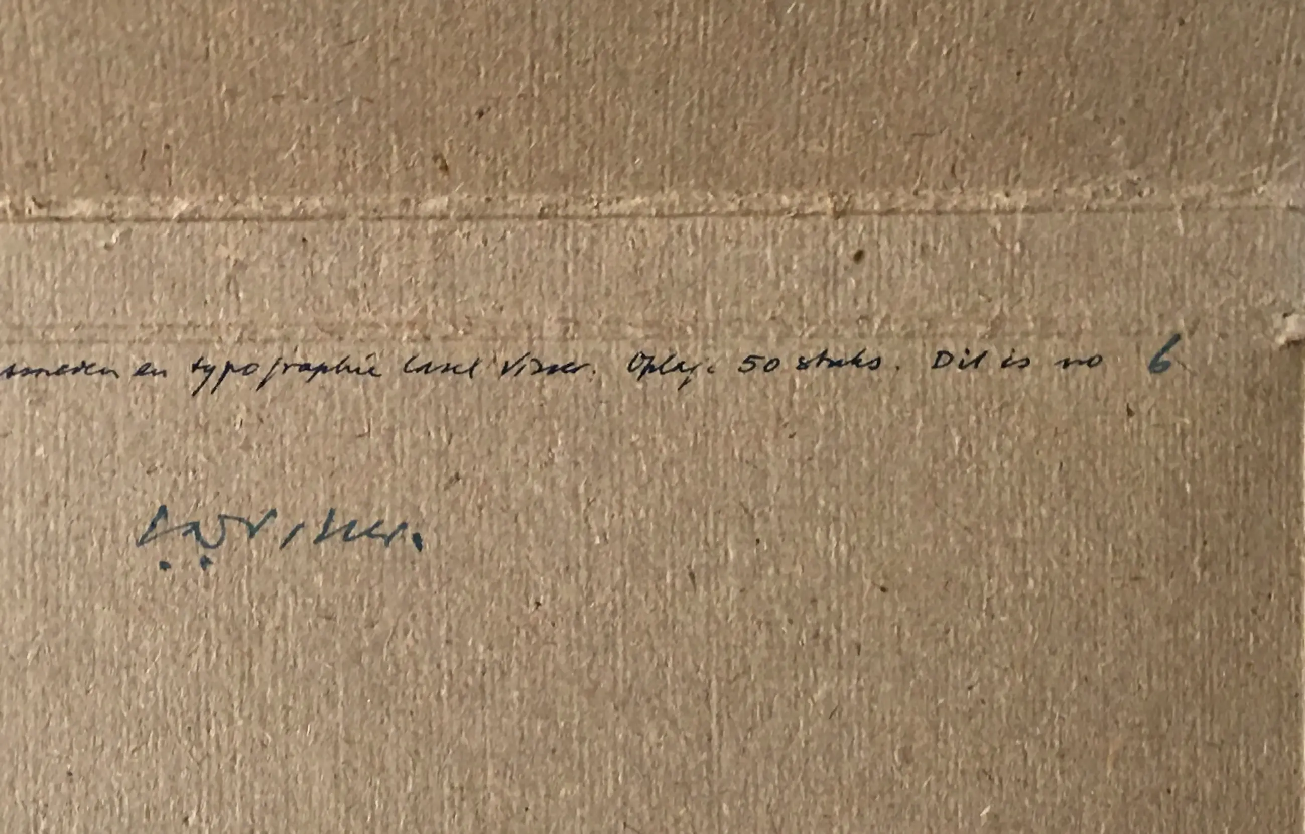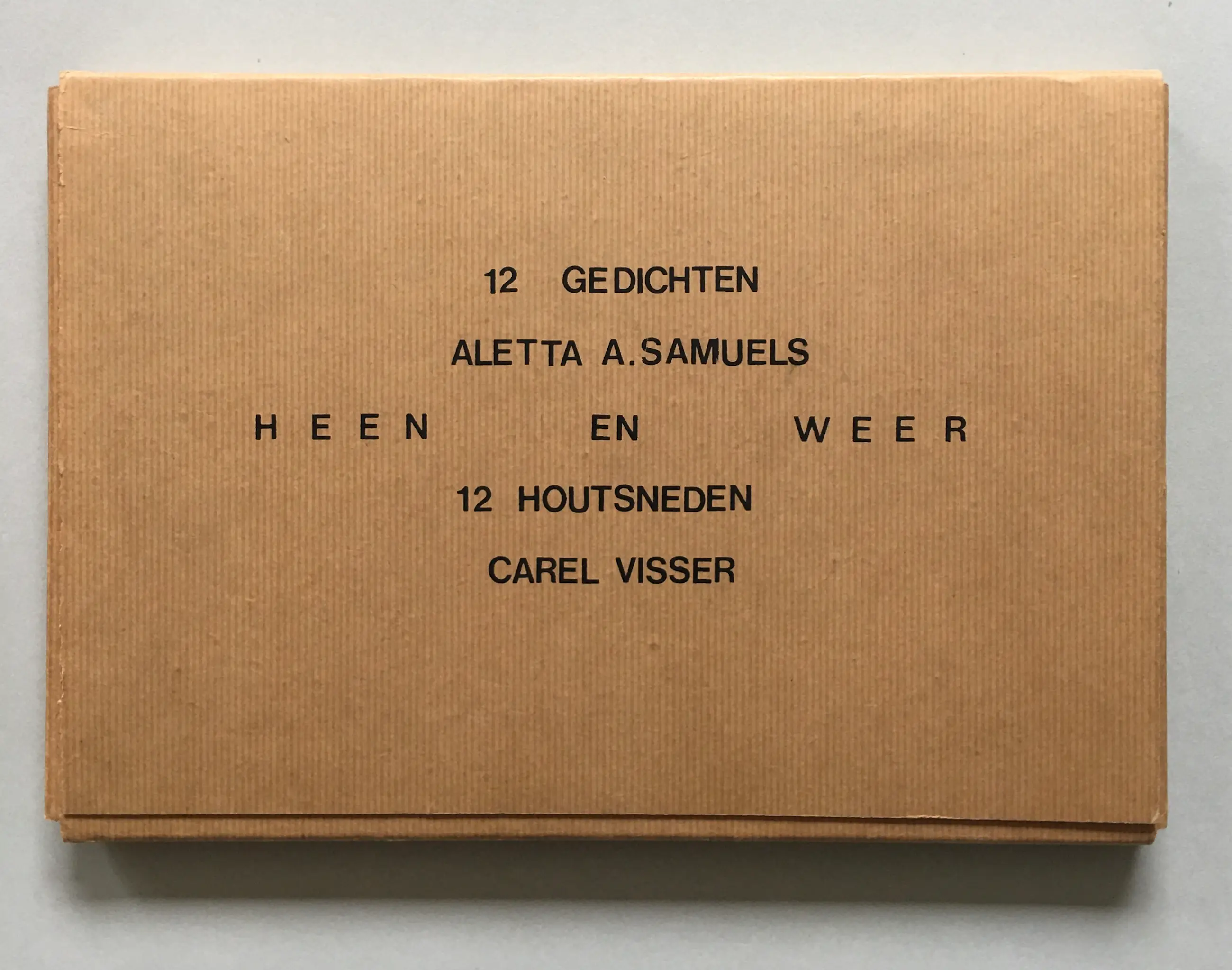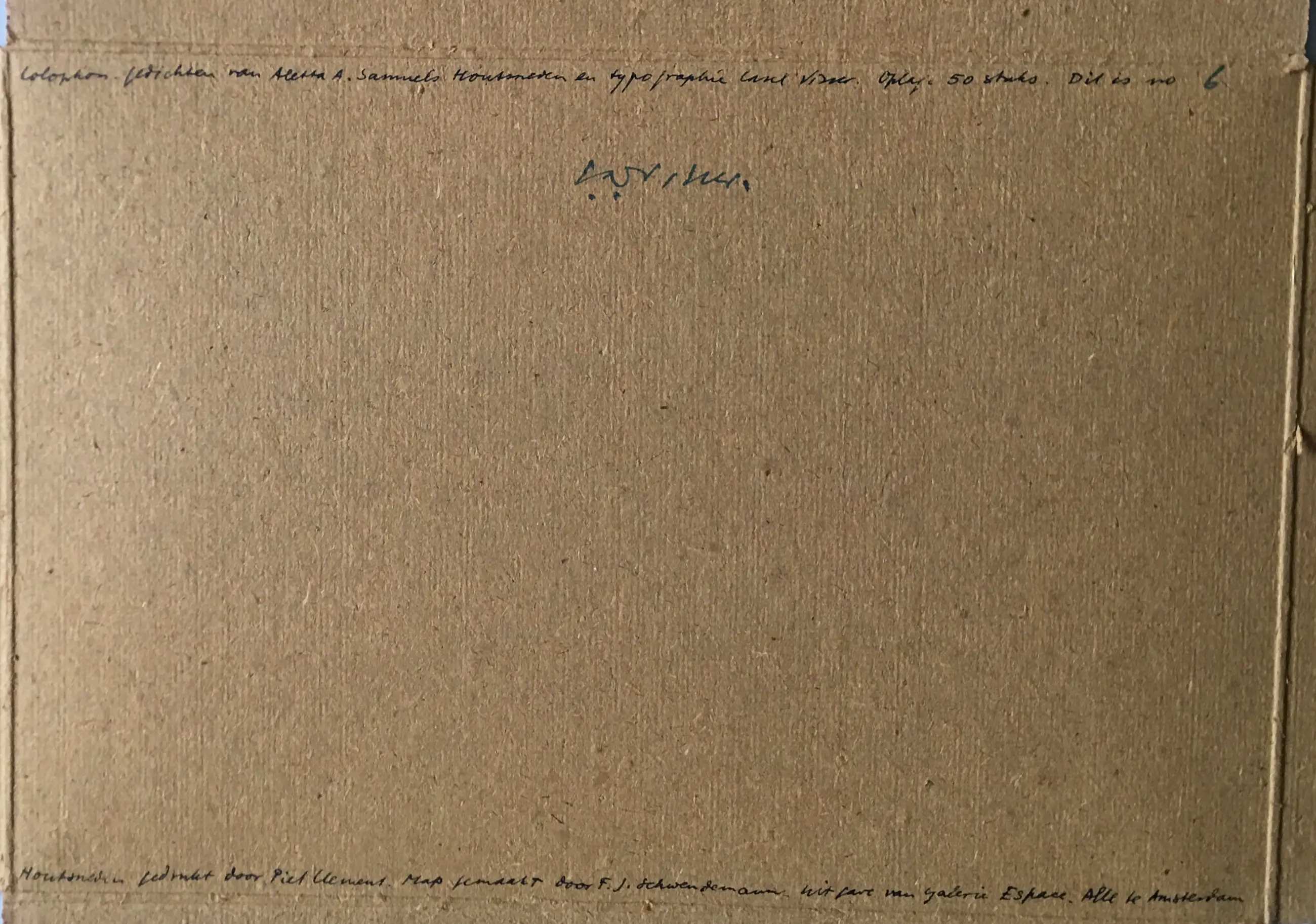 Een zeer fraaie, zeldzame uitgave door Galerie Espace uit 1970. De complete set met 12 houtsneden gecombineerd met gedichten, gedrukt op dubbele pagina’s van Japans papier. Afmetingen 20 x 30 cm. De colofon is handgeschreven door Carel Visser, dit is nummer 6 van 50. Gedrukt door Piet Clement.