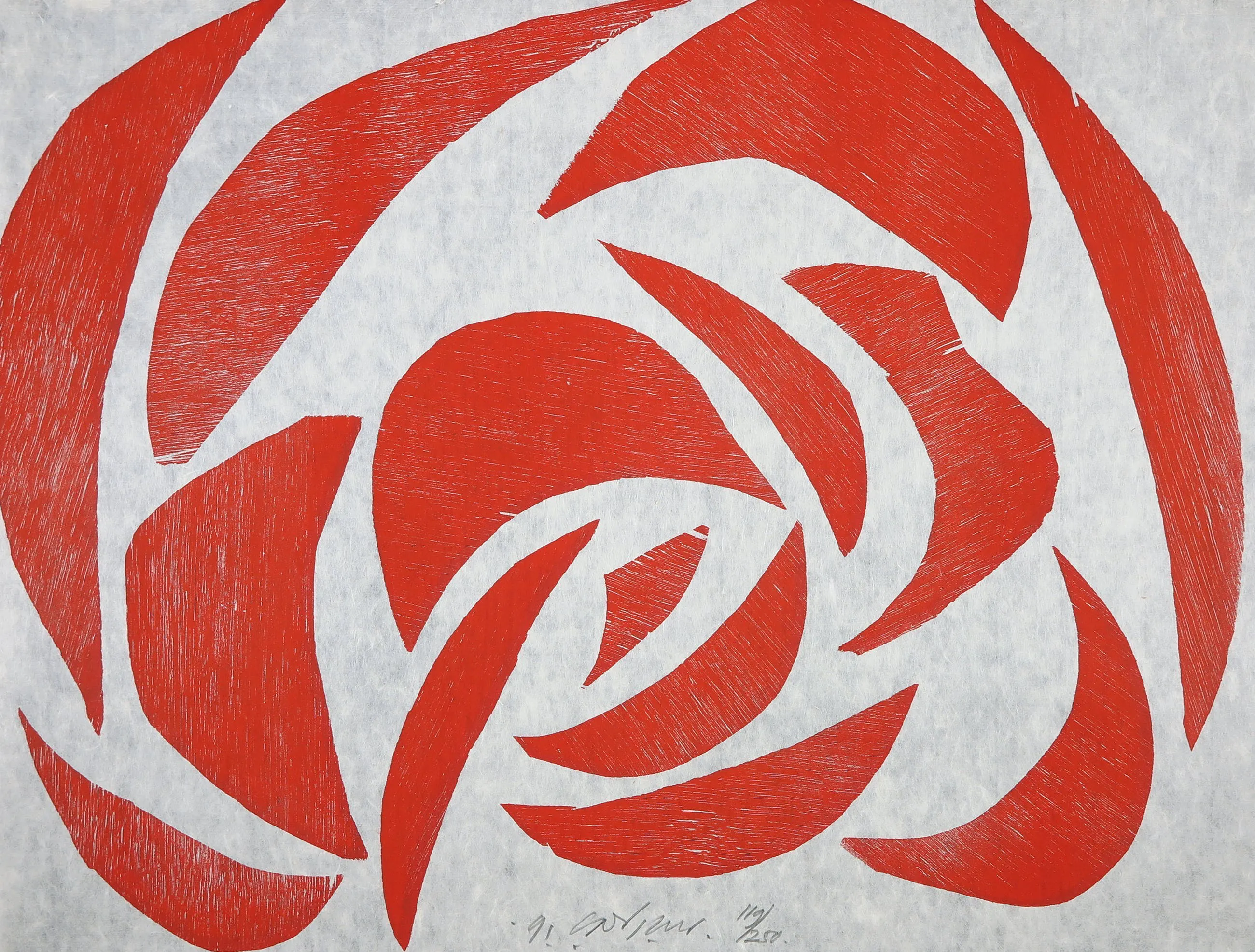 Mooie abstracte houtdruk op Japans papier door Carel Visser, in een oplage van 250 stuks.
