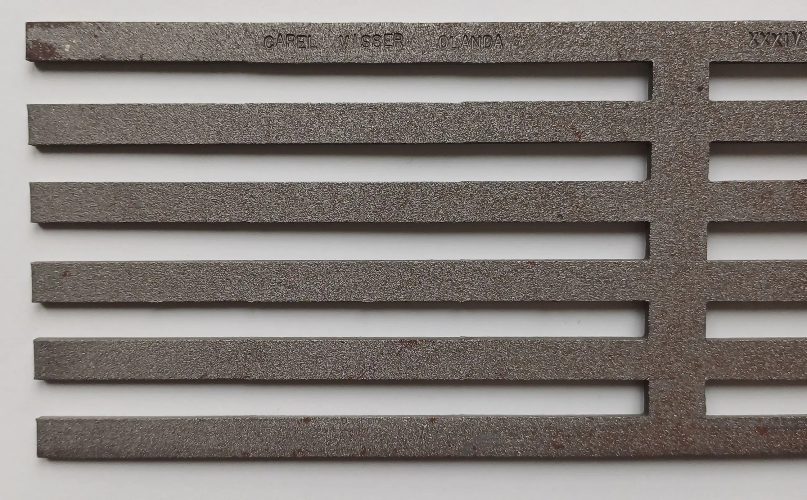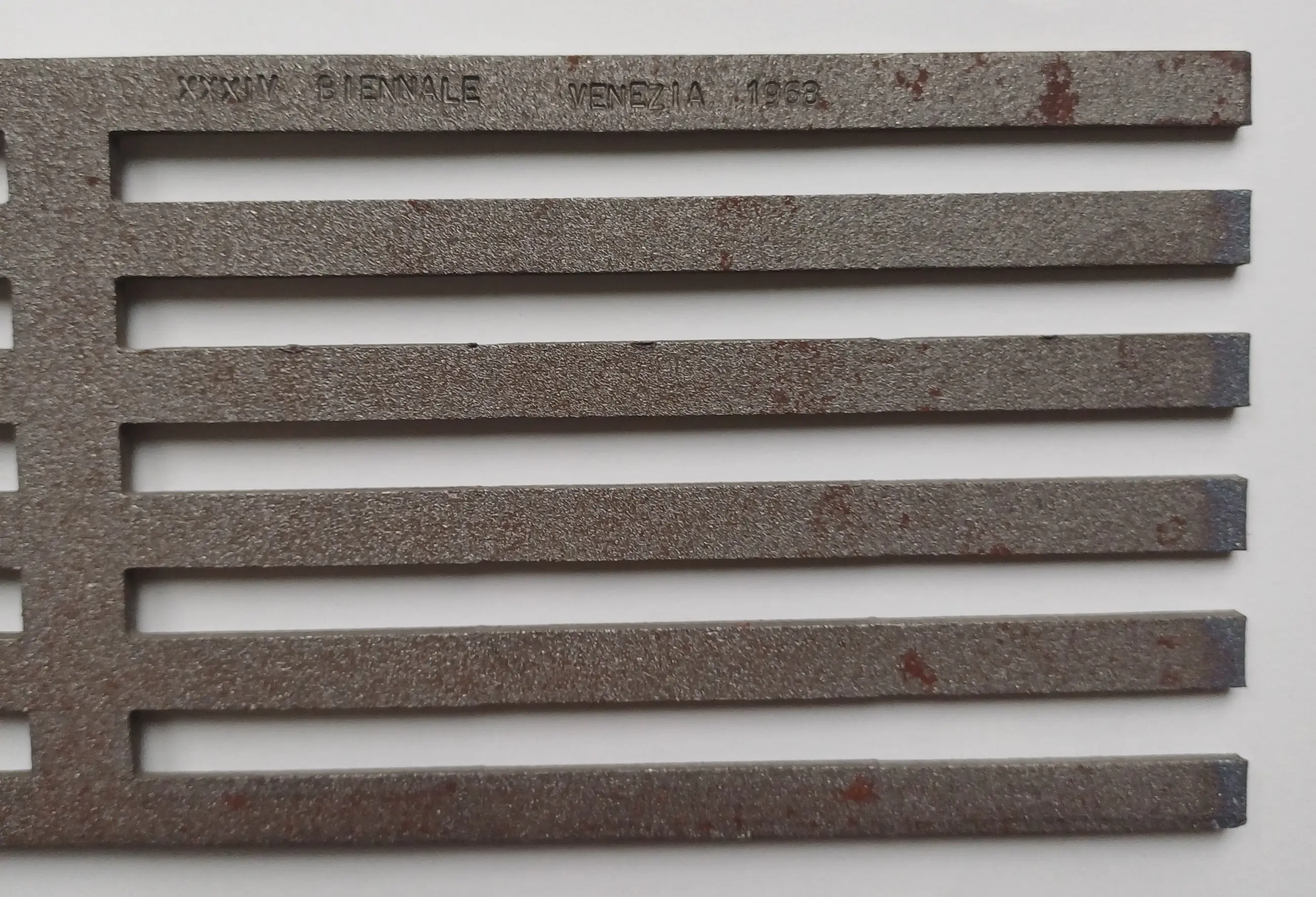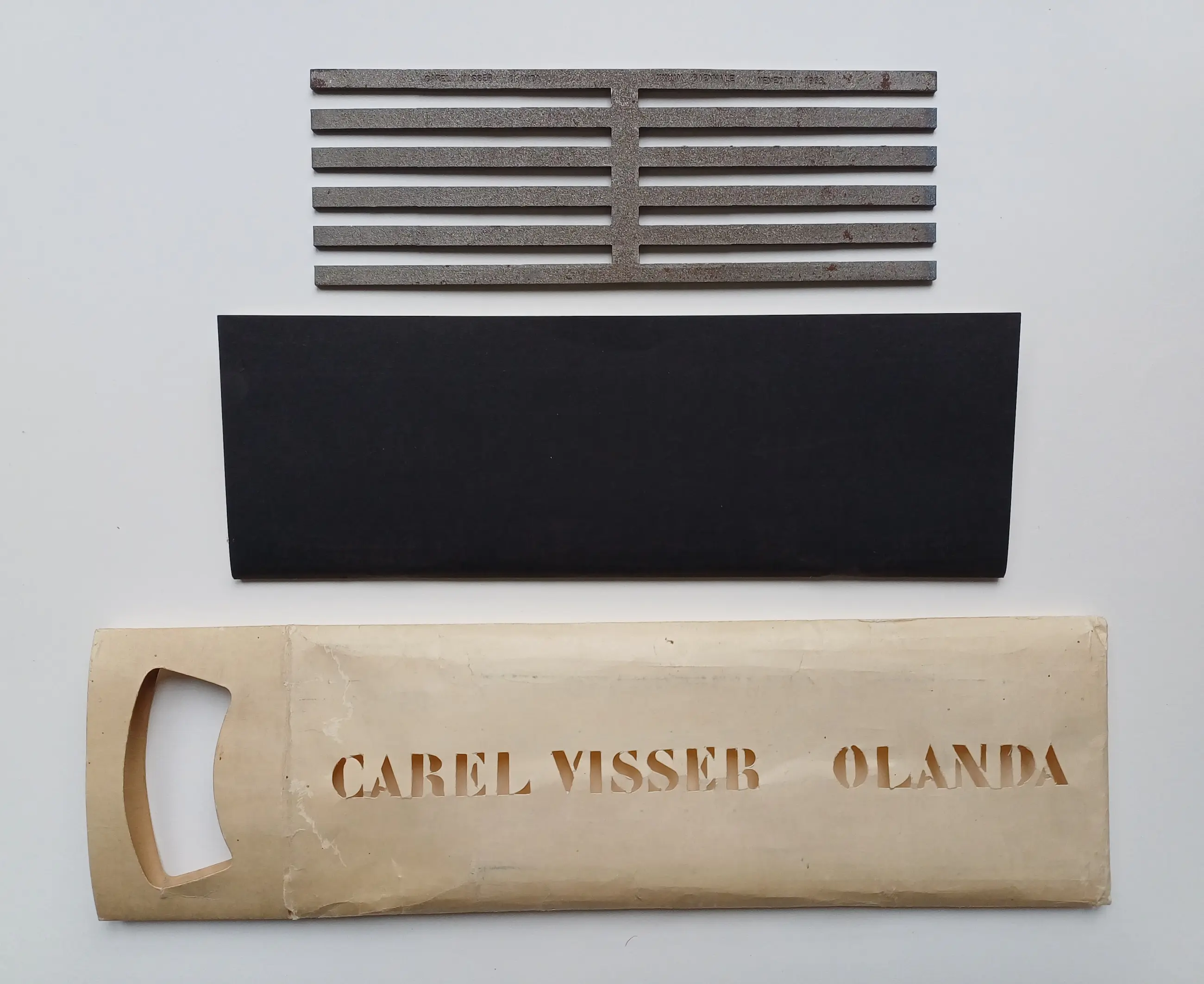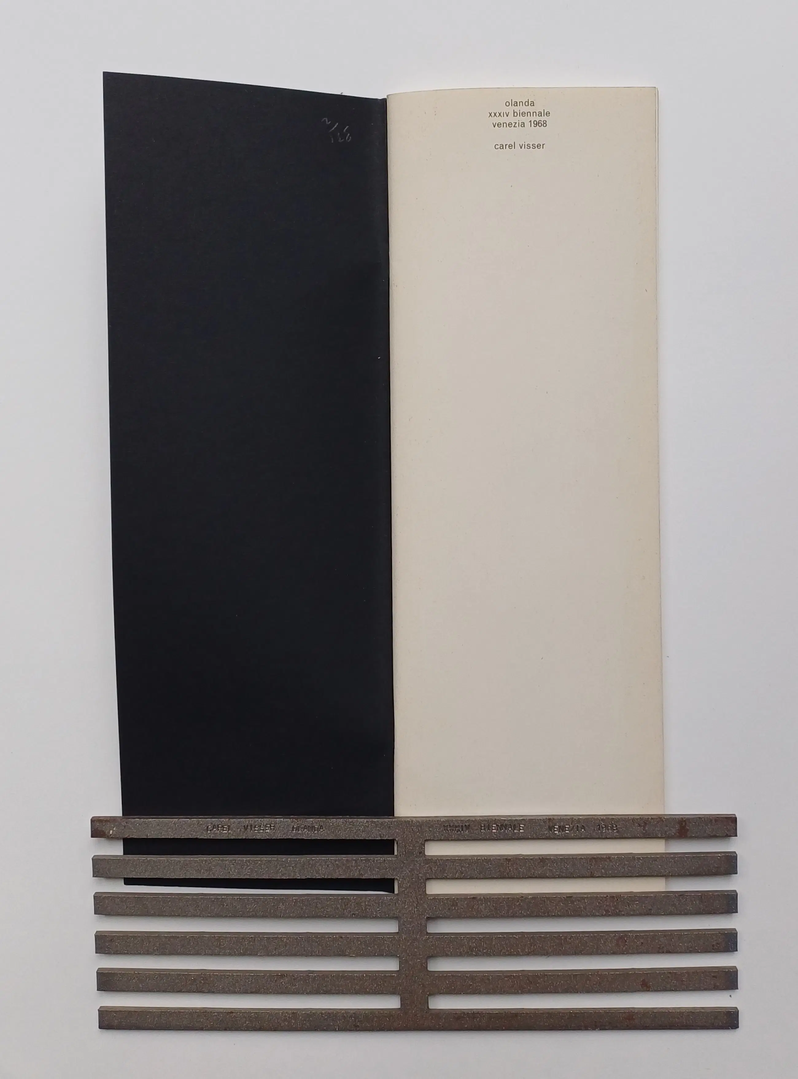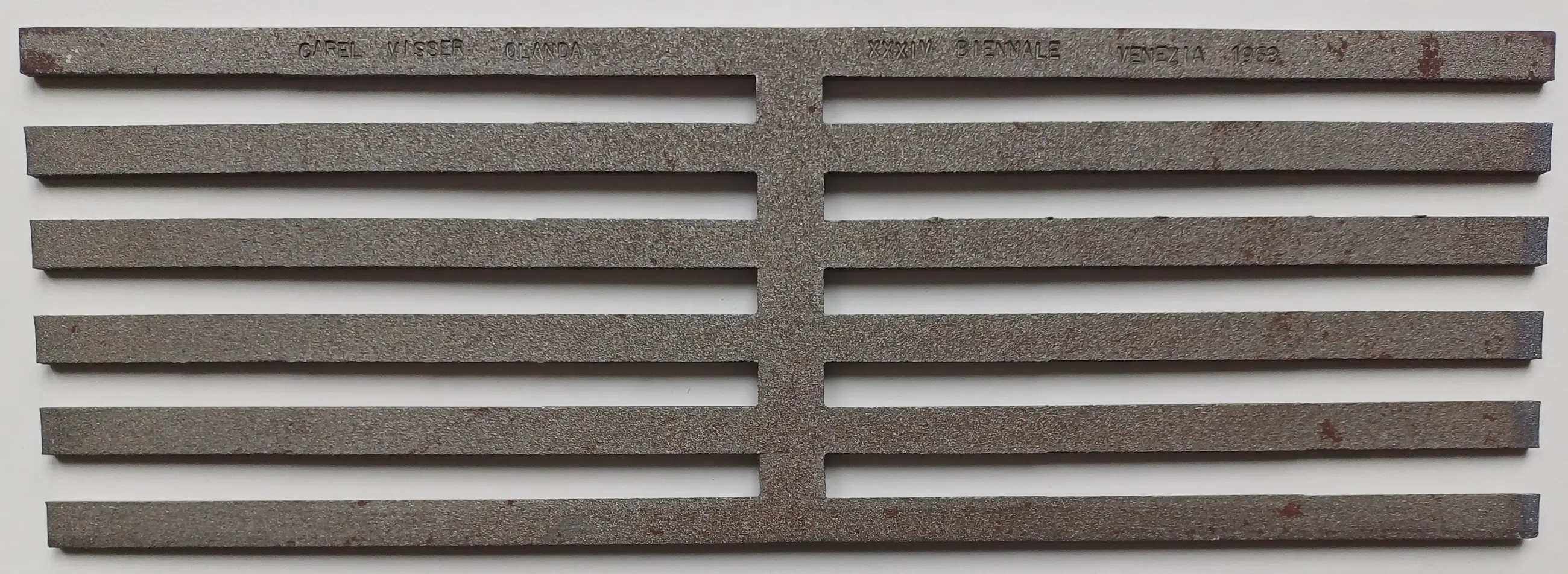 Carel Visser (1928-2015) ijzeren object met ingeslagen tekst "CAREL VISSER OLANDA XXXIV VENEZIA 1968" (lichte oxidatievlekken). Afmeting 8x24x0,3