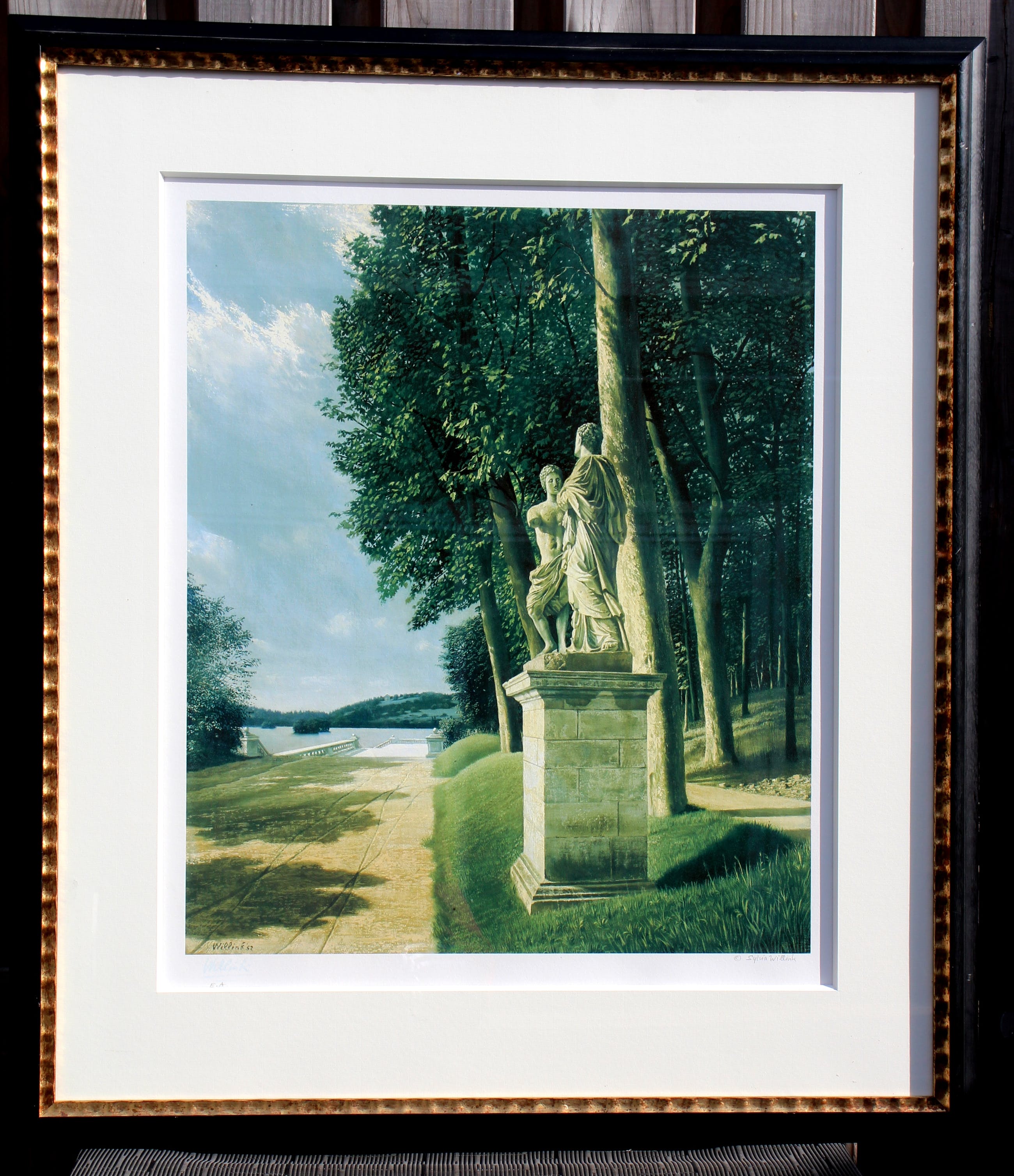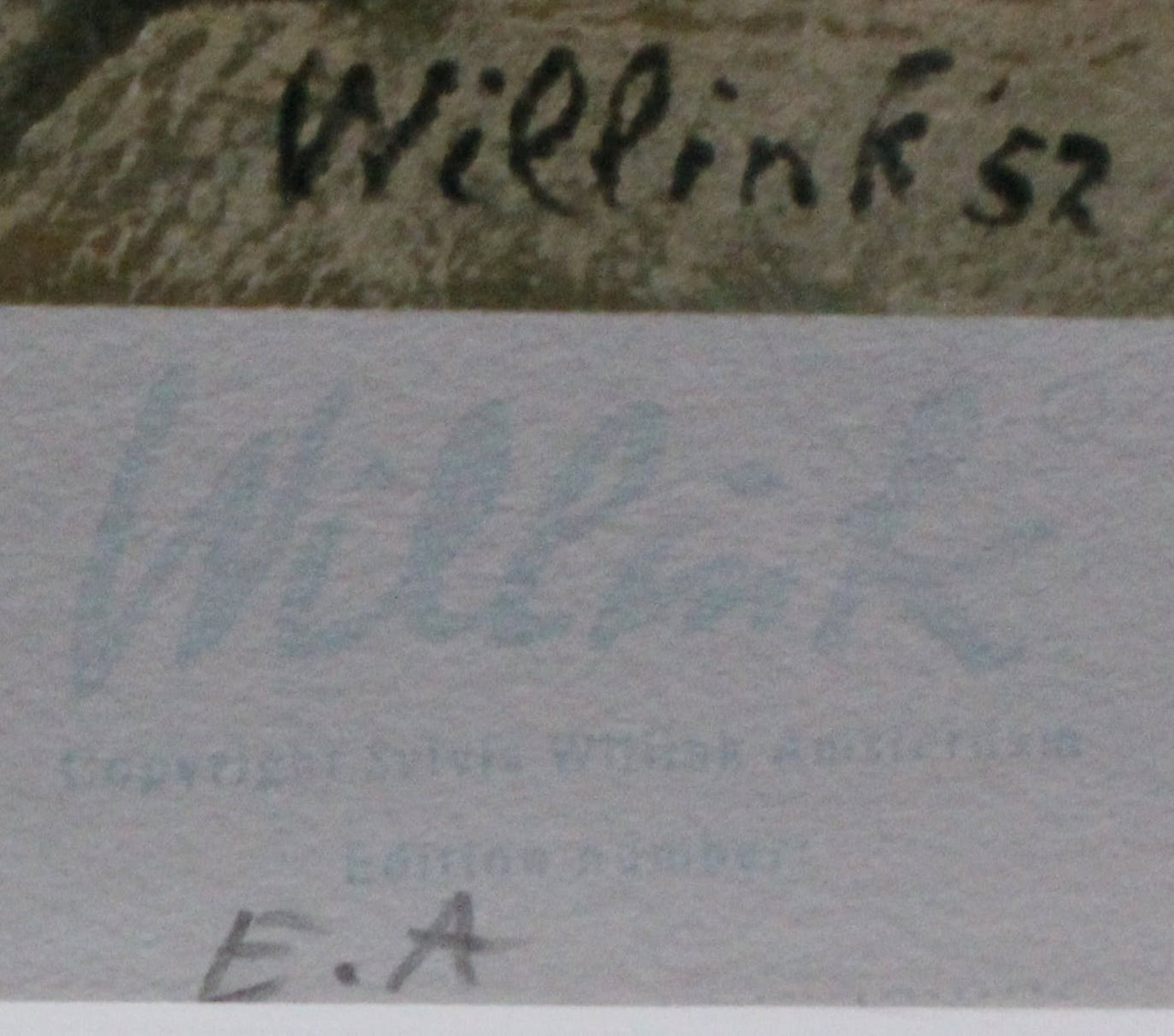 Kleurenlitho van Carel Willink. Titel: Beelden in het park. Jaar: 1952. Oplage: E.A. Afmetingen incl lijst: H110x b97cm. Afmetingen voorstelling: H74 x b62cm. Het werk is rechts onderaan met potlood gesigneerd door Sylvia Willink. Links onderaan, gesigneerd en gedateerd in de druk 'Willink 52' (linksonder) De authenticiteit van het, aangeboden, werk wordt volledig gegarandeerd. Een certificaat van echtheid kan, op aanvraag, worden gemaild.