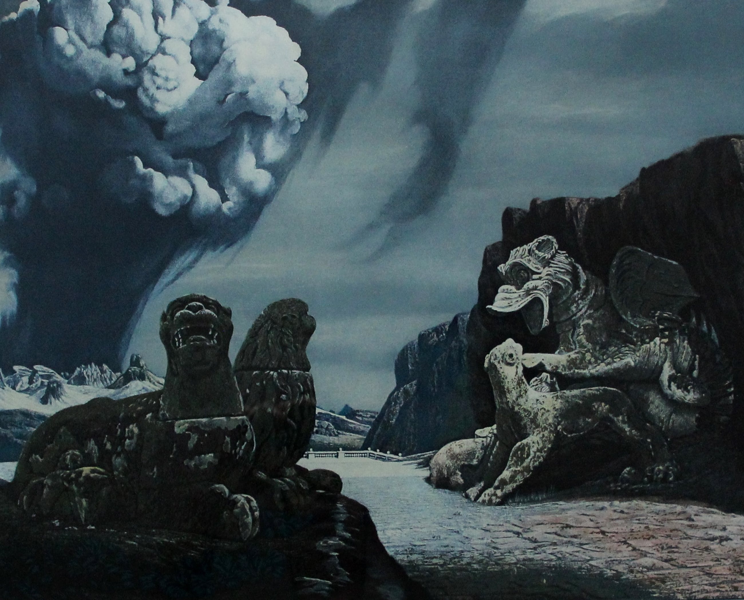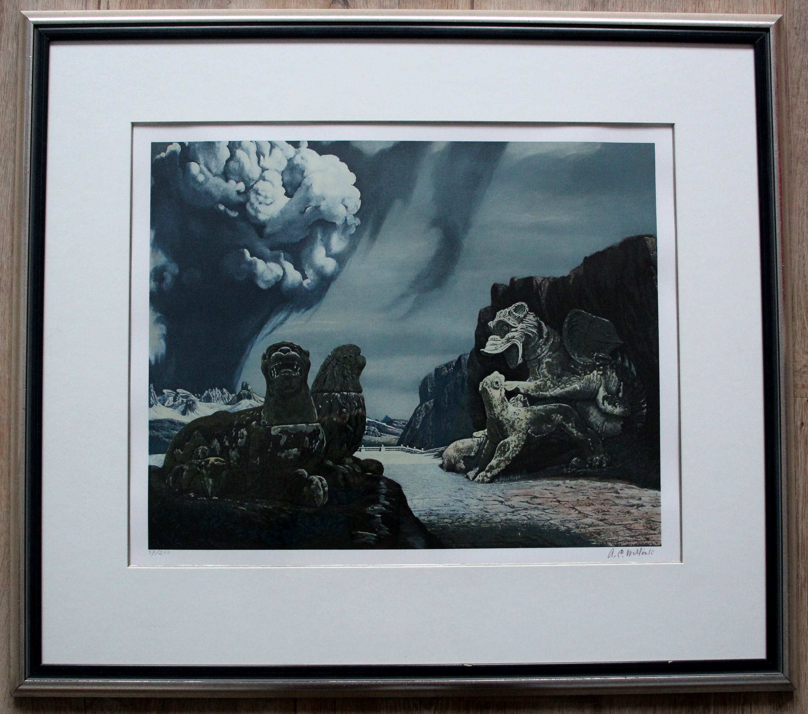 Bekend, iconisch werk van Carel Willink, uitgegeven in 1982 maar gebaseerd op een schilderij uit 1964. Litho op geschept papier, met potlood gesigneerd (door Carel Willink zelf) en genummerd (94/200).