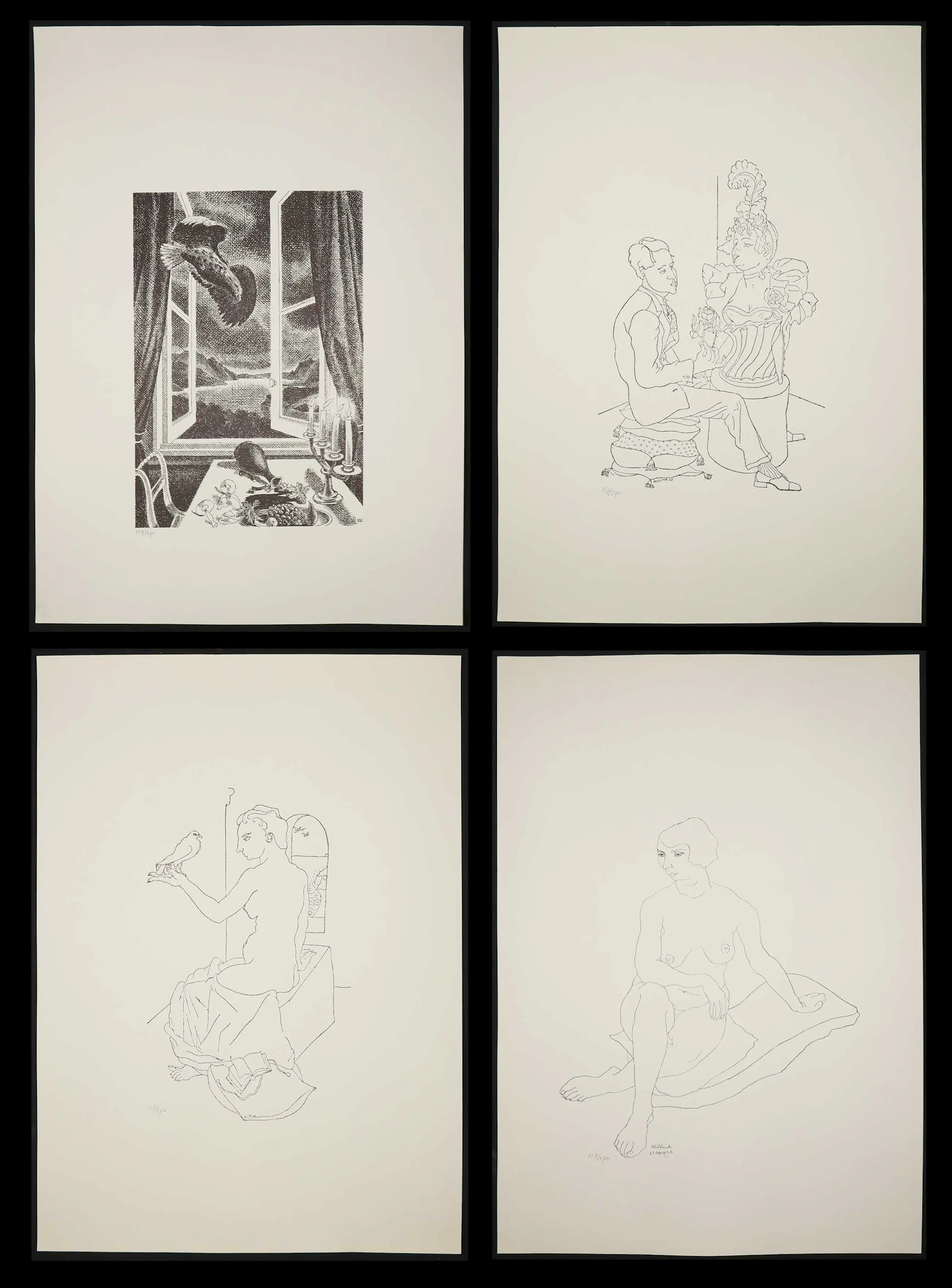 Lot van vier litho's (drukgesigneerd) van Carel Willink. Het betreft drie litho's met figuurvoorstellingen, en één van een stilleven/gezicht op venster.