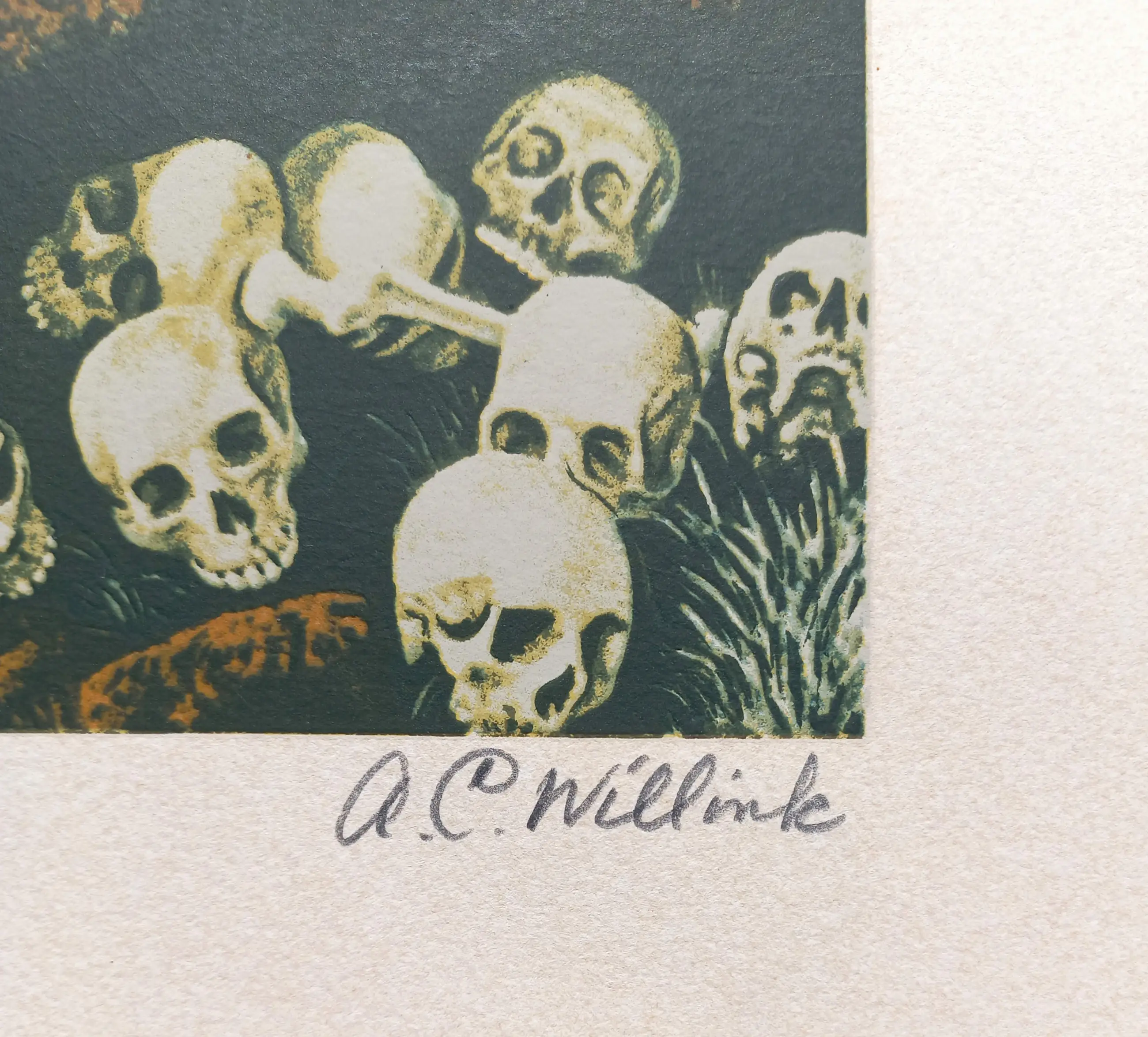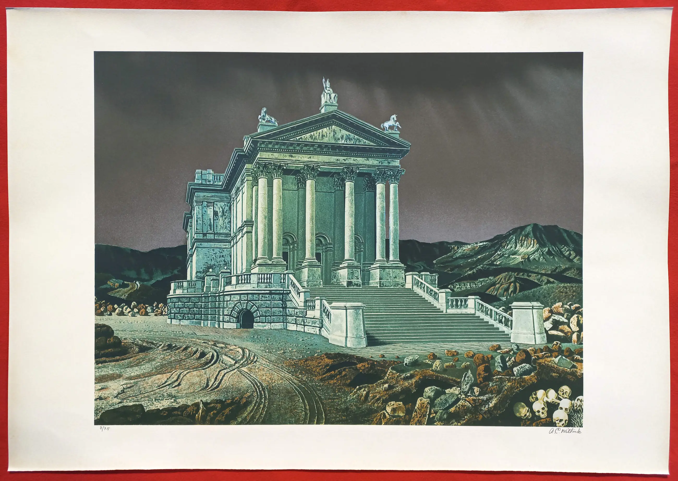 Prachtig, dreigend werk van Carel Willink uit de beroemde G.I.N. portefeuille, naar het gelijknamige olieverf schilderij uit 1970. Zeefdruk op 320 grams Fabriano papier, met potlood gesigneerd door Carel Willink zelf (en niet door zijn weduwe zoals in latere, veel kleinere drukken) en genummerd (9/75), uitgegeven door G.I.N. Gallery Editions in Amsterdam in 1979. In zeer goede conditie.