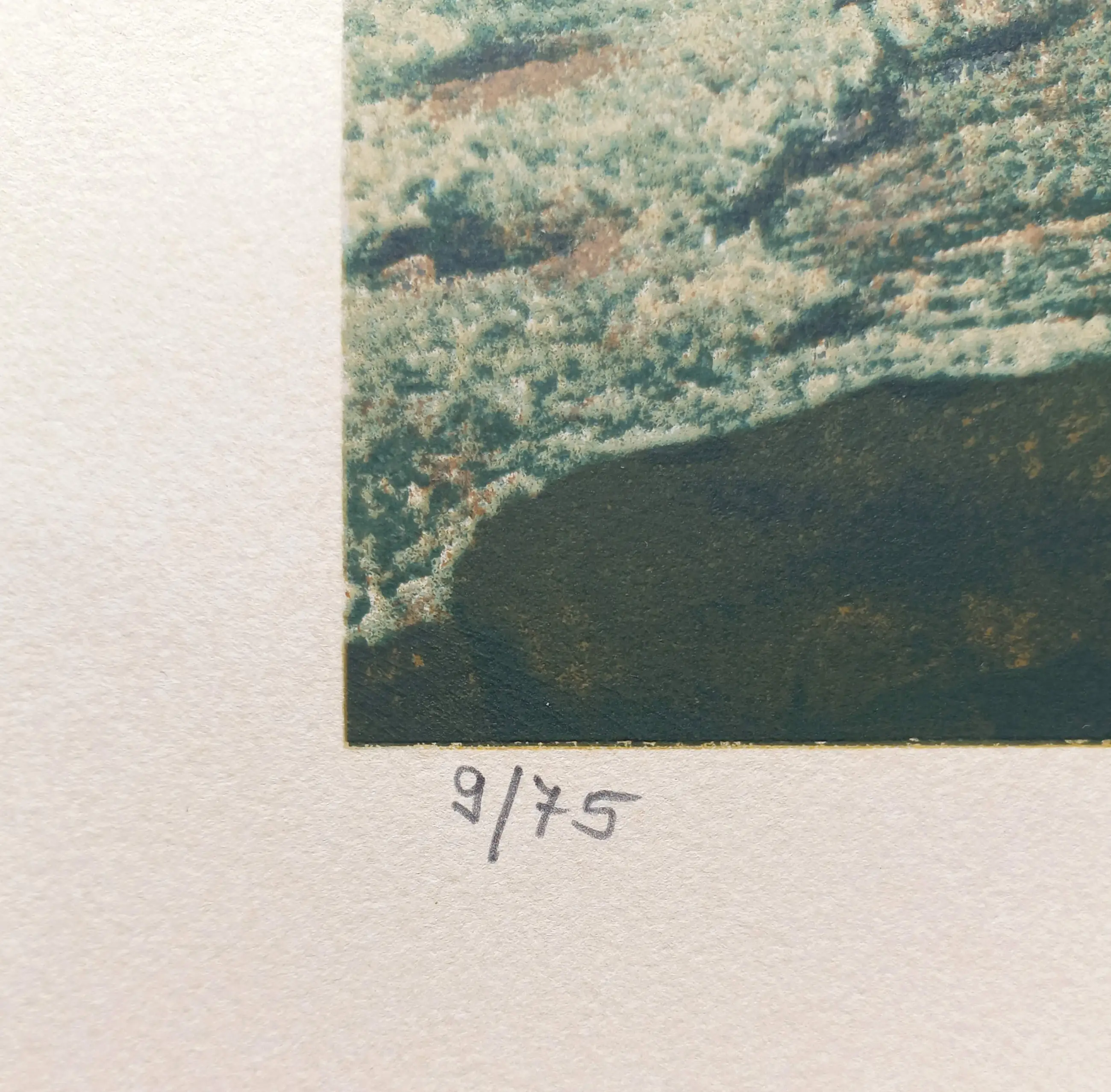 Afmetingen: 100cm x 70cm (blad), 79cm x 57cm (beeld zeefdruk)