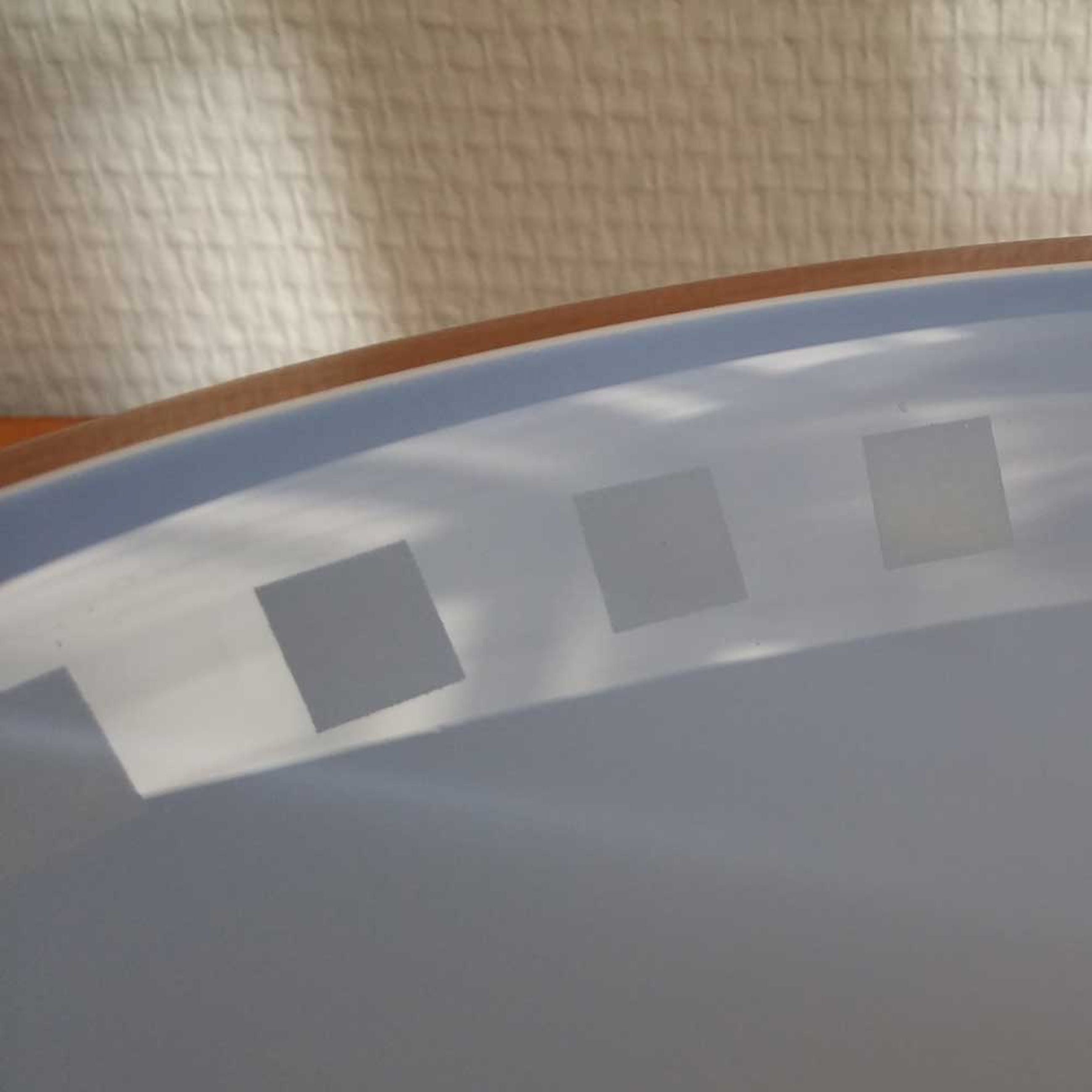 In beperkte oplage en in opdracht gemaakt voor FKG architecten. Buitenkant van de schaal is opaline wit en de binnenkant bevat een licht blauw verloop. Hierin zijn langs de rand kleine vierkantjes uitgespaard.